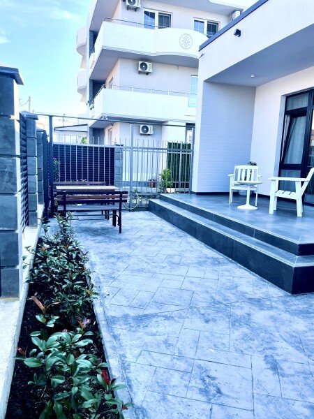 В ванной комнате: Современная сантехника, душевая кабина, туалетные принадлежности, махровые полотенца, фен. Уличная мебель на балконе. Сушилка для белья. Стиральная машинка. В комплексе есть прачечная и место для глажки белья.
