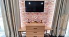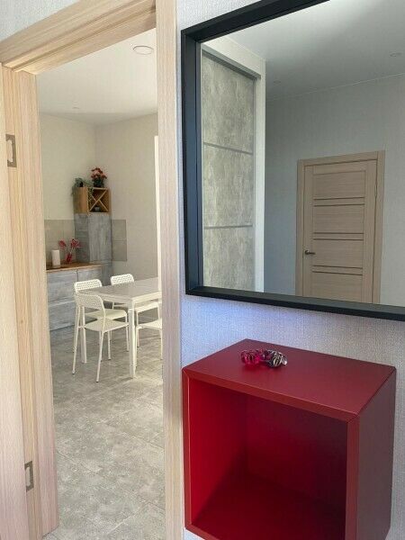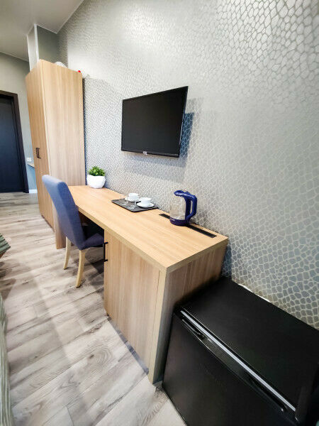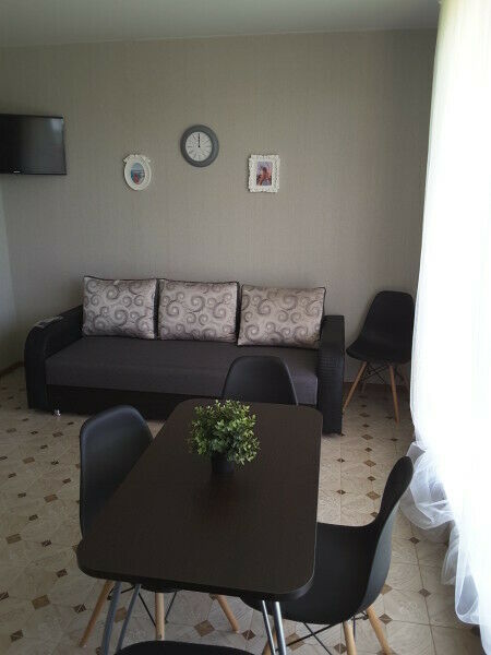 В комнате: двуспальная кровать шириной 1,80х2,0 м с ортопедическим матрасом, удобная софа (полноценное спальное место). Шкаф, письменный стол, стул. Зеркало, прикроватные столики, сплит система. Холодильник, электрочайник, чайный набор. Плазменный телевизор СМАРТ TV, Wi-Fi.