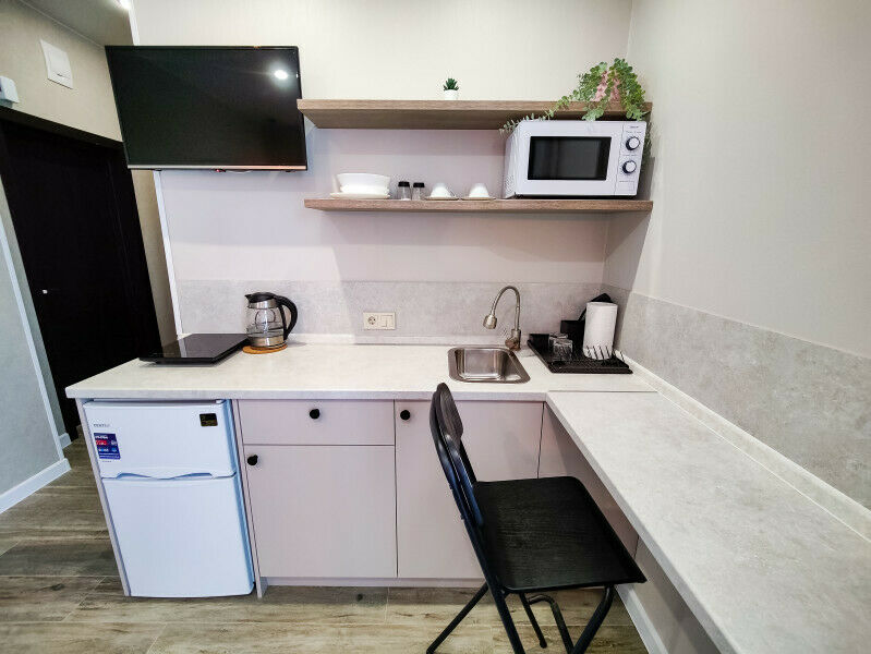 Мини-кухня (на кухне: электрочайник, холодильник, микроволновая печь, набор посуды).