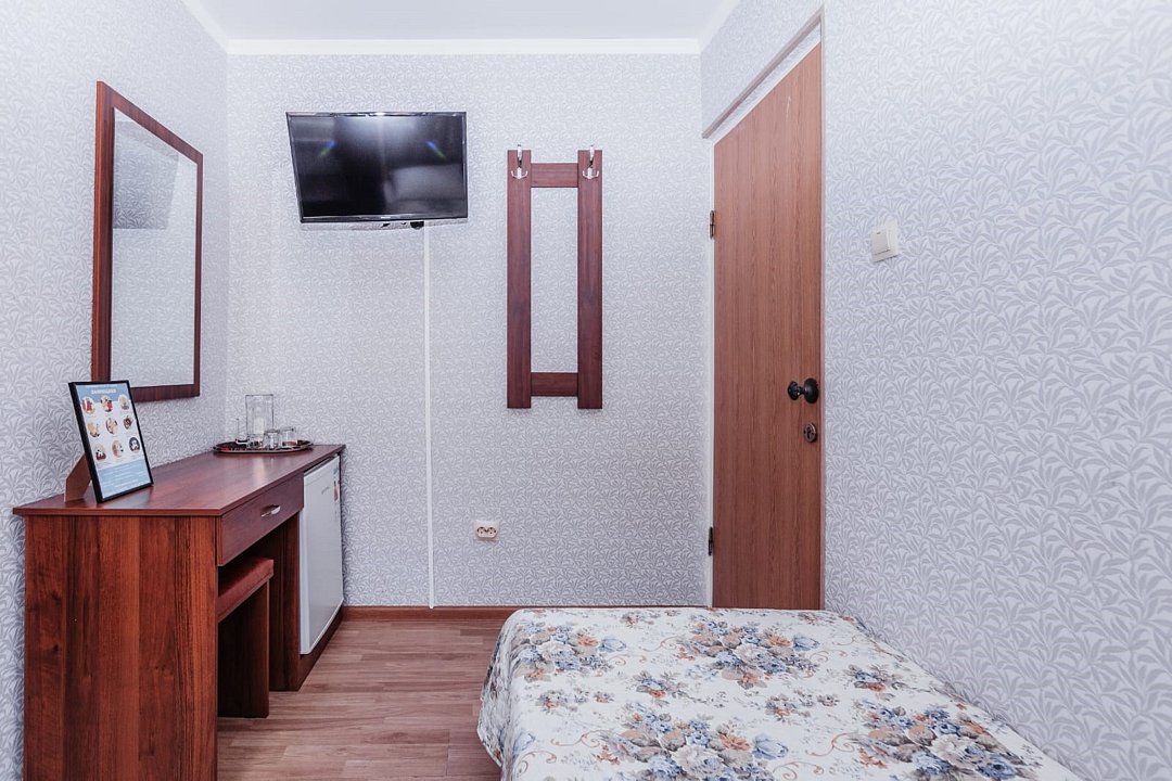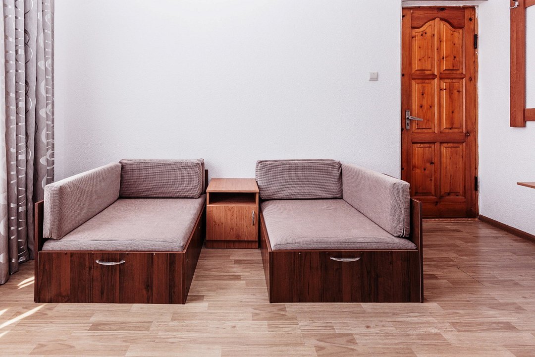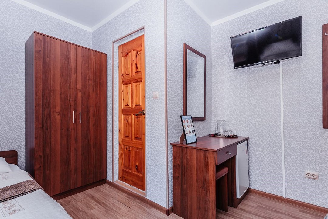 телевизор, Wi-Fi, кондиционер, фен, банные полотенца, две односпальные кровати, шкаф для одежды, журнальный столик, письменный стол, зеркало, унитаз, раковина, душ, вид во двор, ламинат, стул, туалетные средства, мини-холодильник, номер для некурящих, уборка номера, вешалки-плечики, мылоВ гостиничном номере