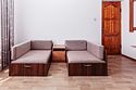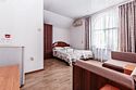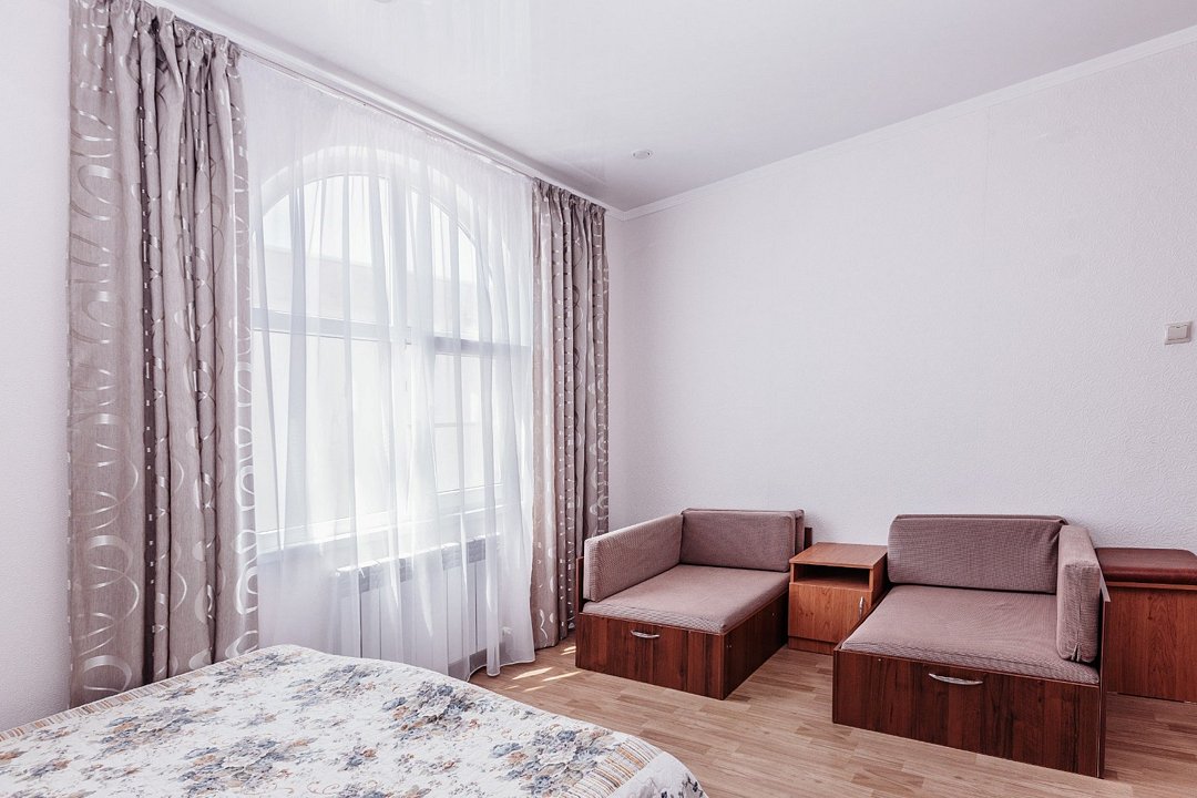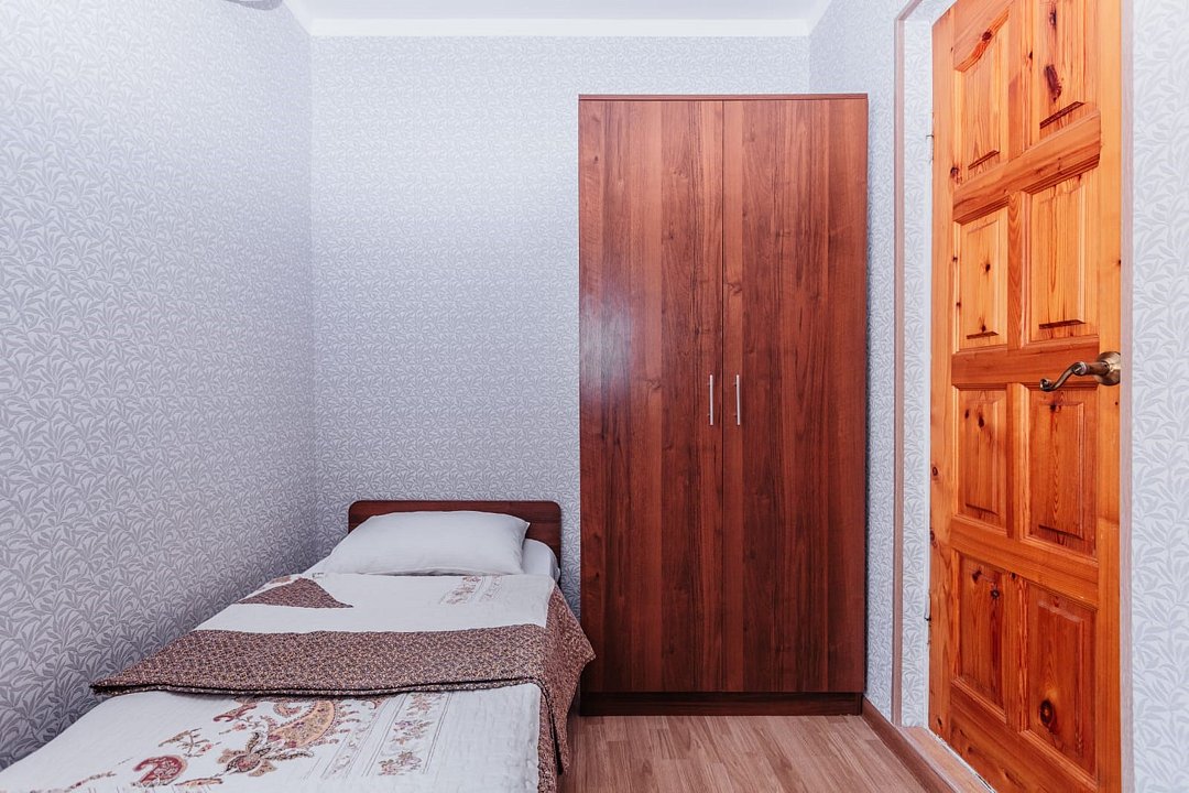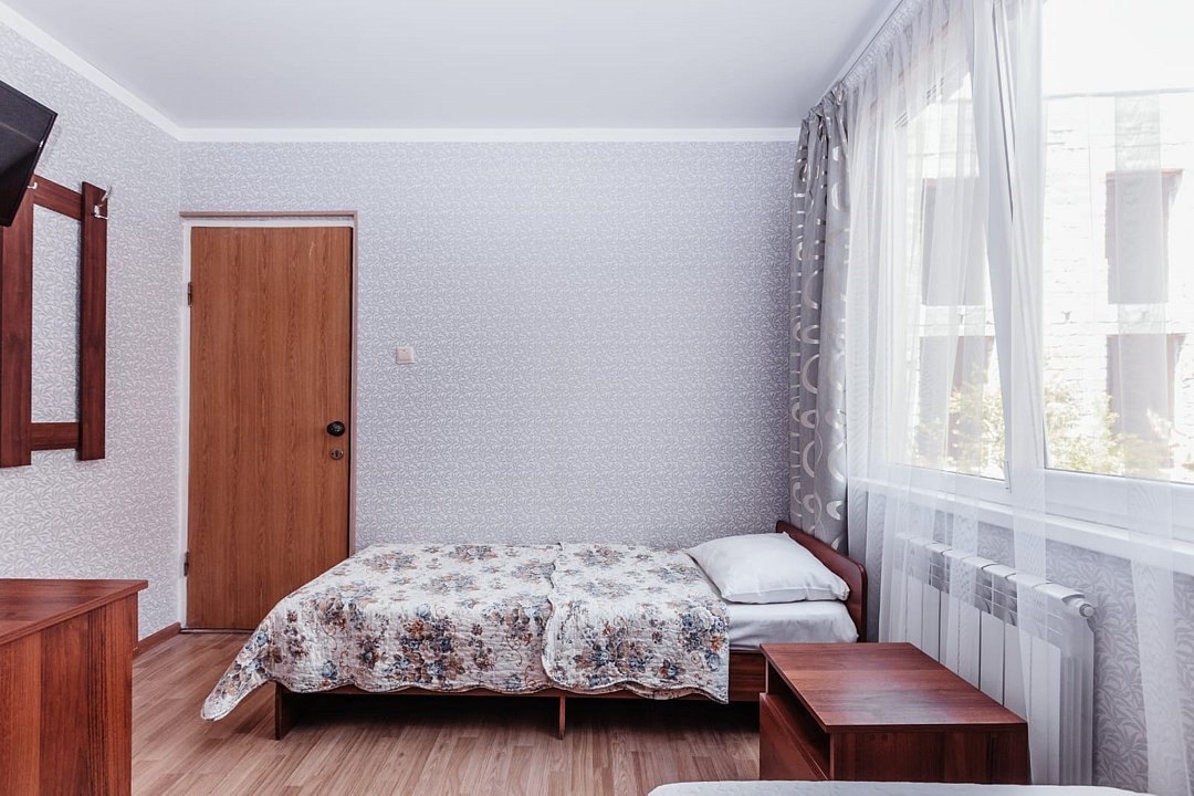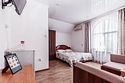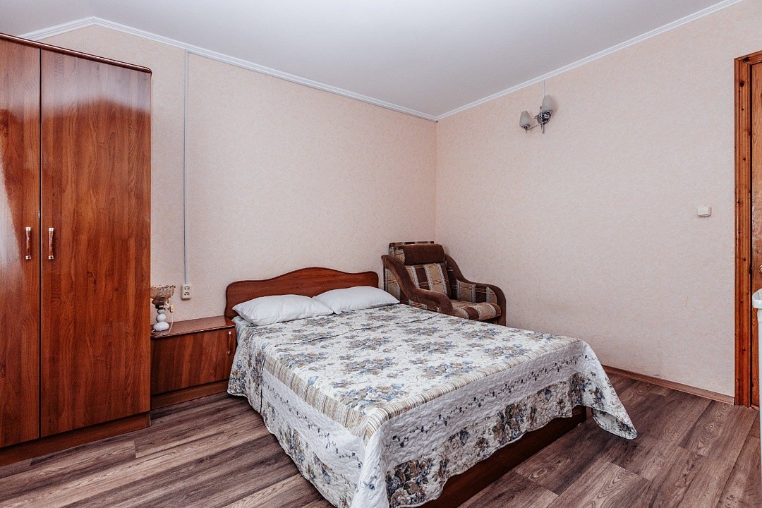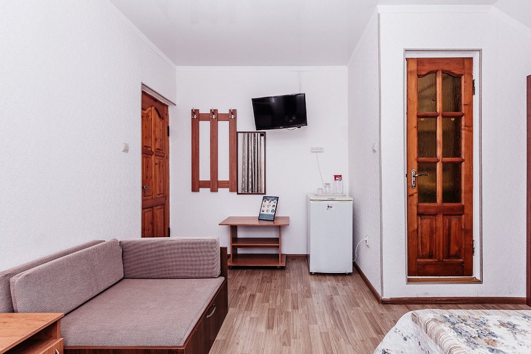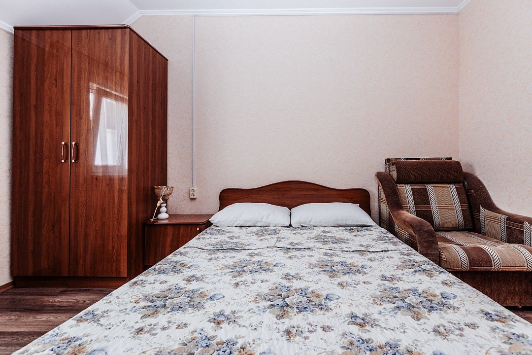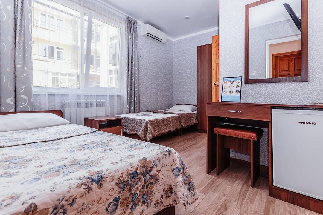 Трехместный номер,с одной двуспальной кроватью и односпальным креслом. Номера находятся на 2 и 3 этаже дома,в каждом номере свой санузел,кондиционер,холодильник,телевизор,фен.Всем проживающим доступен круглосуточный доступ и пользование общими пространствами.Услуги и удобства