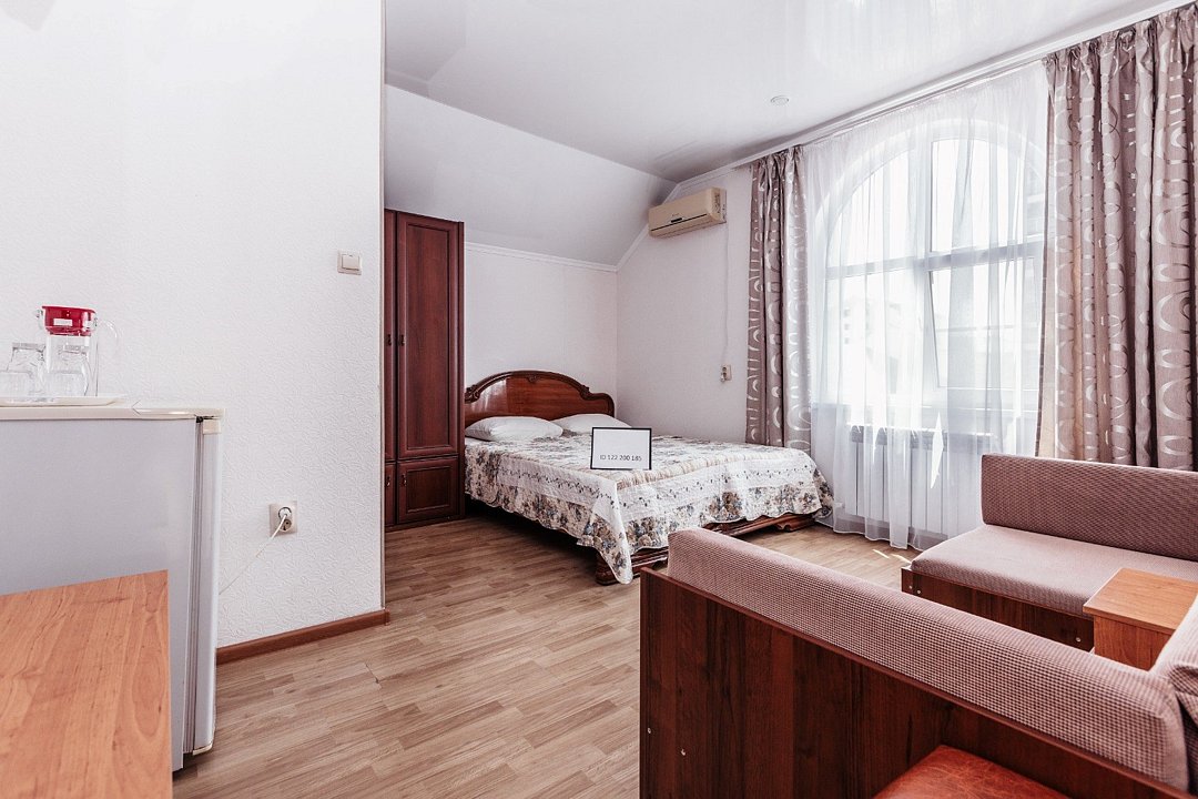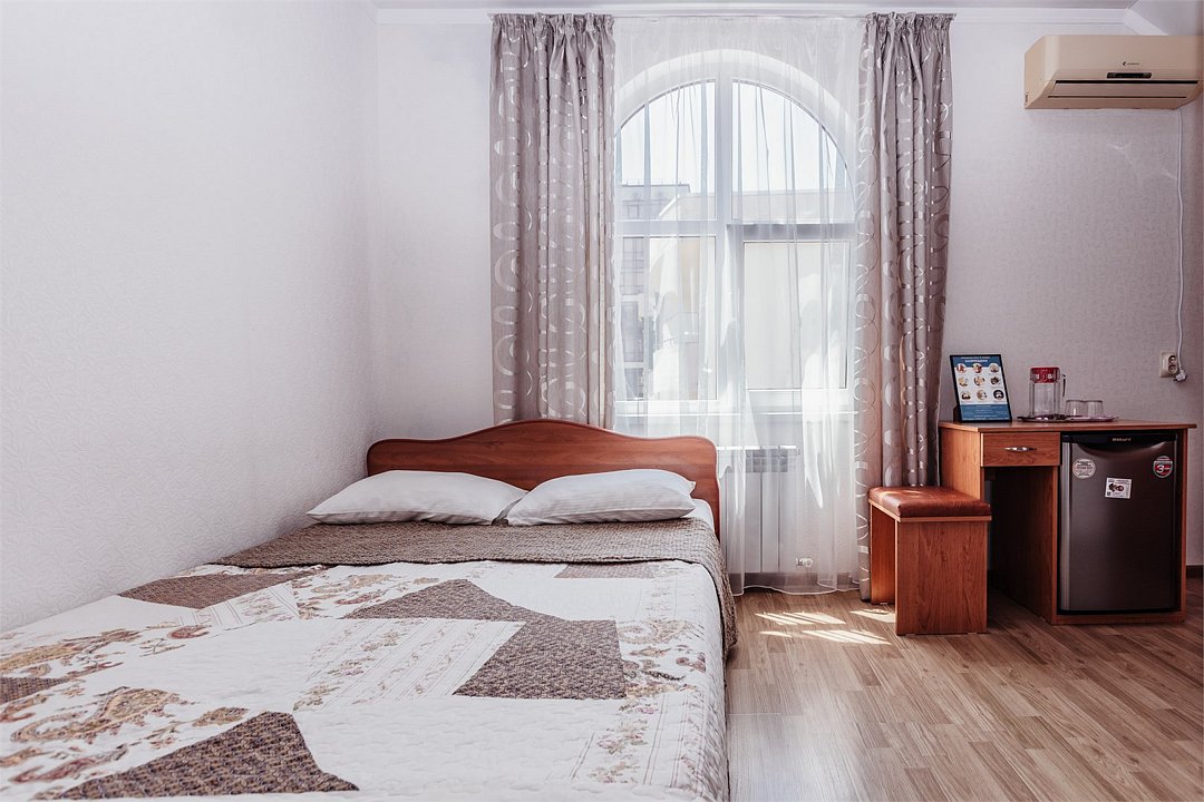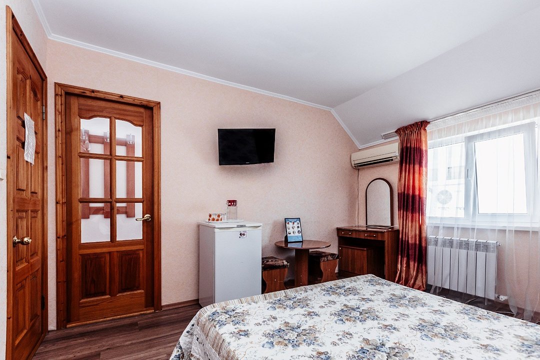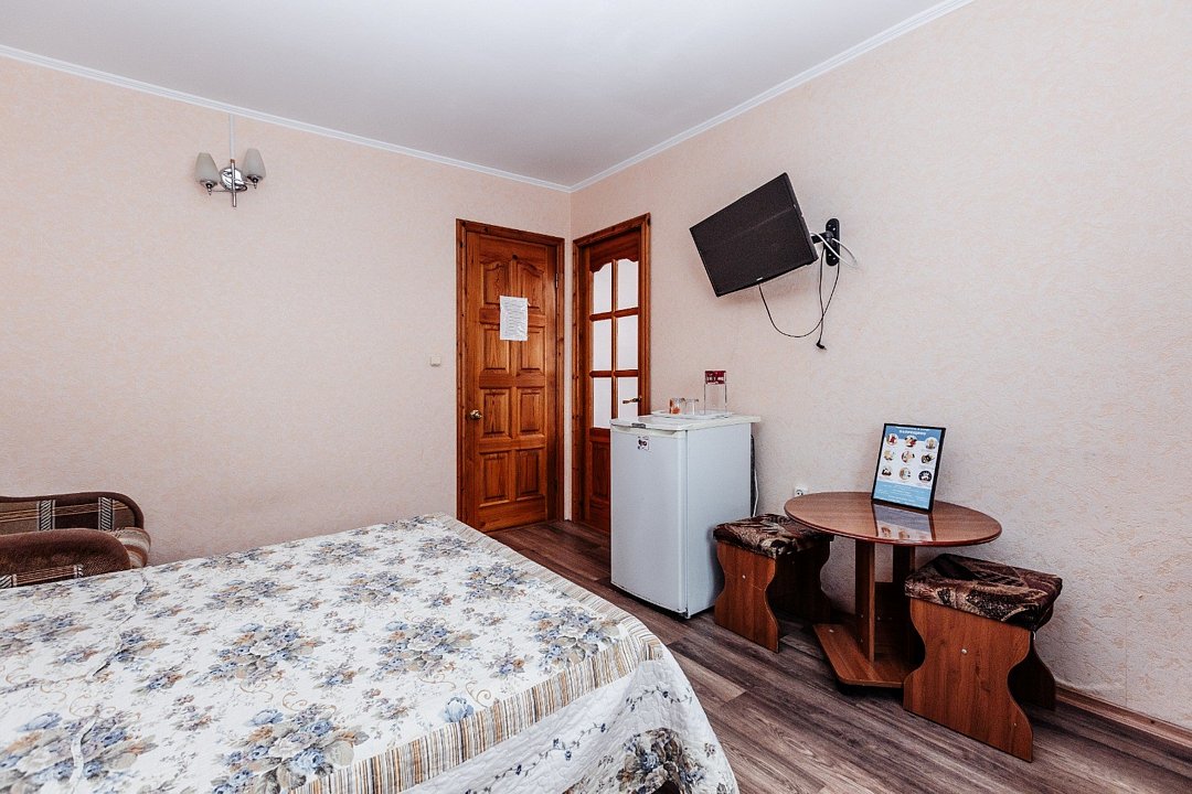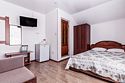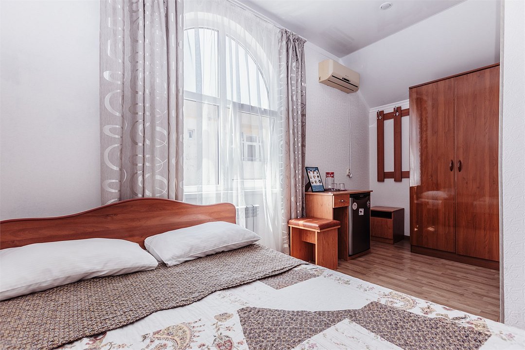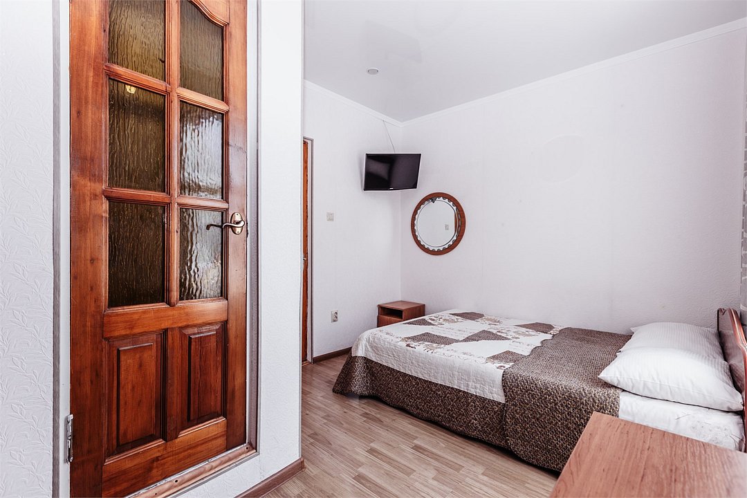 Двухместный номер,с одной кроватью. Номера находятся на 2 и 3 этаже дома,в каждом номере свой санузел,кондиционер,холодильник,телевизор,фен.Всем проживающим доступен круглосуточный доступ и пользование общими пространствами.Услуги и удобства