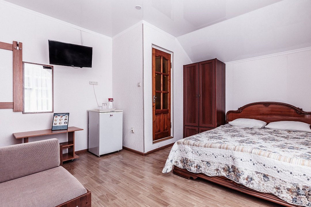 Wi-Fi, холодильник, кондиционер, фен, санузел, двуспальная кровать, тумбы, зеркало, душ, ламинат, туалетные средства, туалет, цифровое тв, телевизор с плоским экраном, номер для некурящих, рабочий стол, уборка номера, вешалки-плечики, частный двор, мылоВ гостиничном номере