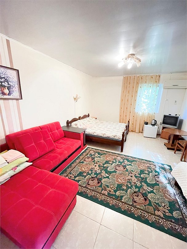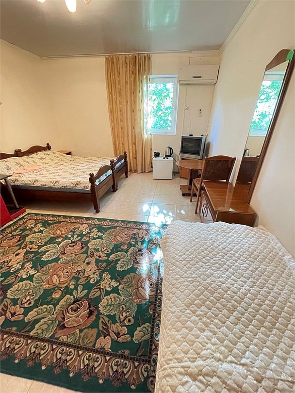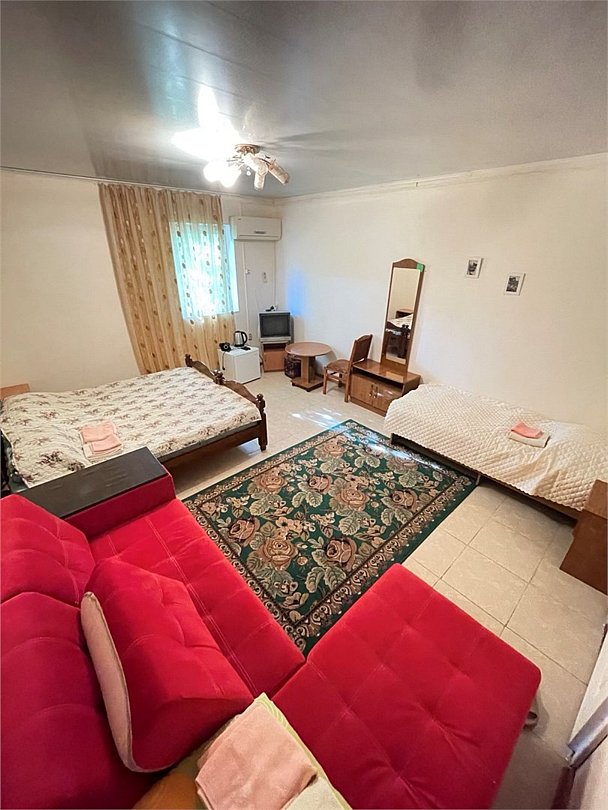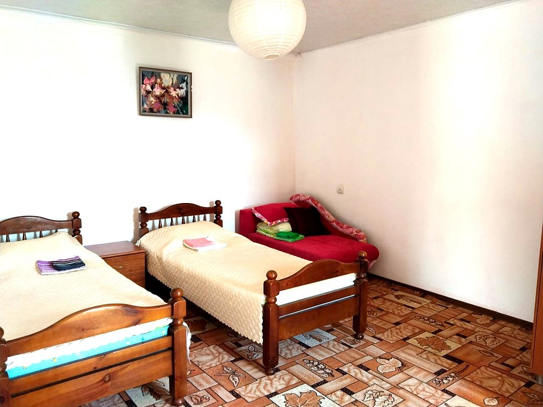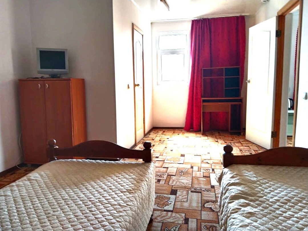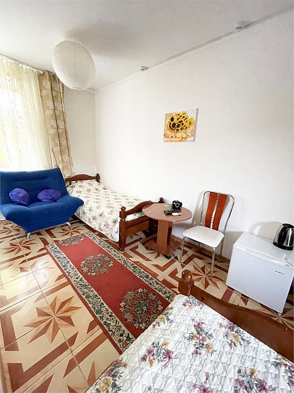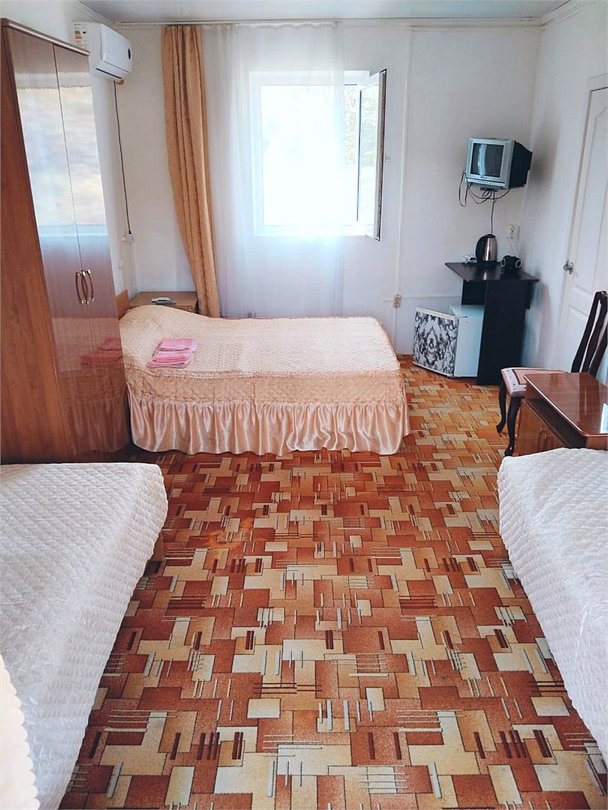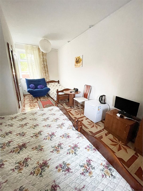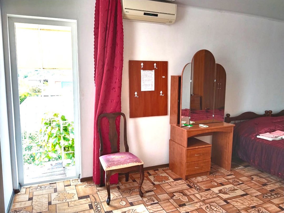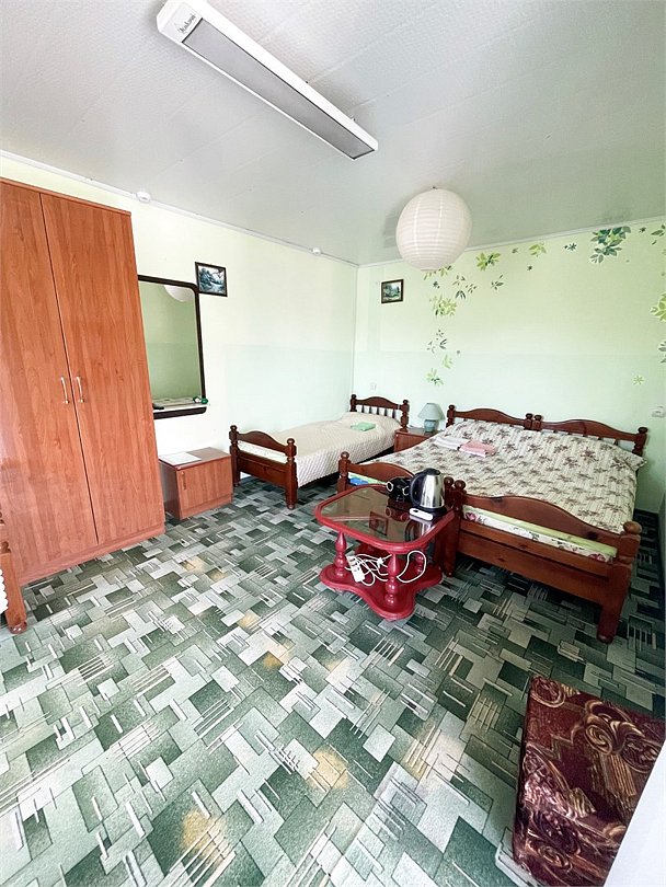 телевизор, Wi-Fi, светильник, душевая кабина, санузел, диван, тумбы, шкаф для одежды, вешалки, журнальный столик, зеркало, ковер, чайник, раковина, вид на сад, плиточное покрытие, три односпальные кровати, стул, туалетный столик, туалет, сплит-система, мангал, сушилка для белья, мини-холодильник, москитная сетка, пуфик, общественный бассейн, двуспальный раскладной диван-кровать, уборка номера, вешалки-плечики, мыло, можно с питомцамиВ гостиничном номере