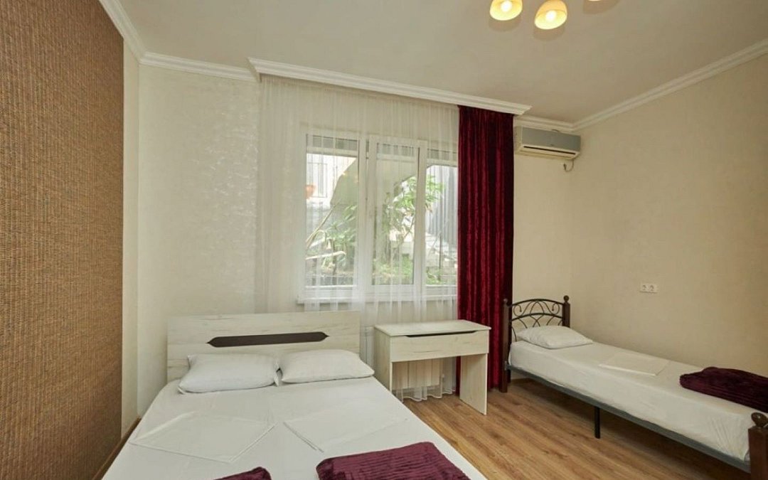 Красивые и уютные номера гостевого дома оснащены удобной мебелью, кондиционером, телевизором, холодильником. В части номеров есть балконы.