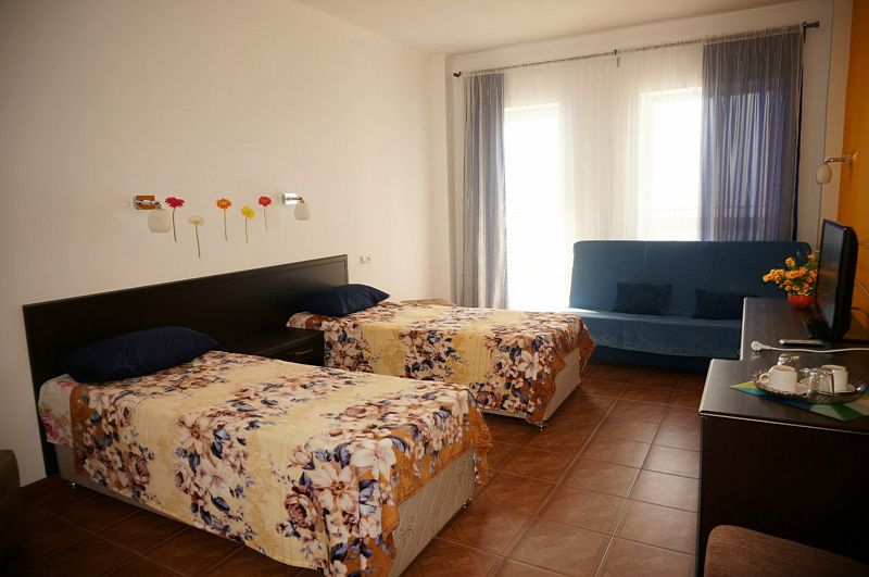 Общая площадь номера составляет примерно 35 кв.м. Однокомнатные номера укомплектованы двумя кроватями 80*200 (возможно сдвинуть вместе) и раскладывающимся диваном (спальное место 1.40*200).