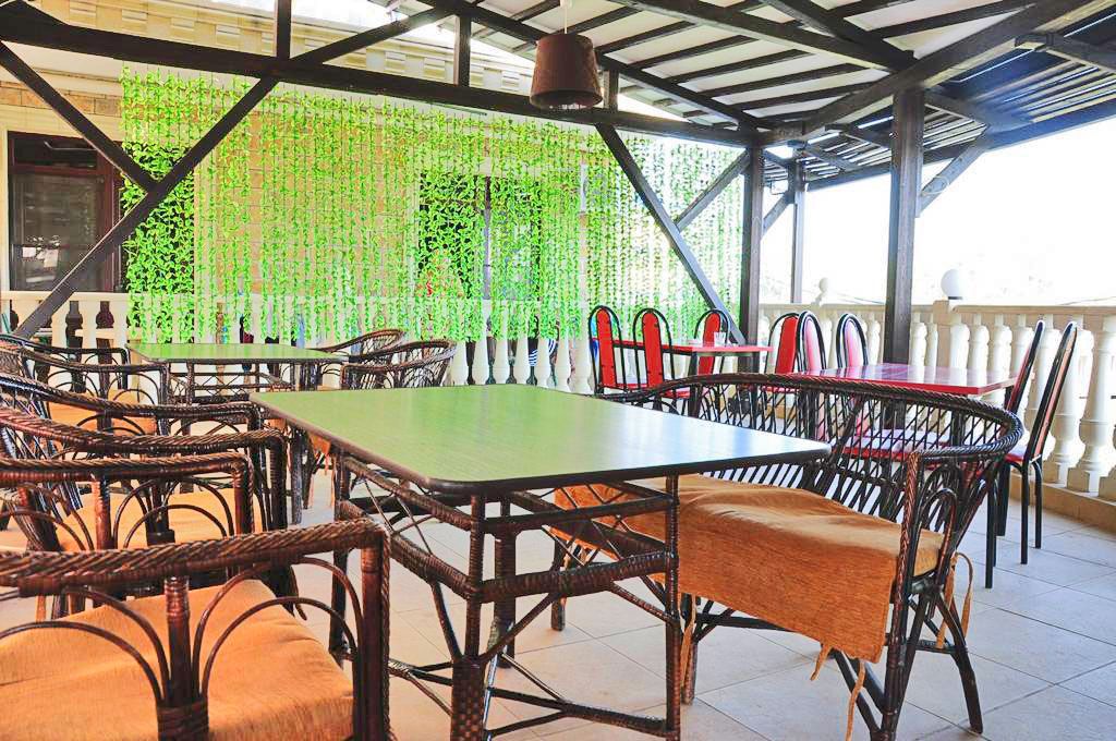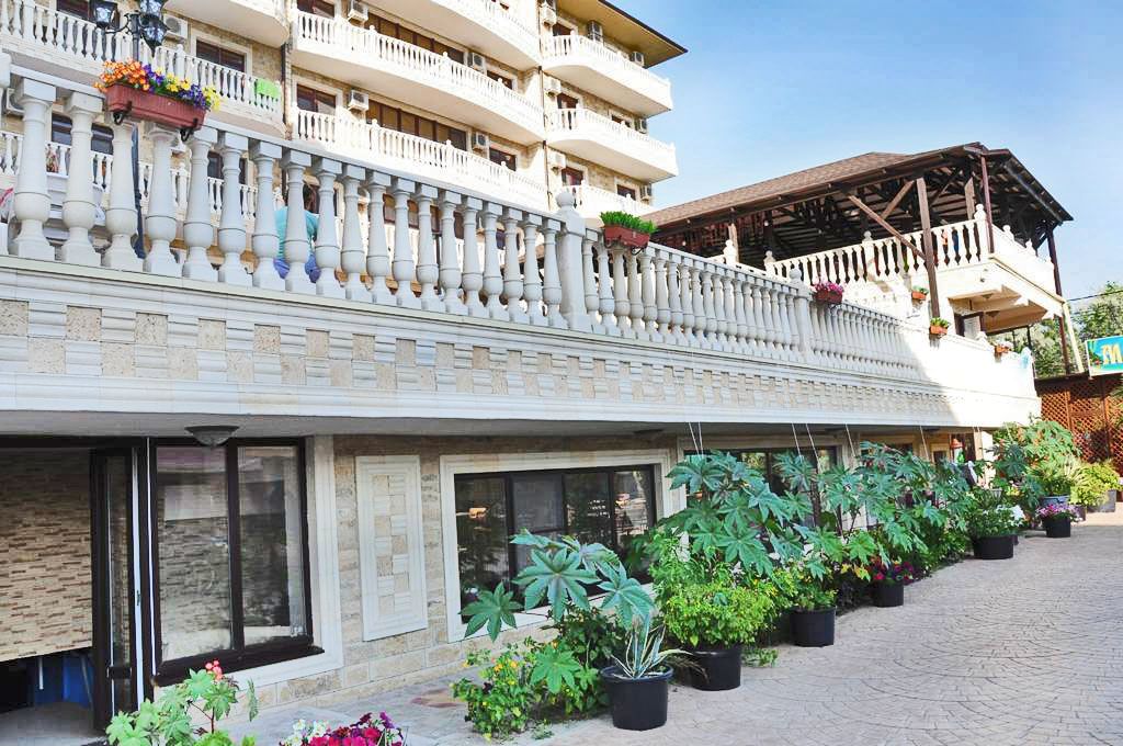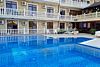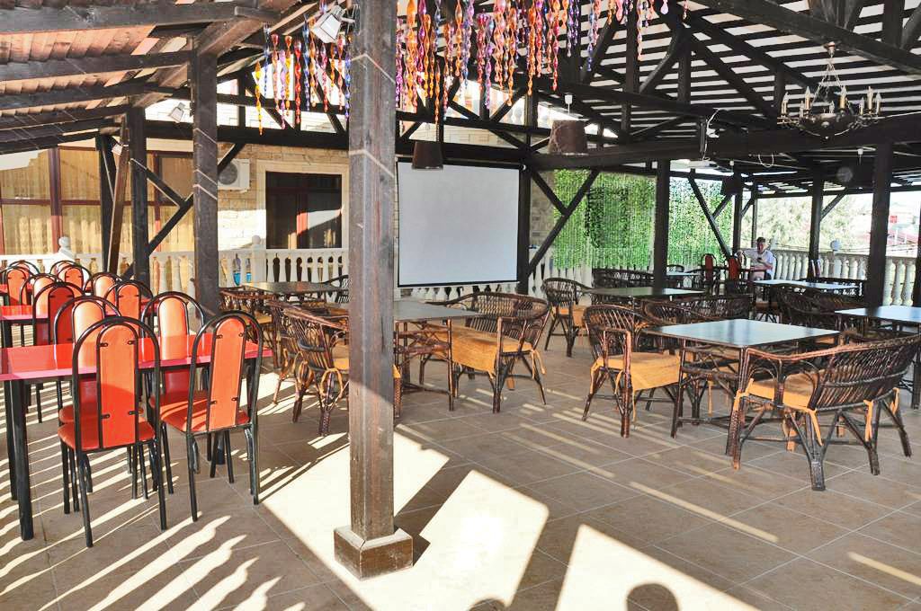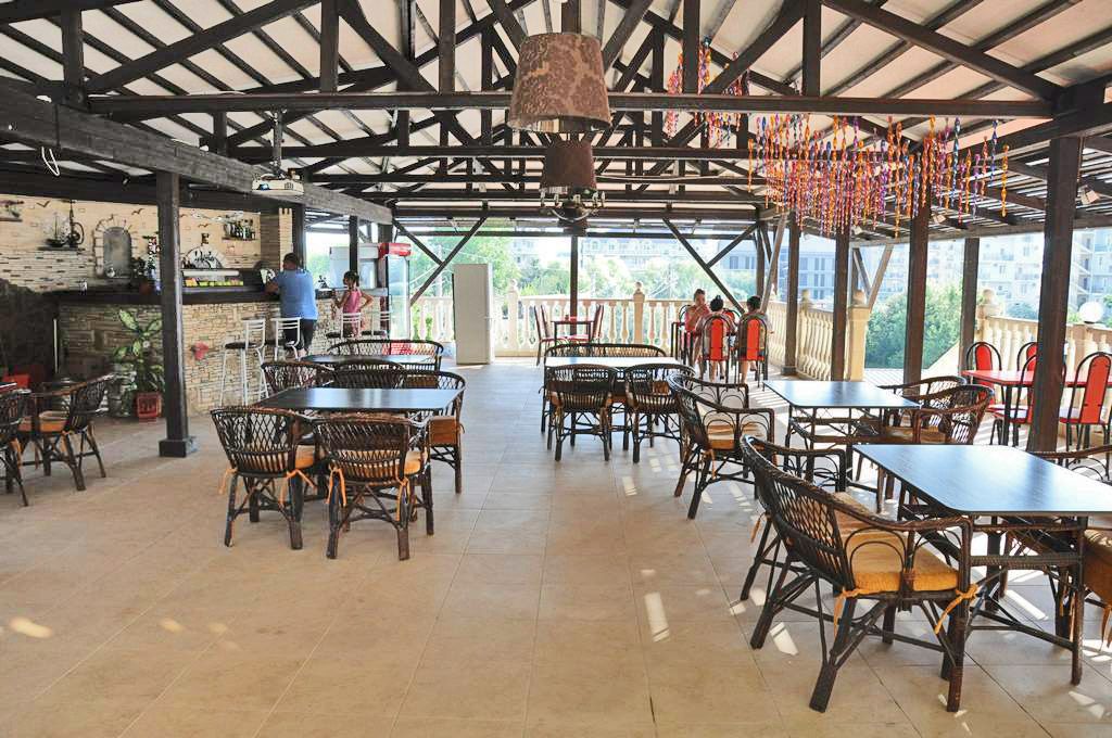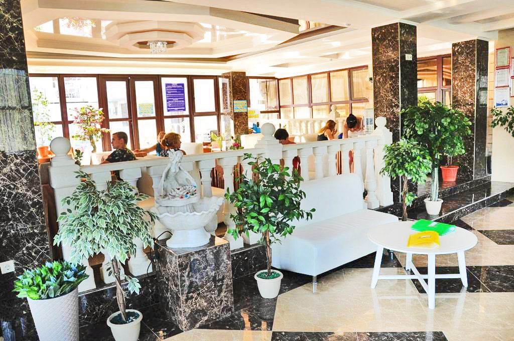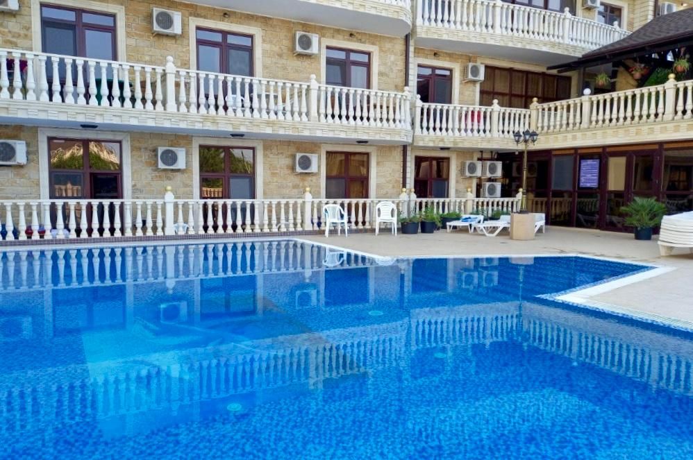На территории есть просторный бассейн с подогревом и с детским отделением, где можно быстро освежиться в жаркий день, зона отдыха, игровая площадка. Веселые и доброжелательные аниматоры не дадут скучать ни Вам, ни вашим детям. Оказывается необходимый набор услуг: питание по системе «Все включено» в столовой на первом этаже, трансфер, заказ экскурсий, услуги прачечной.