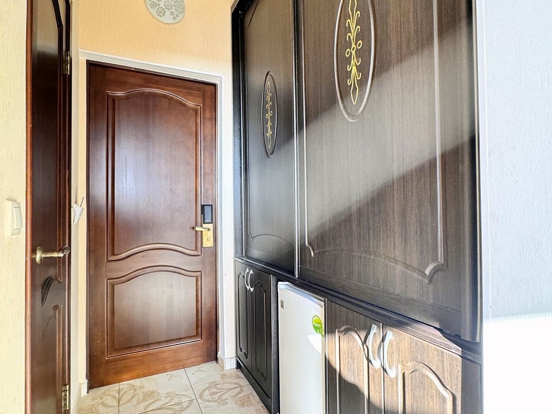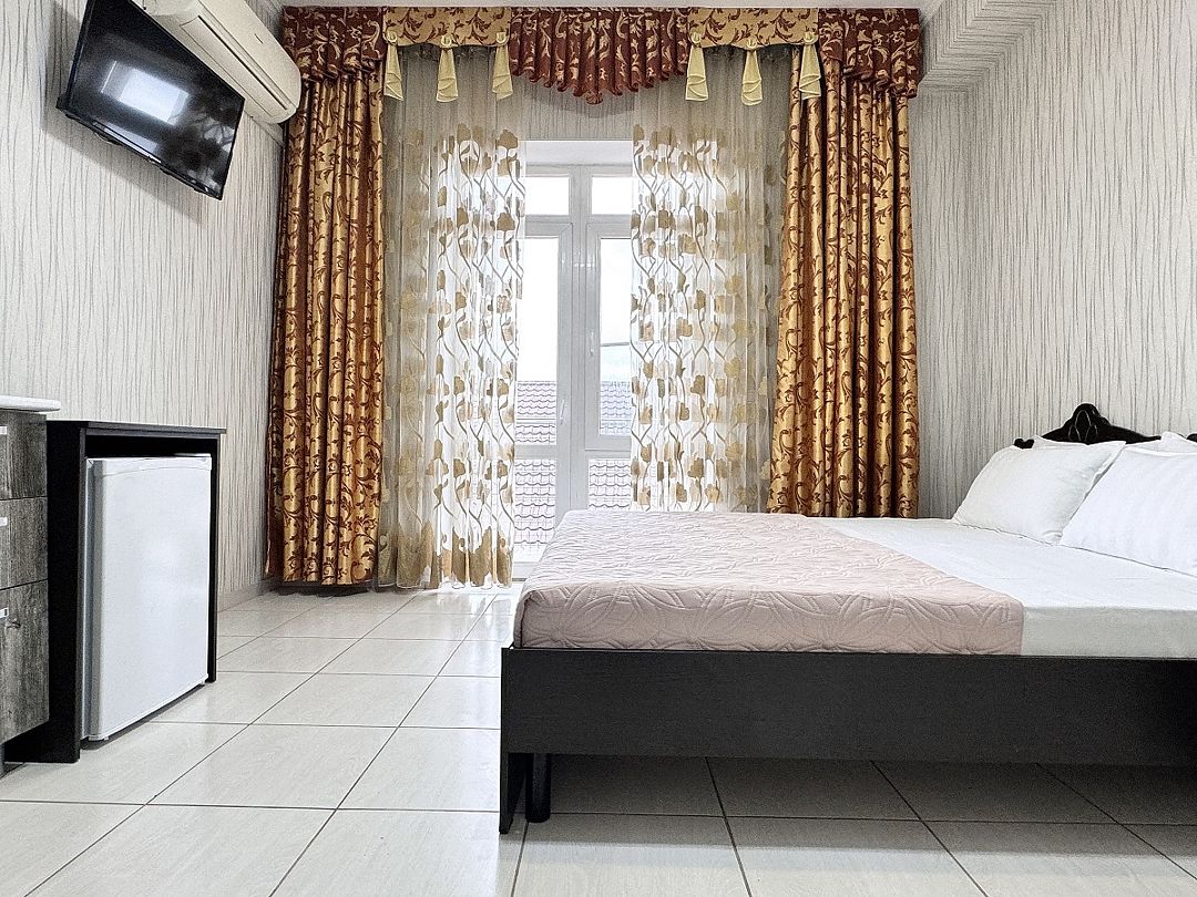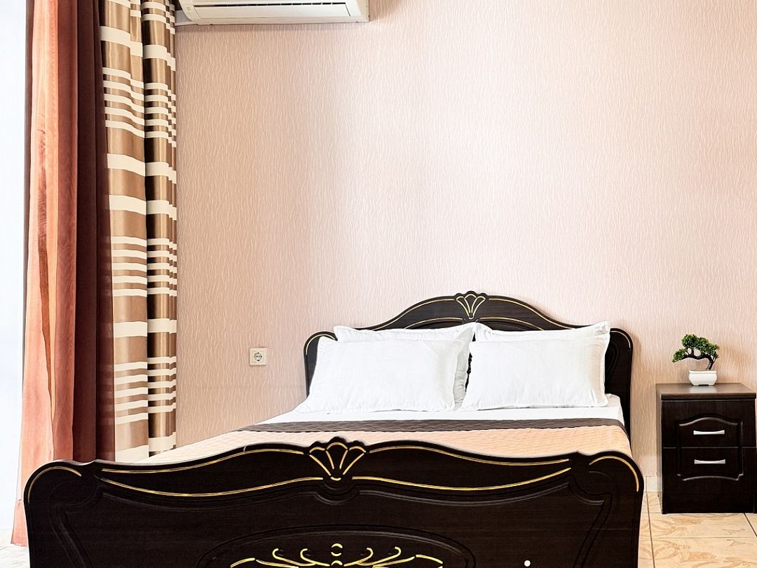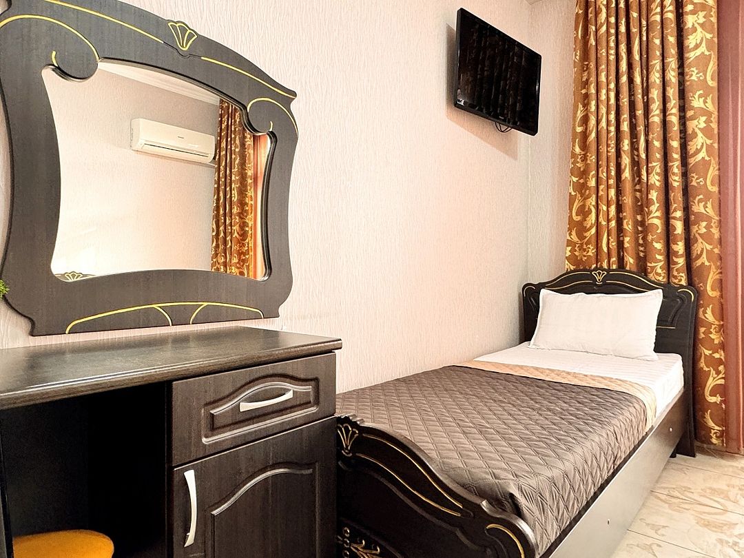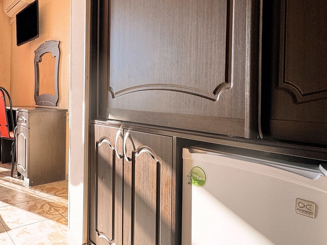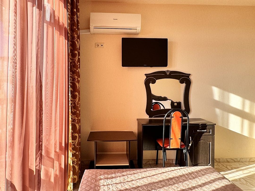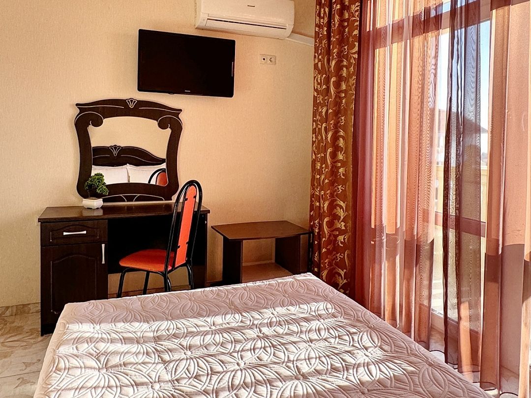 Номер оснащен: двуспальная кровать (140*200), прикроватная тумбочка, шкаф, тв, кондиционер, мини-холодильник.