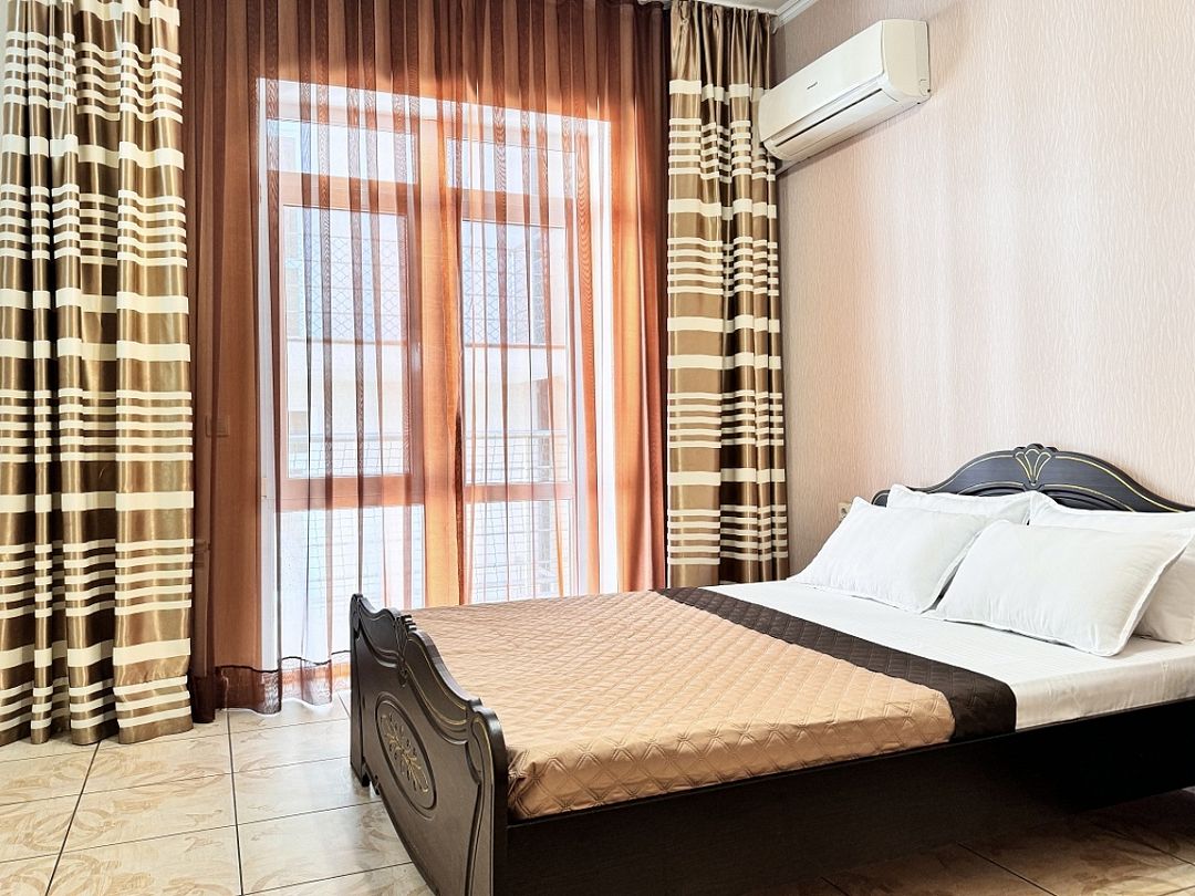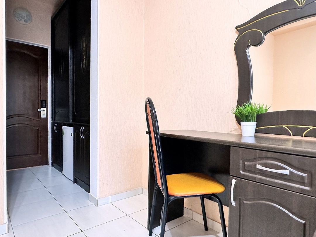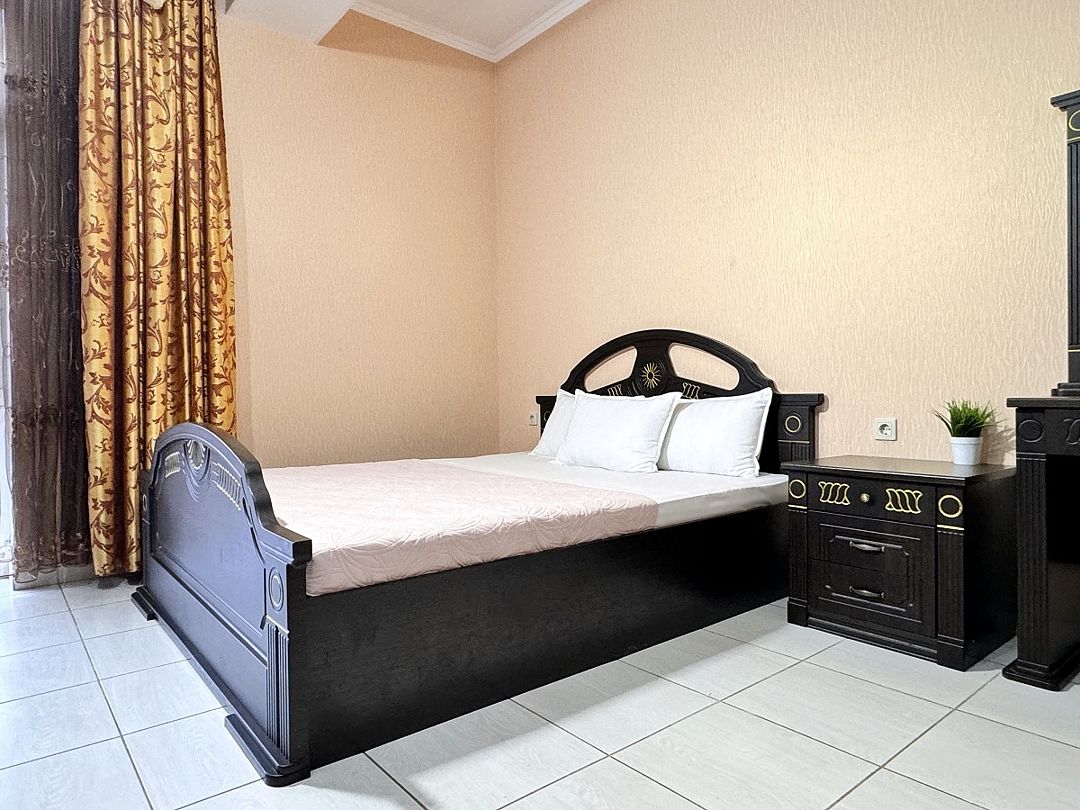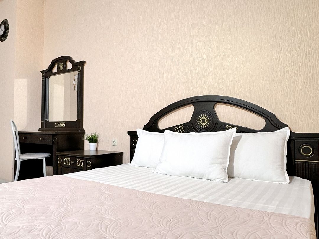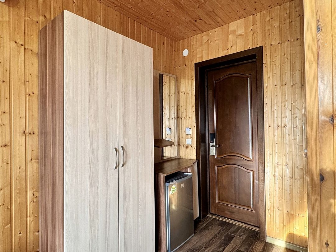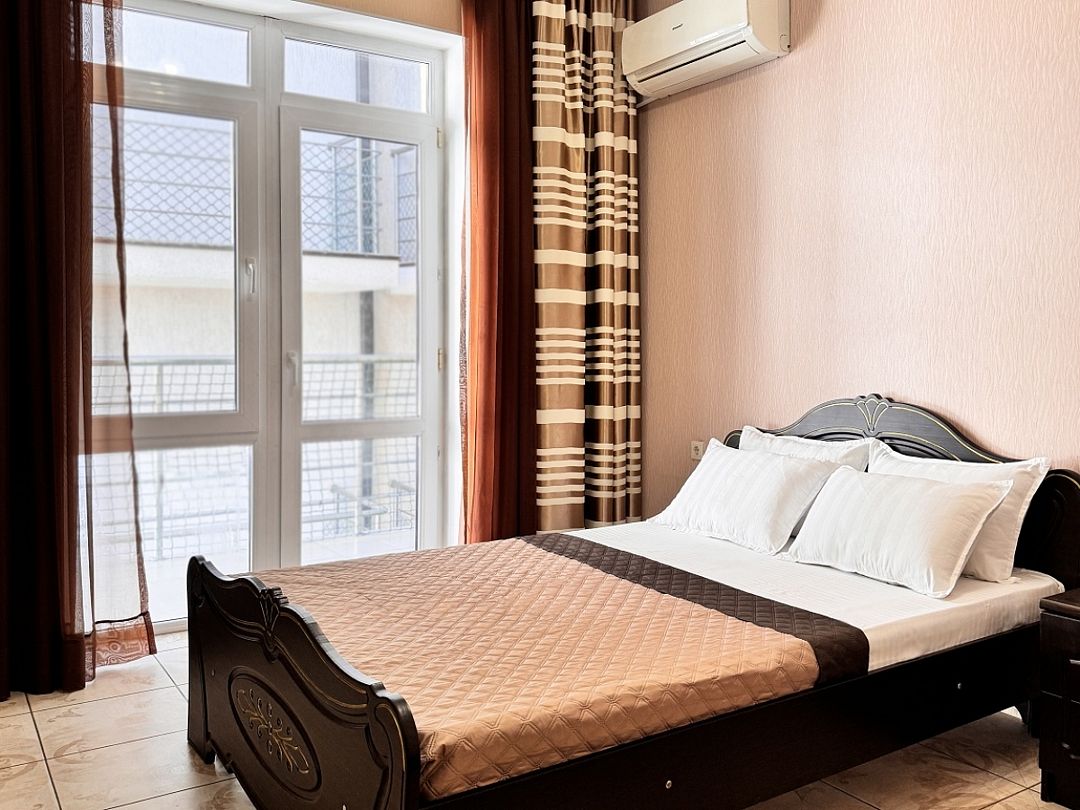 Номер оснащен: двуспальная кровать (140*200), прикроватная тумбочка, шкаф, тв, кондиционер, мини-холодильник.
