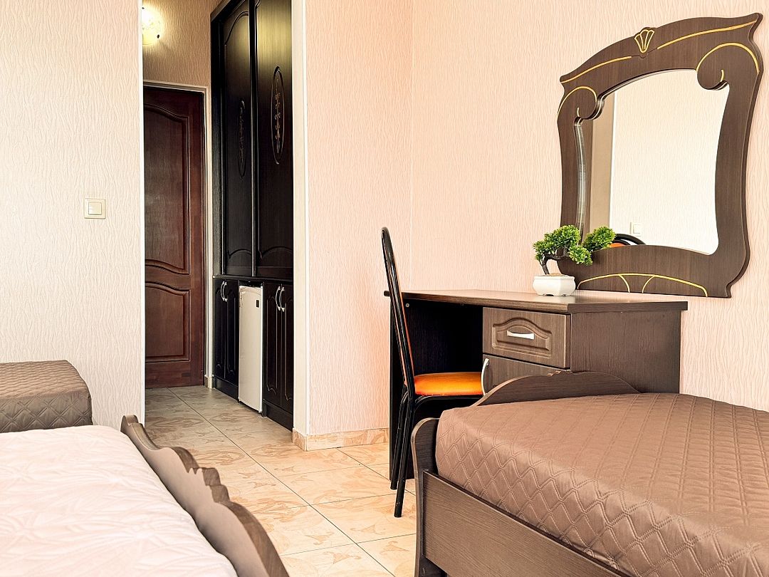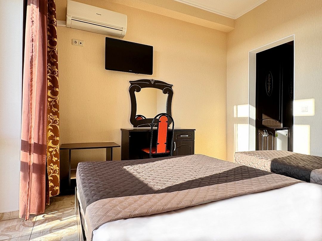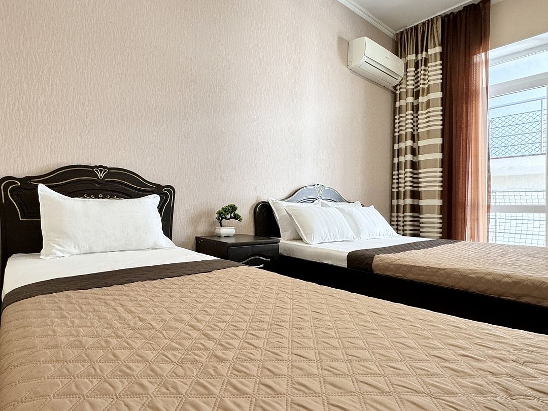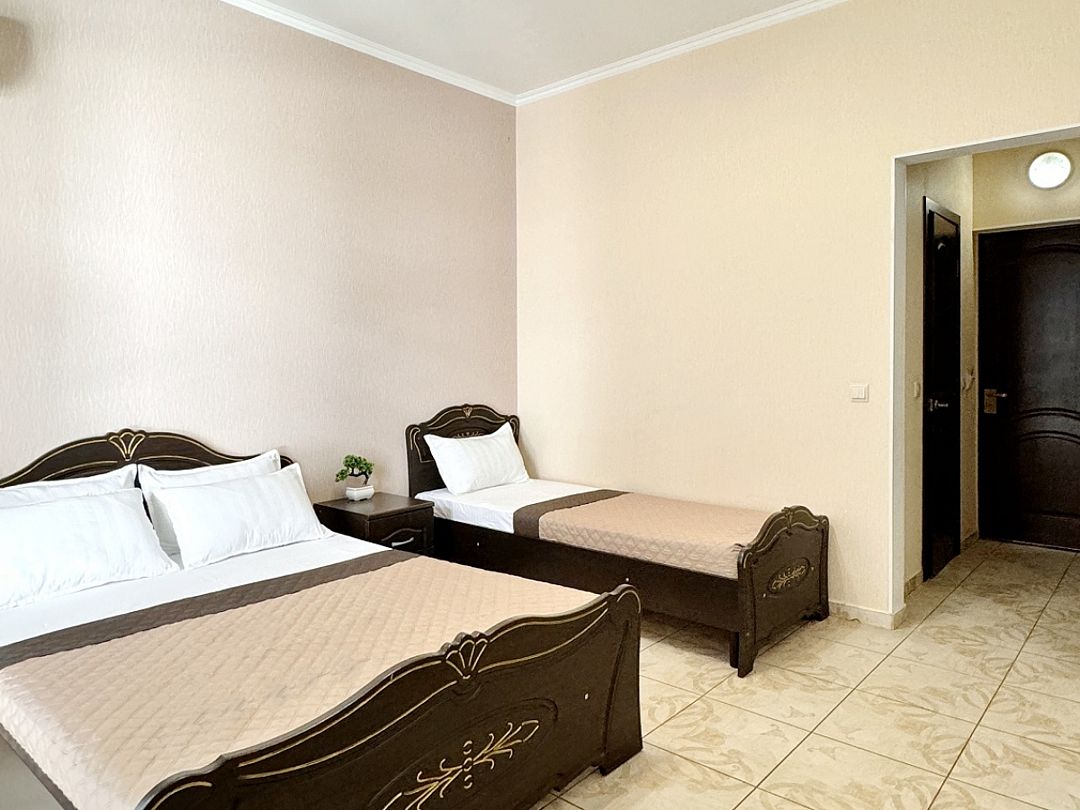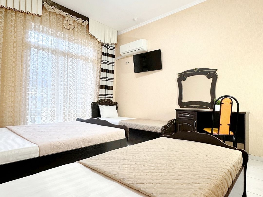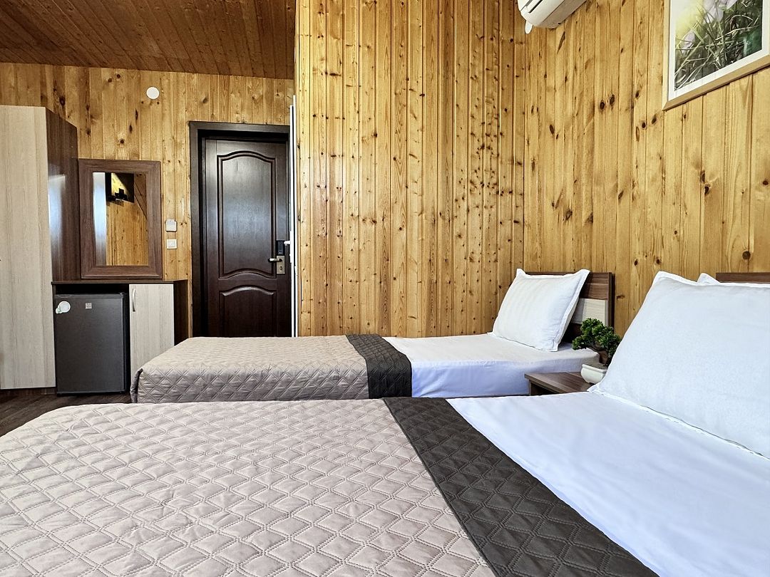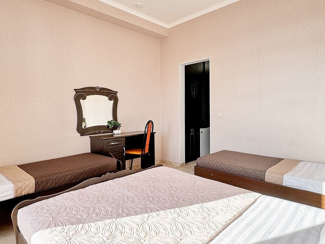 Номер оснащён: три односпальные кровати, прикроватная тумбочка, шкаф, тв, кондиционер, мини-холодильник.