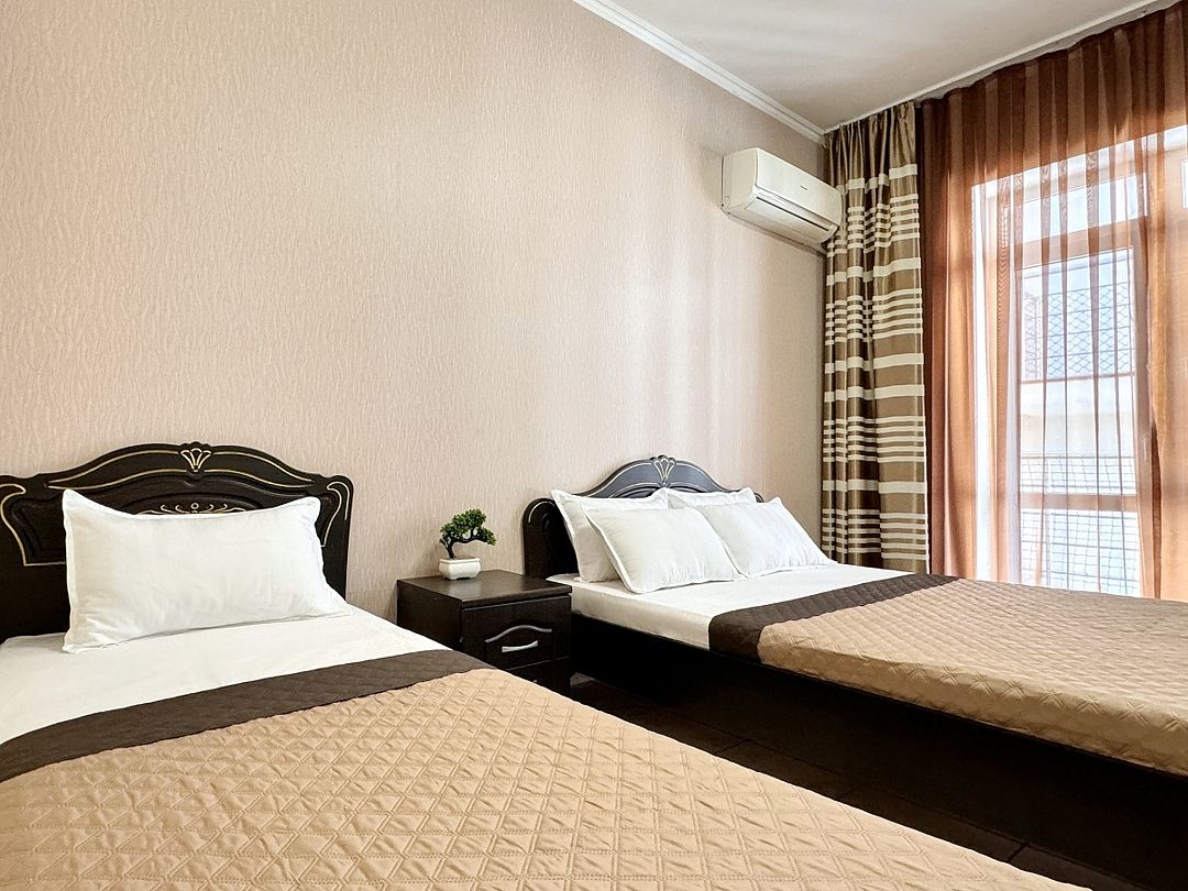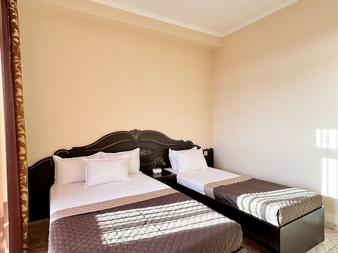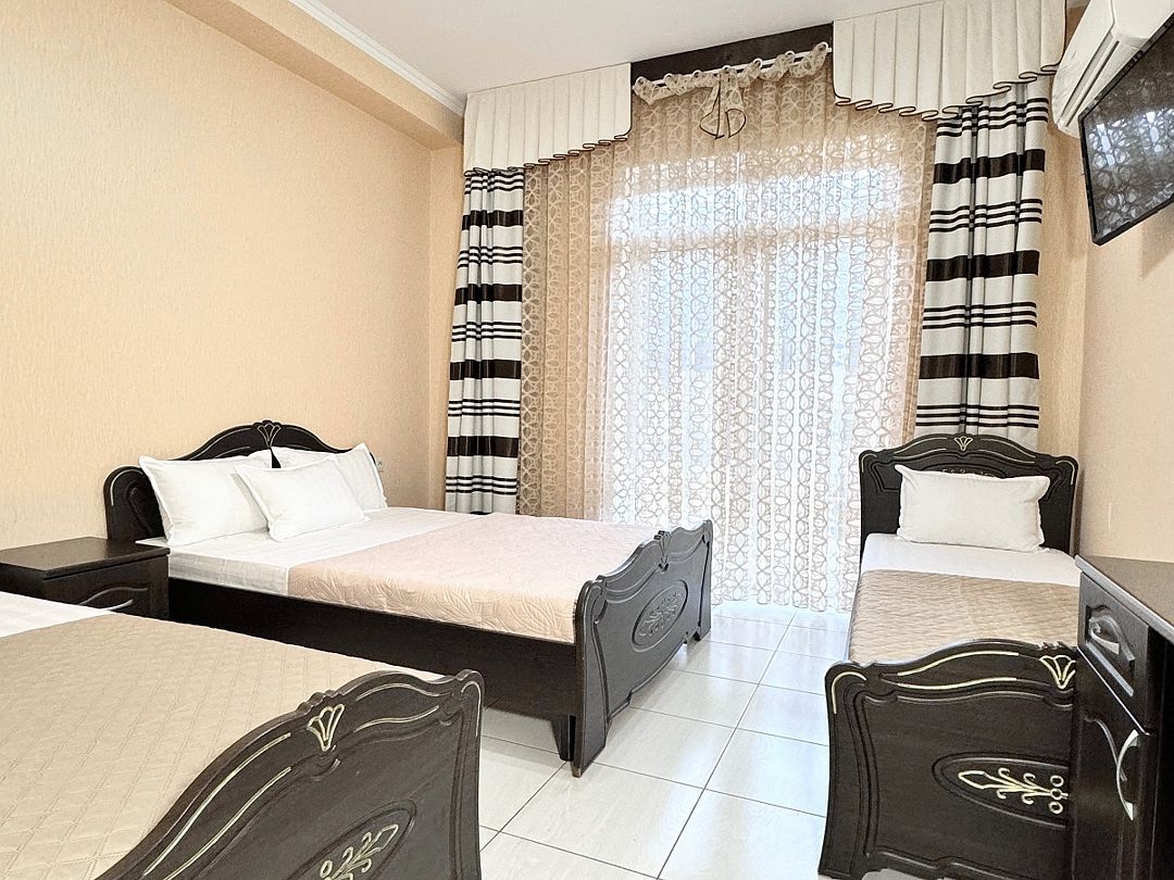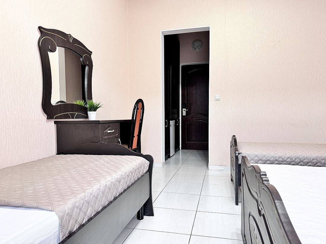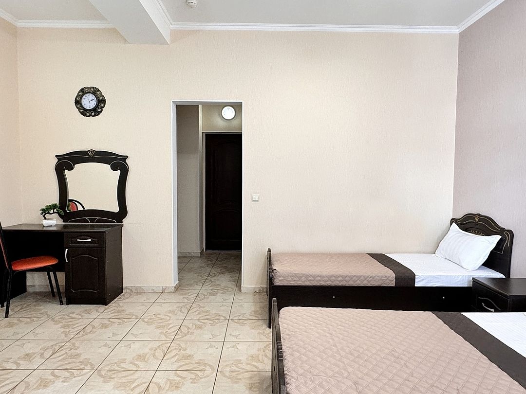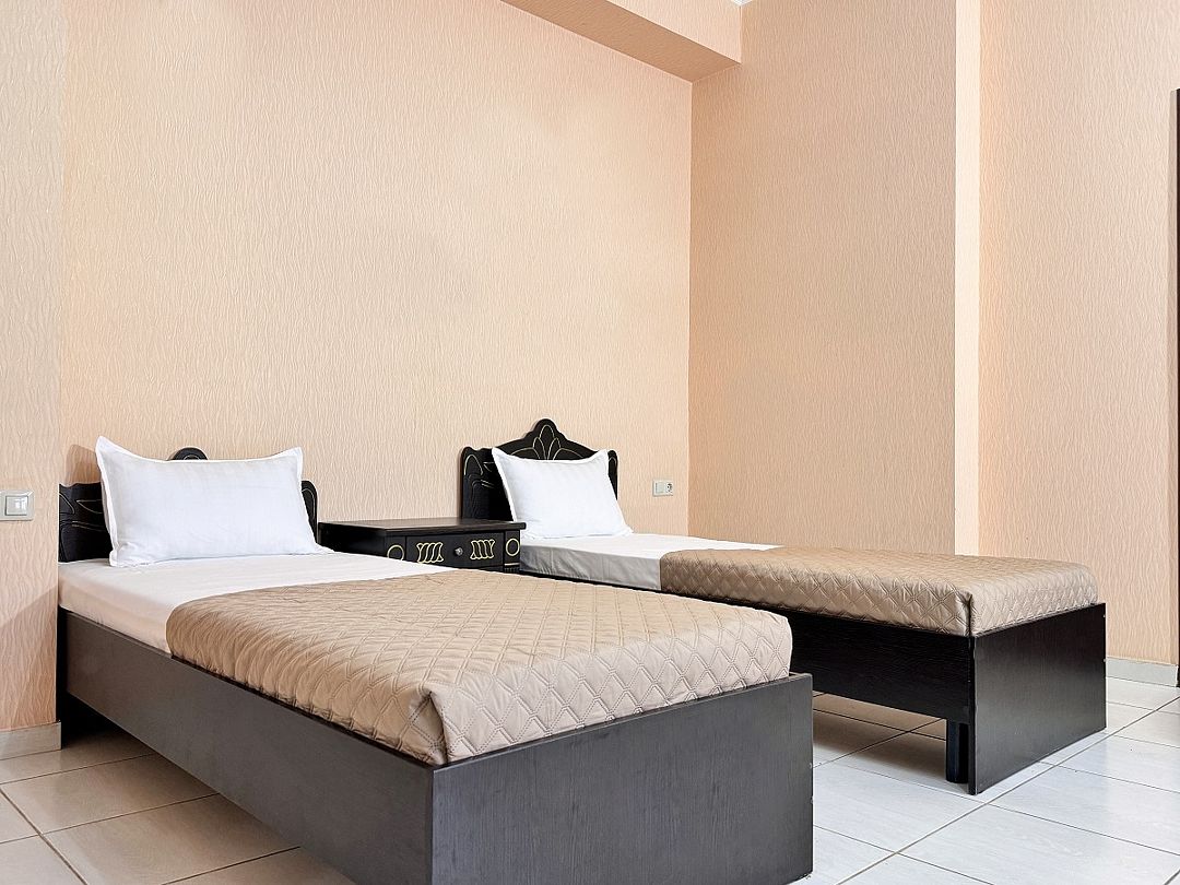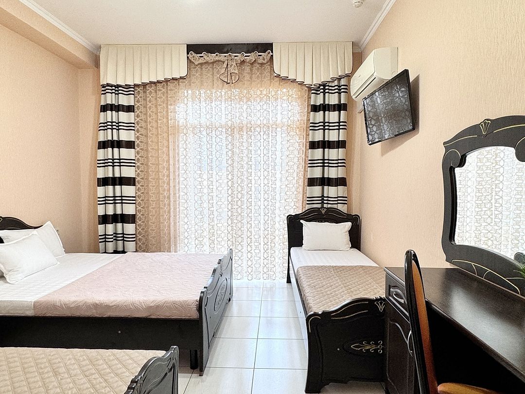 Номер оснащён: три односпальные кровати, прикроватная тумбочка, шкаф, тв, кондиционер, мини-холодильник.