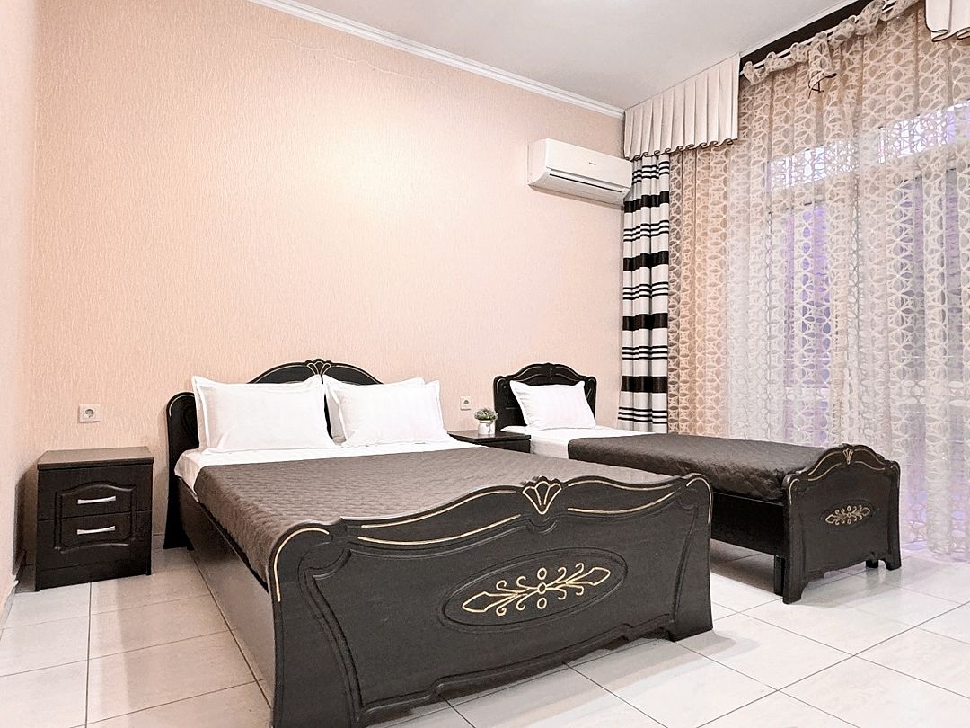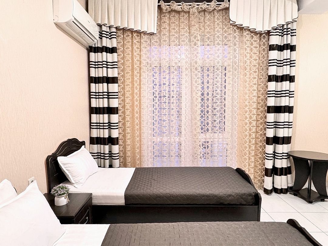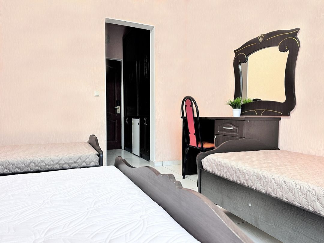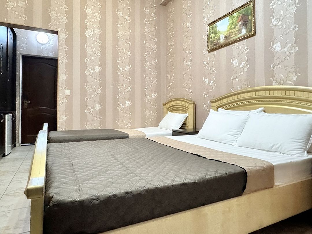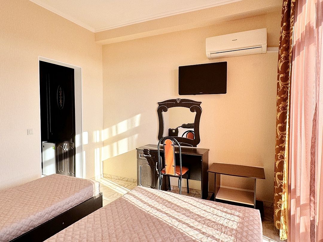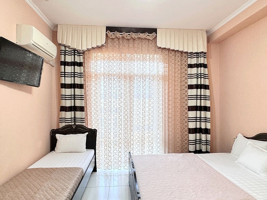 Номер оснащён: три односпальные кровати, прикроватная тумбочка, шкаф, тв, кондиционер, мини-холодильник.