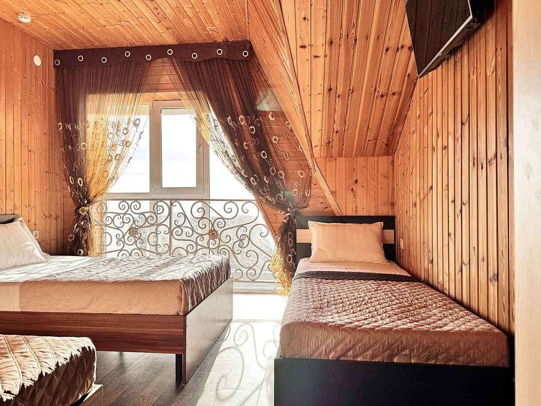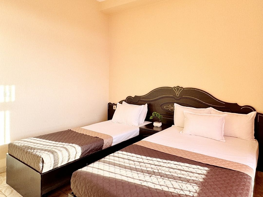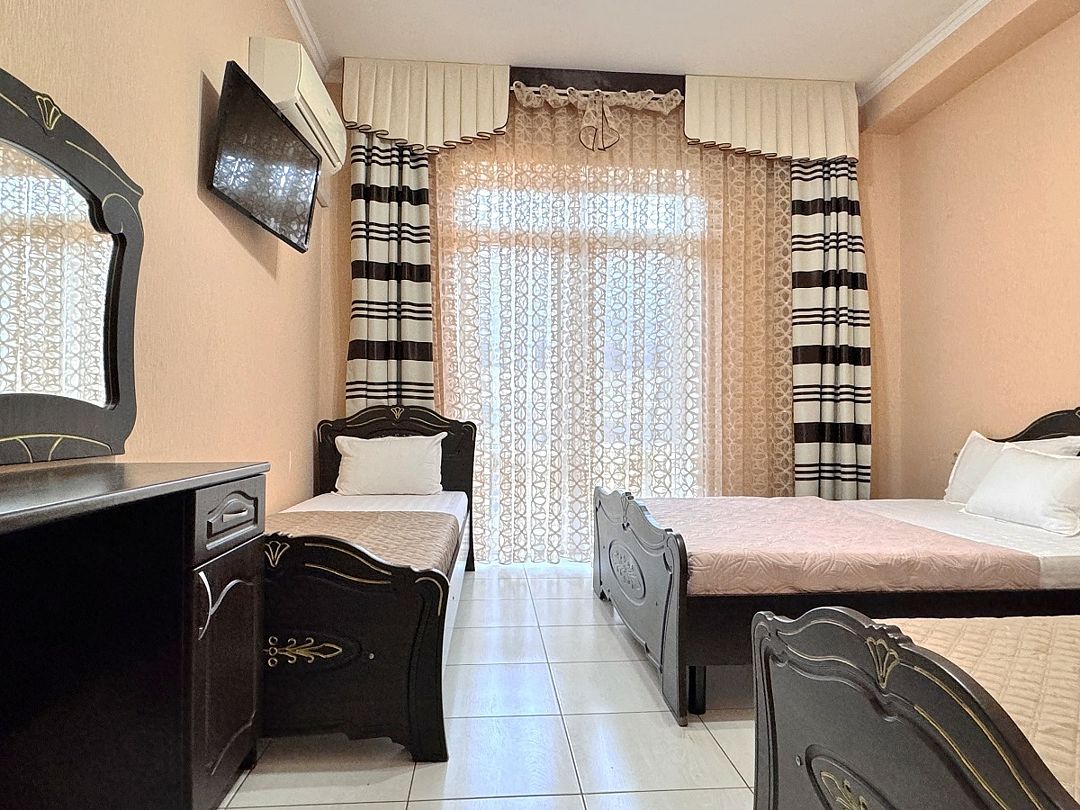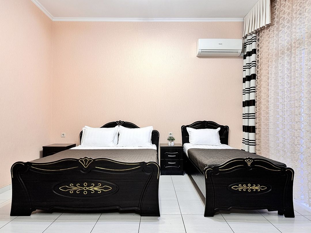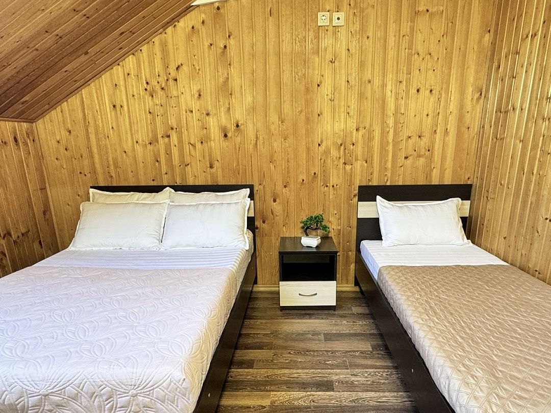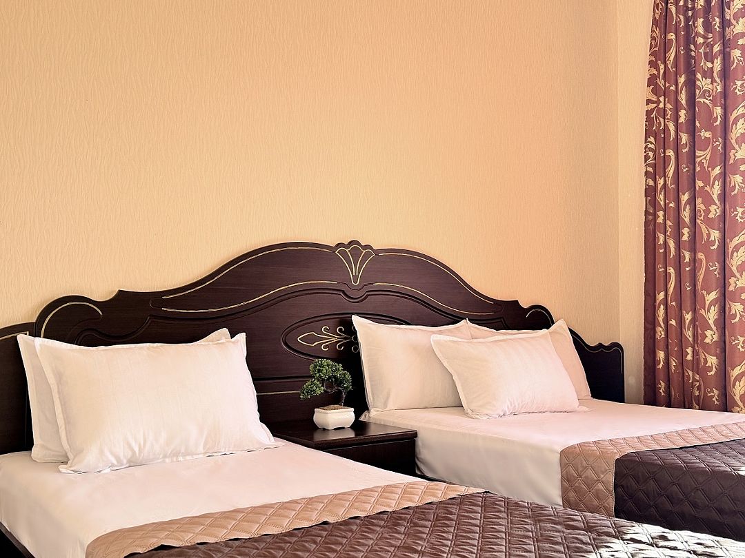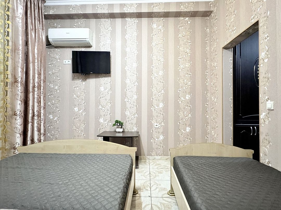 Номер оснащён: три односпальные кровати, прикроватная тумбочка, шкаф, тв, кондиционер, мини-холодильник.