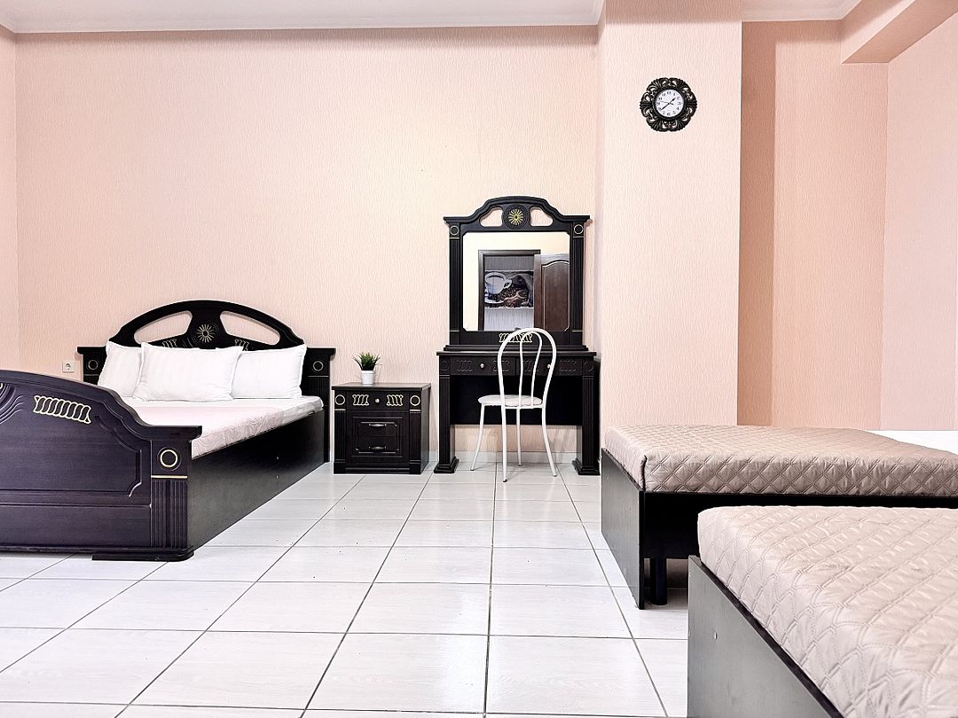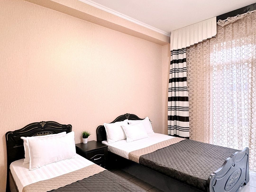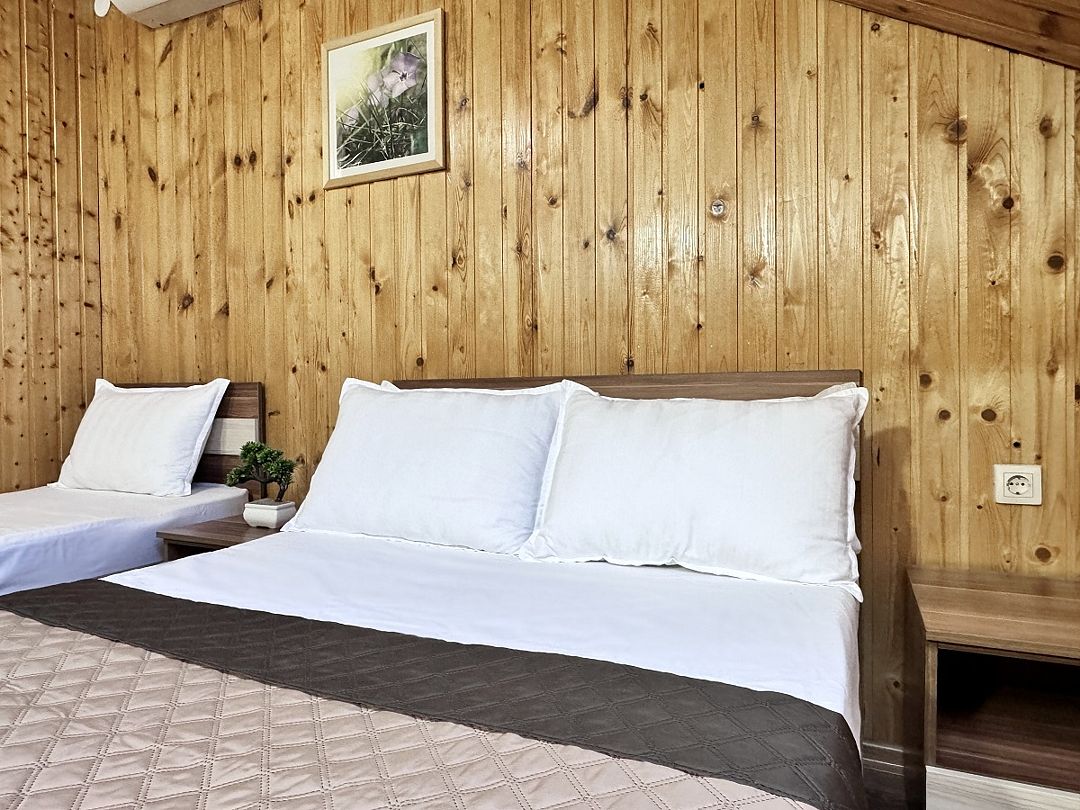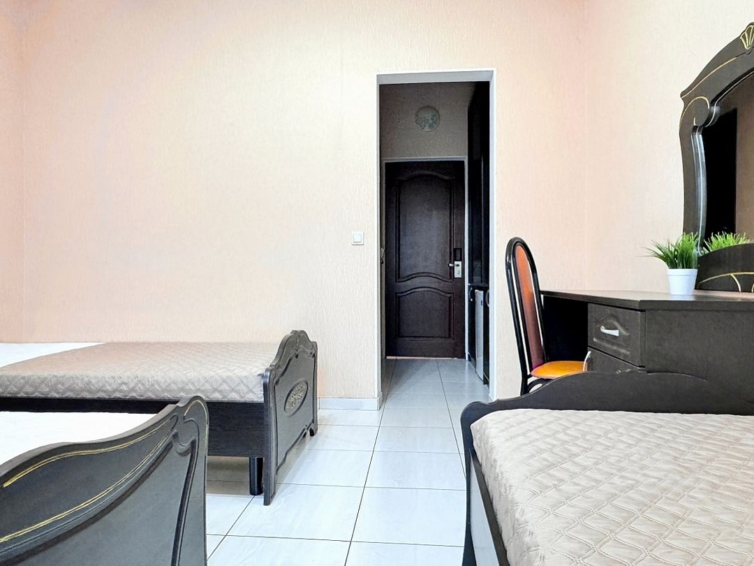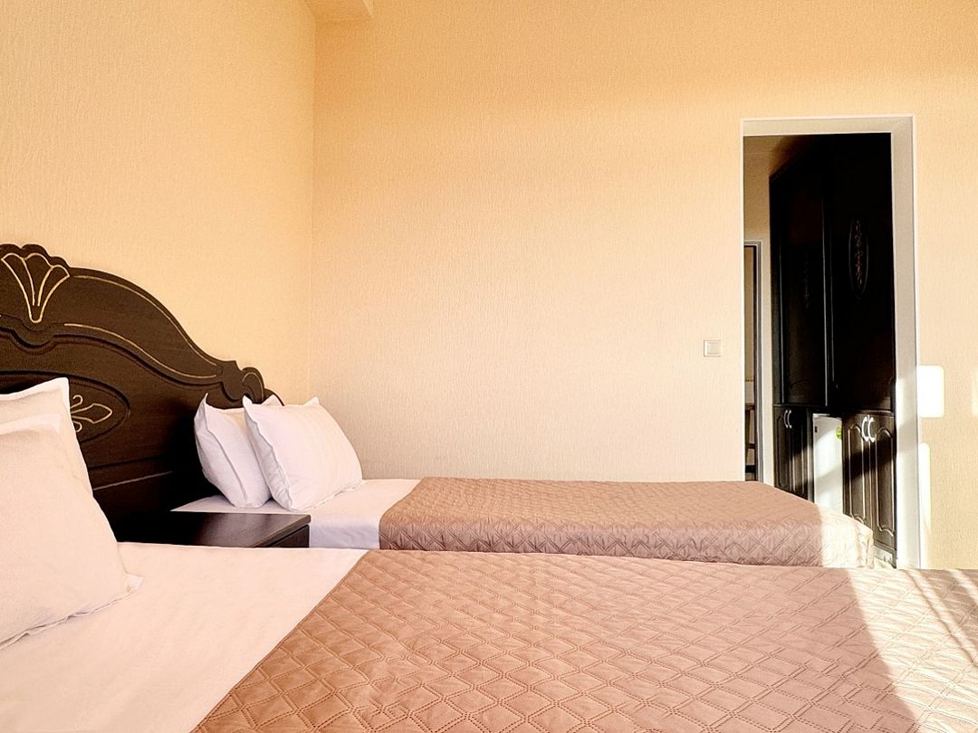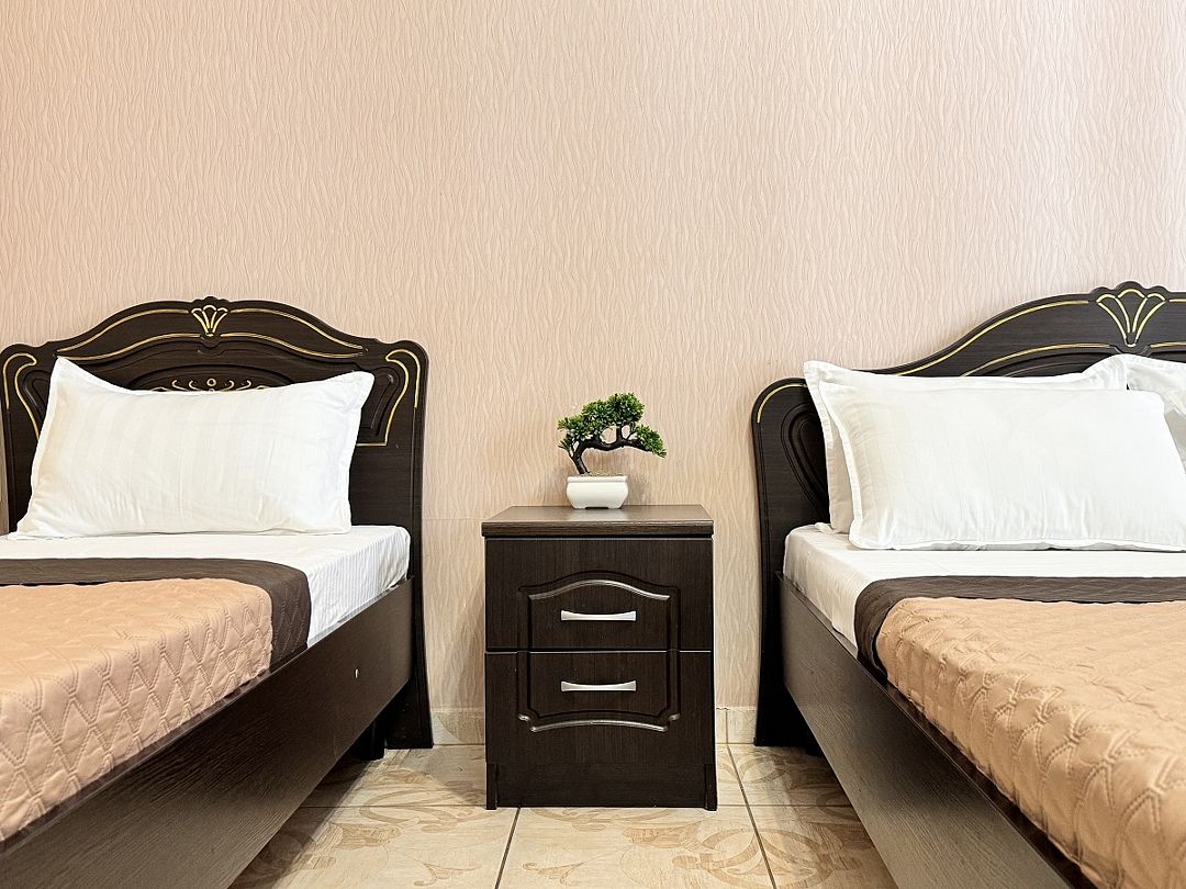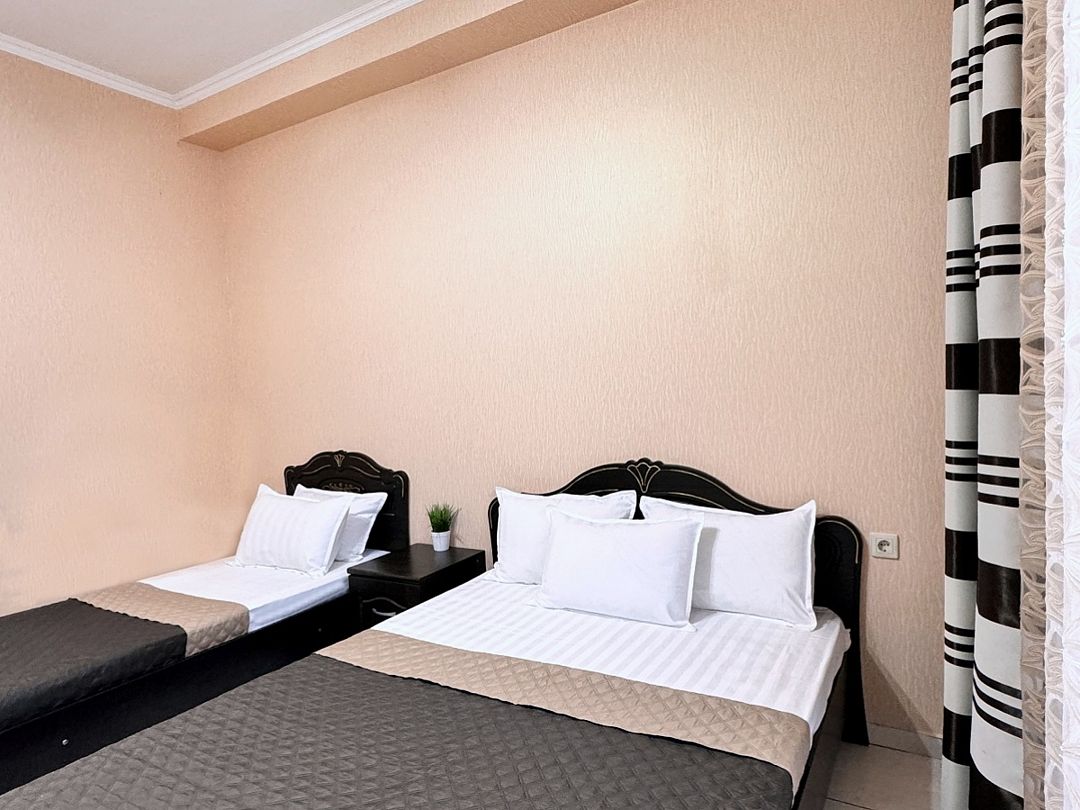 Номер оснащён: три односпальные кровати, прикроватная тумбочка, шкаф, тв, кондиционер, мини-холодильник.