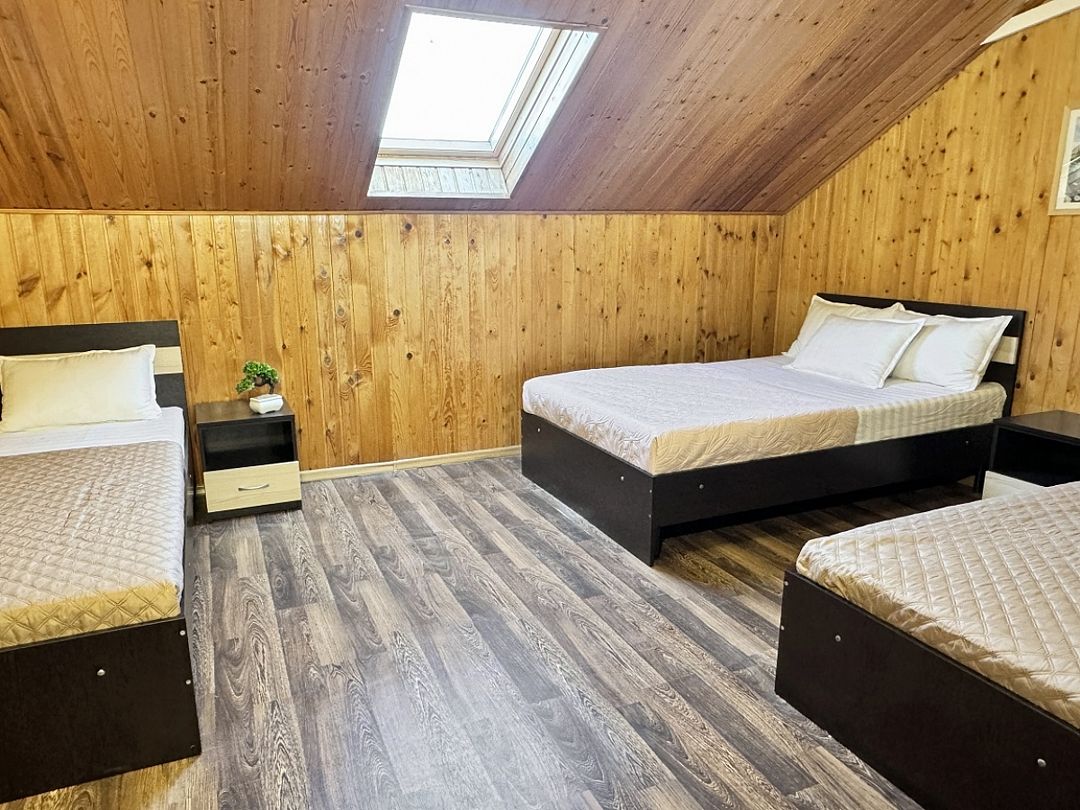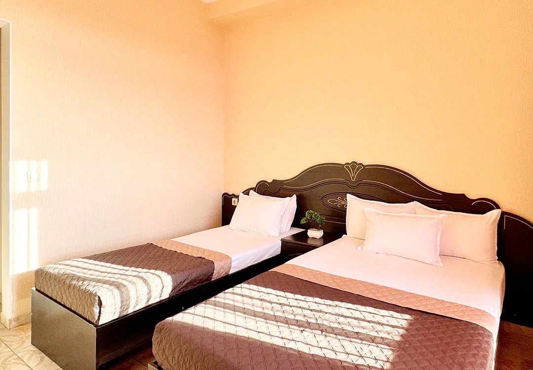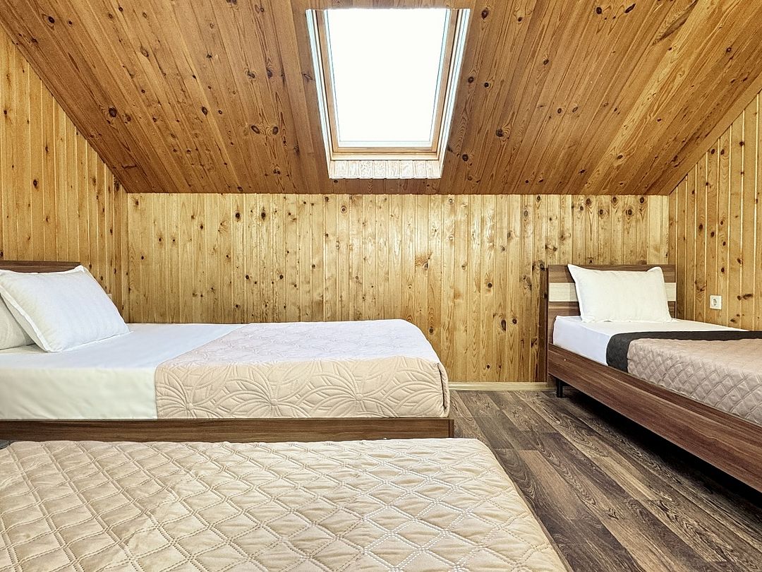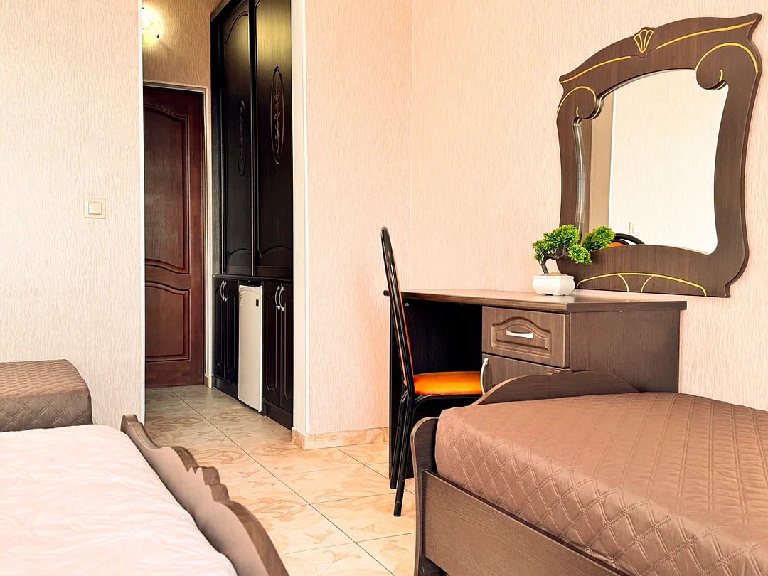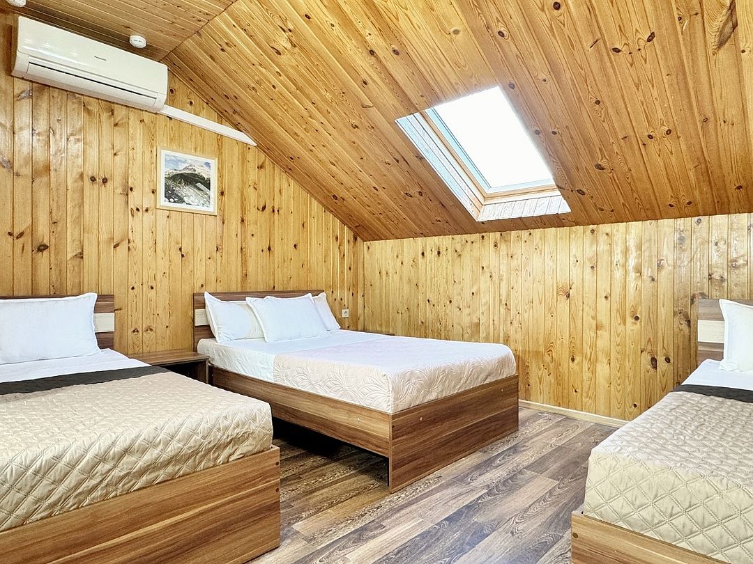 Номер оснащён: три односпальные кровати, прикроватная тумбочка, шкаф, тв, кондиционер, мини-холодильник. Маленькая ванная комната: душ, раковина, туалет.