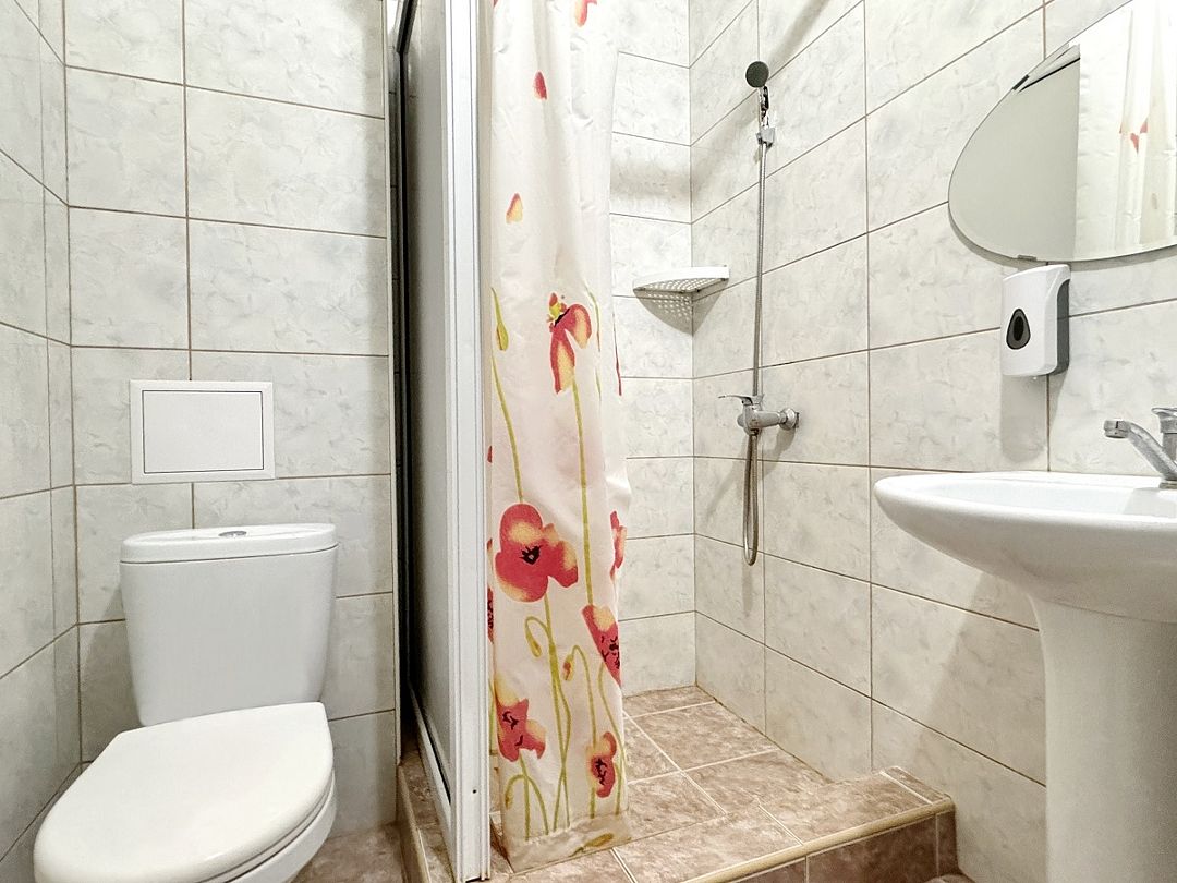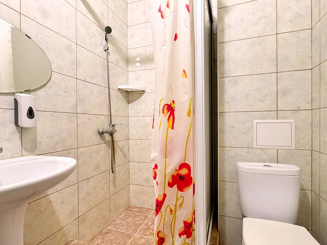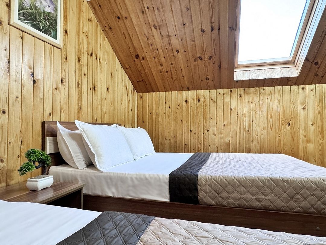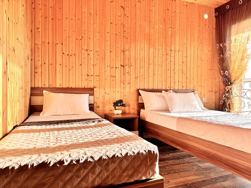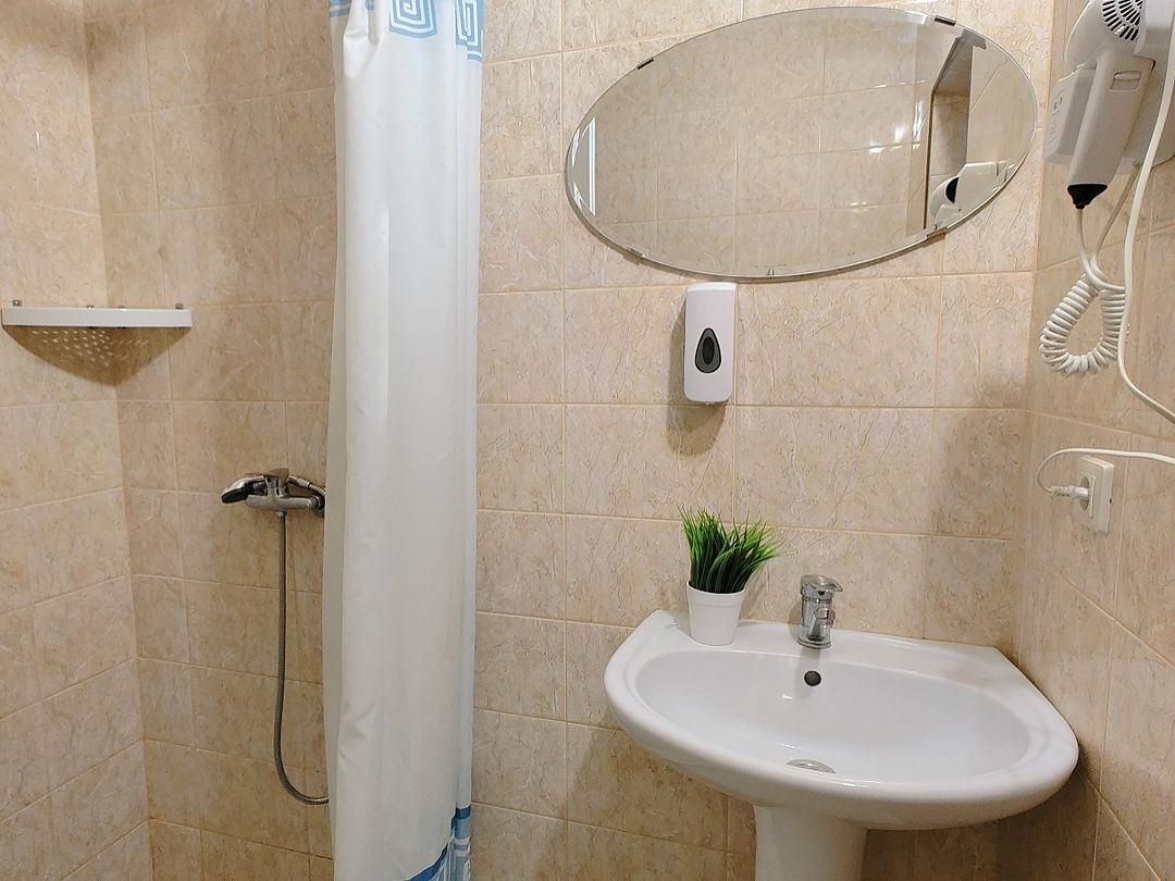 Номер оснащён: три односпальные кровати, прикроватная тумбочка, шкаф, тв, кондиционер, мини-холодильник. Маленькая ванная комната: душ, раковина, туалет.
