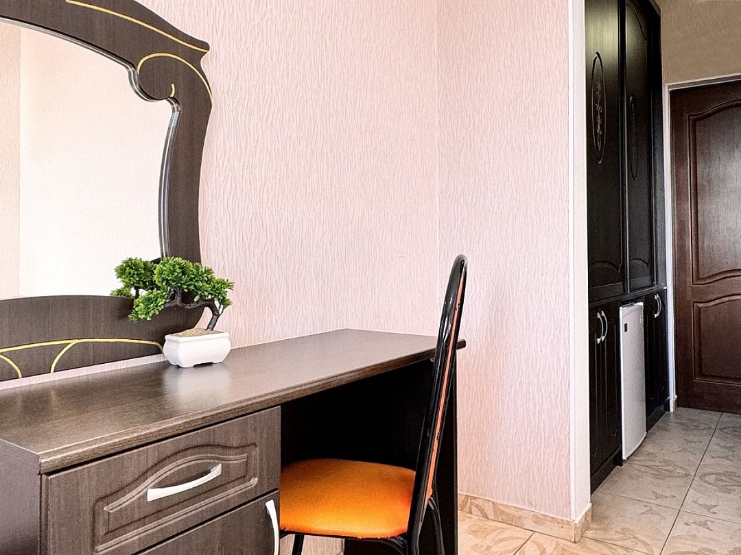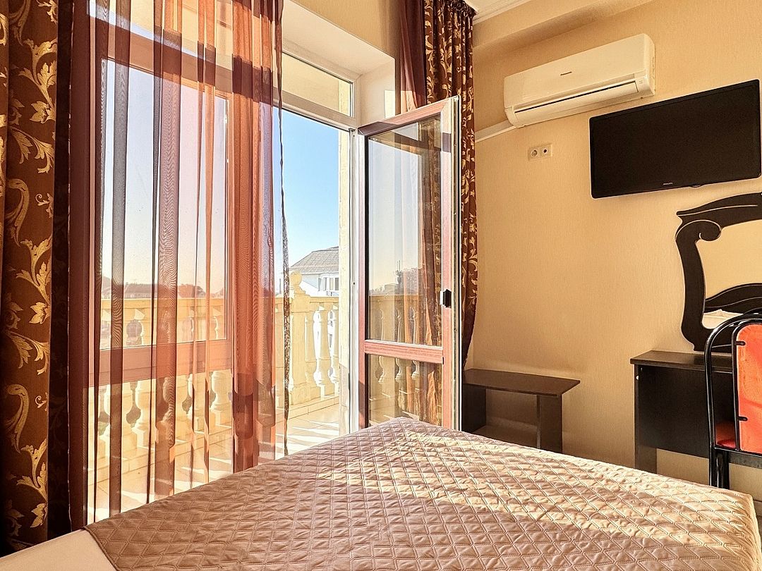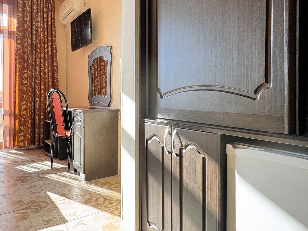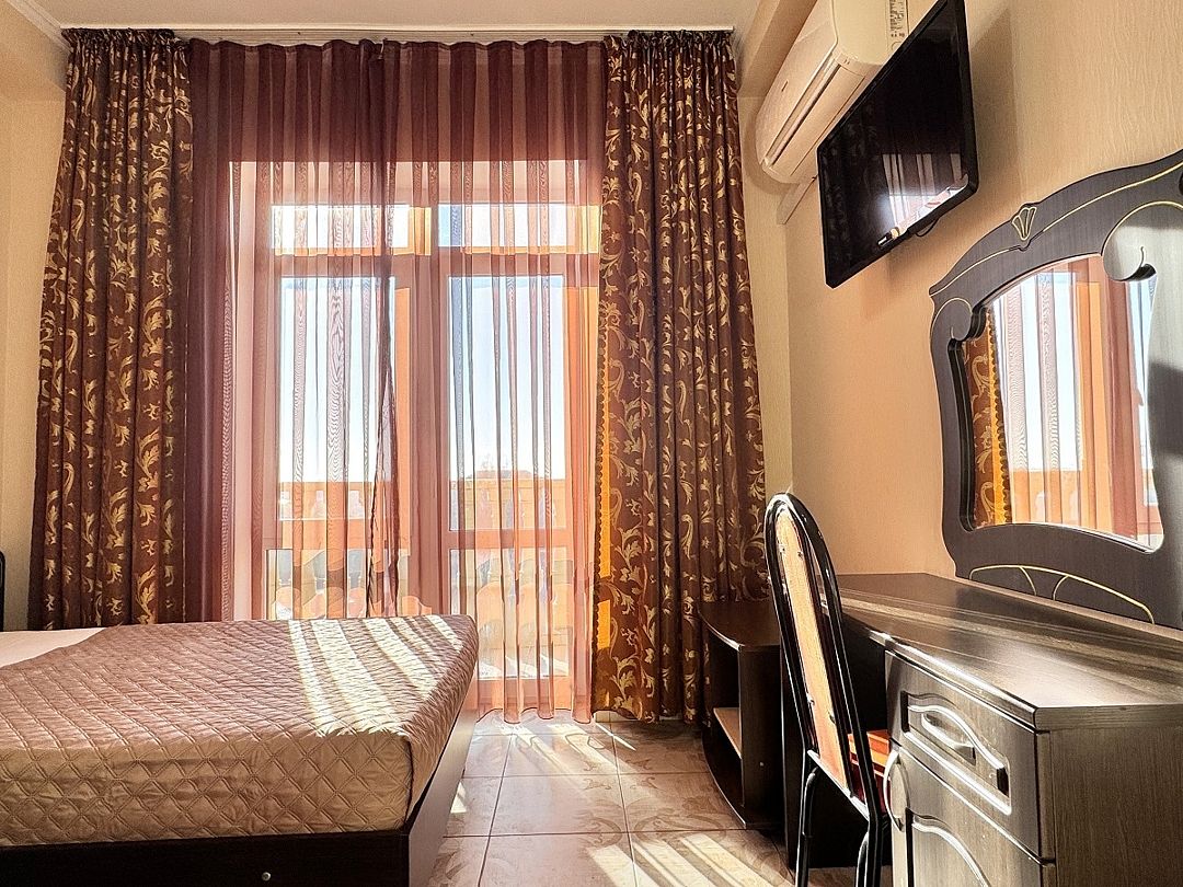 Номер оснащен: двуспальная кровать (140*200), односпальная кровать, прикроватные тумбочки, туалетный столик, шкаф-купе, сейф, ТВ, кондиционер, мини-холодильник. Ванная комната: душ, туалет, раковина, зеркало, фен. Балкон с видом на море.