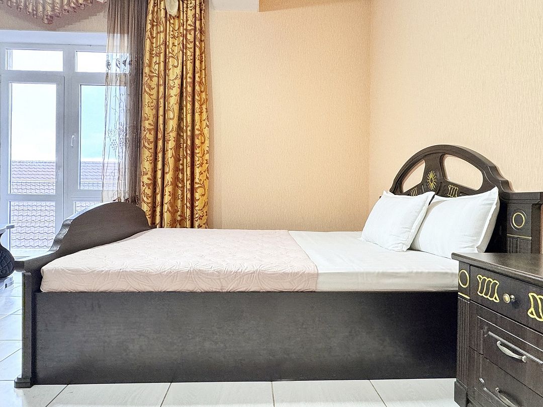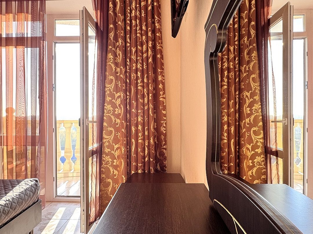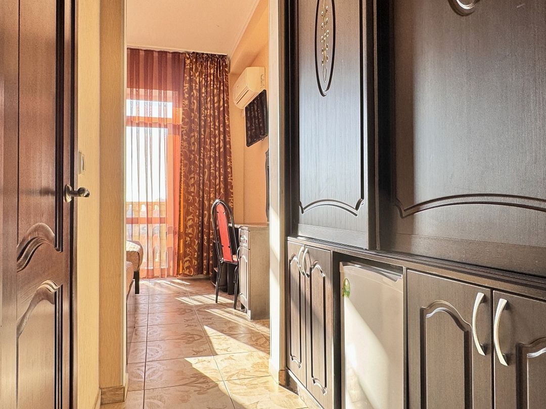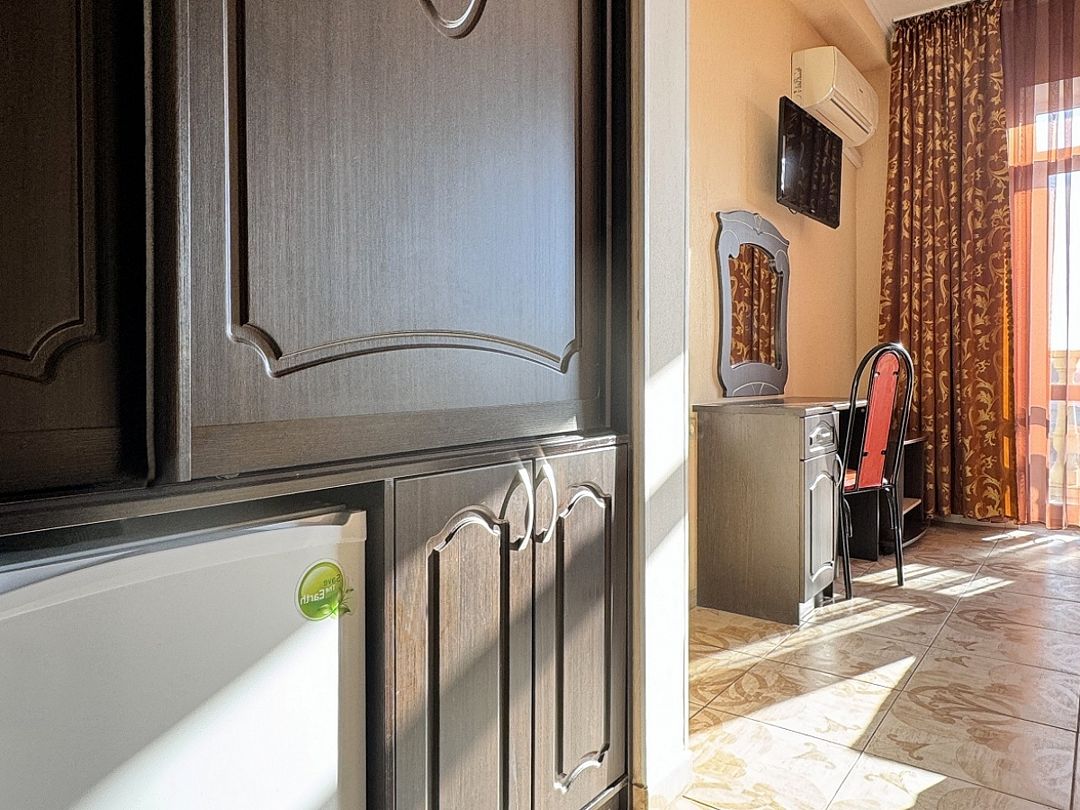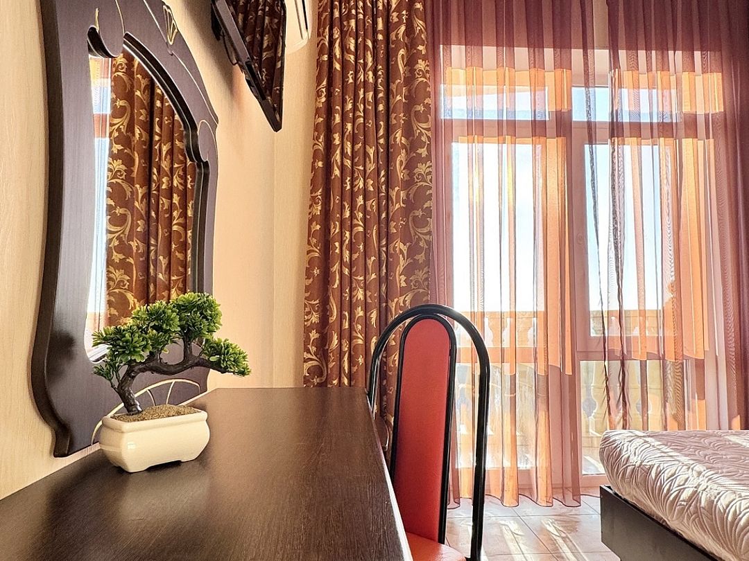 Номер оснащен: двуспальная кровать (140*200), односпальная кровать, прикроватные тумбочки, туалетный столик, шкаф-купе, сейф, ТВ, кондиционер, мини-холодильник. Ванная комната: душ, туалет, раковина, зеркало, фен. Балкон с видом на море.