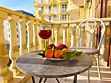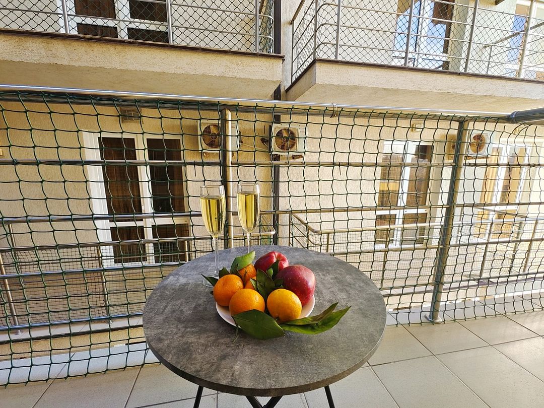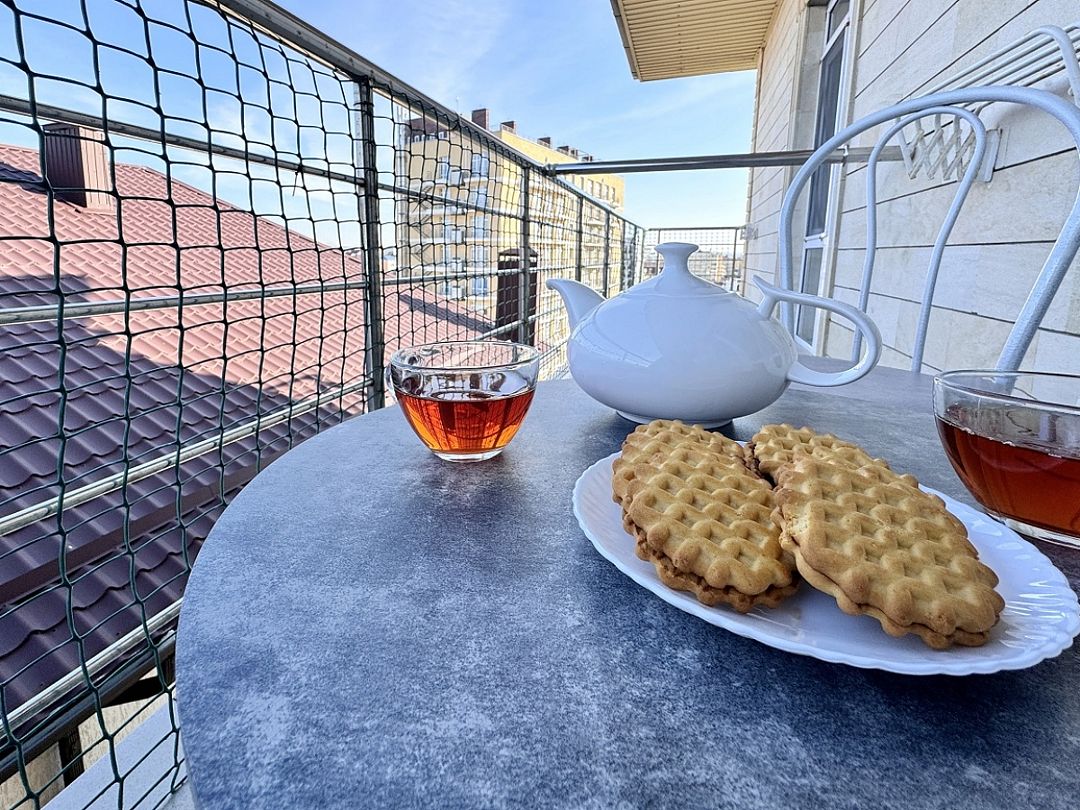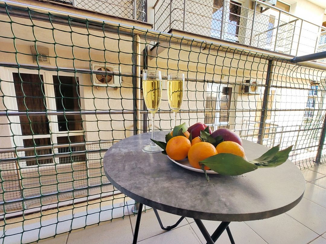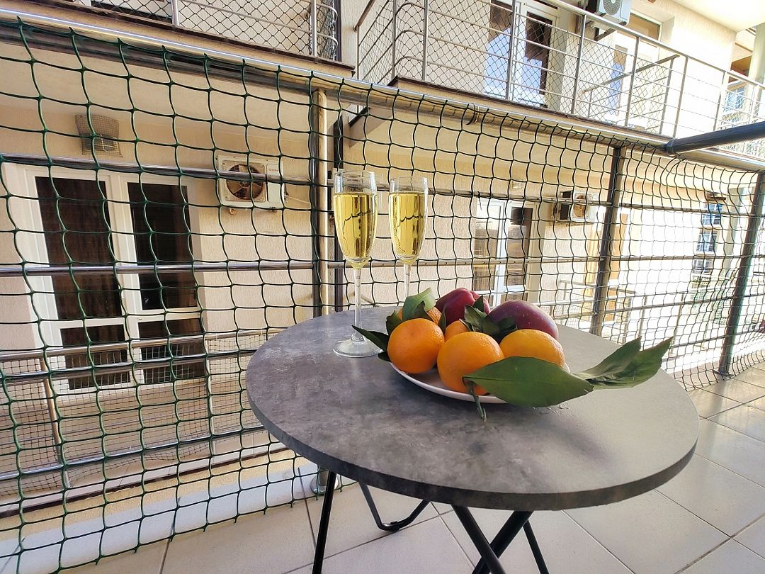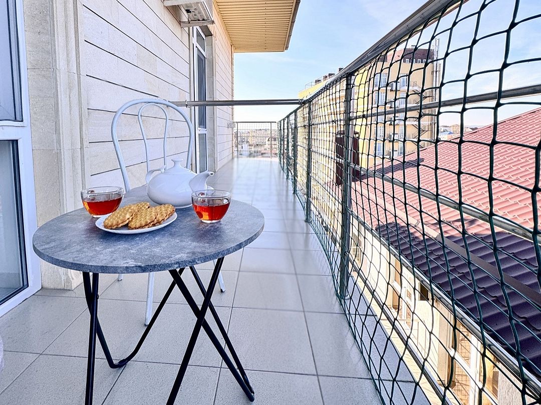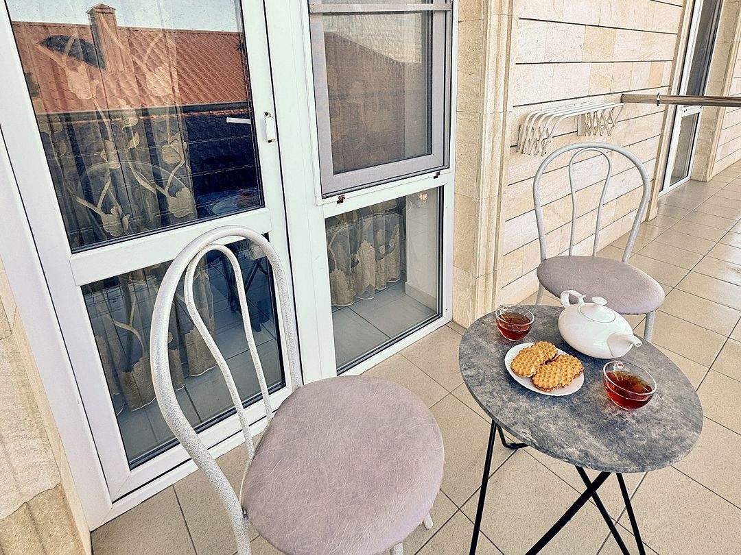 Балкон с видом на соседнее здание. На балконе имеется летняя мебель для отдыха. Окна в номере открываются.