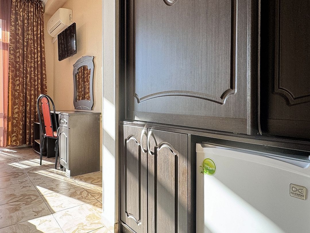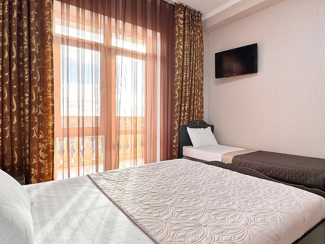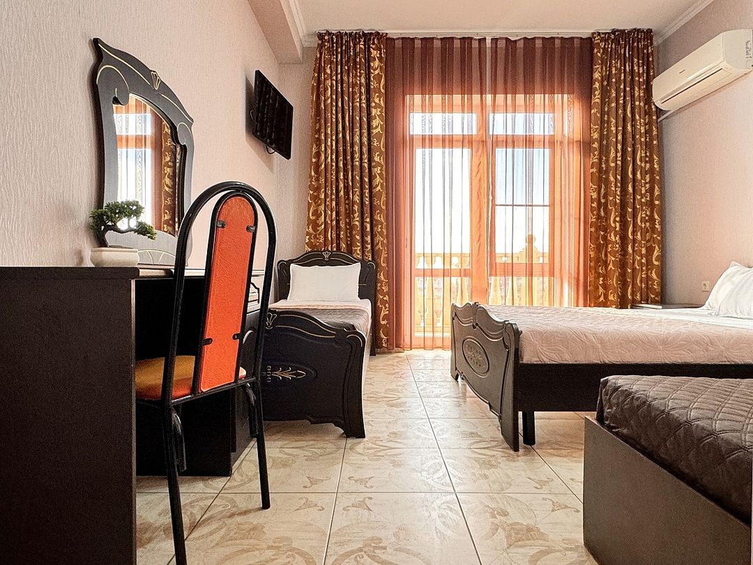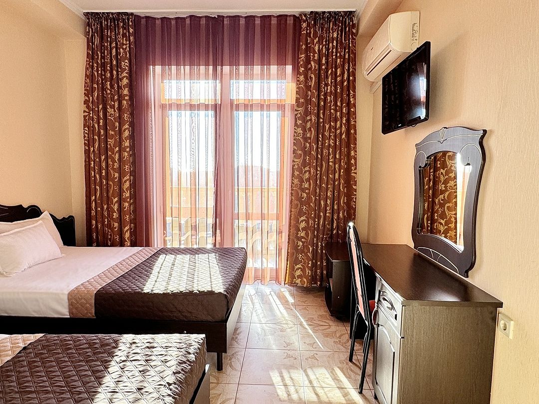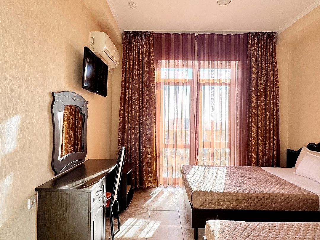 Номер оснащен: двуспальная кровать (140*200), односпальная кровать, прикроватные тумбочки, туалетный столик, шкаф-купе, сейф, ТВ, кондиционер, мини-холодильник. Ванная комната: душ, раковина, туалет, фен. Балкон с видом на территорию отеля и бар оснащен летней мебелью. Окна в номере открываются.