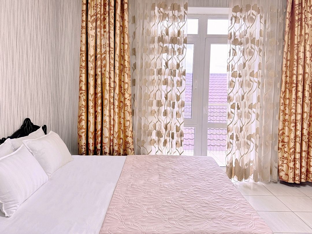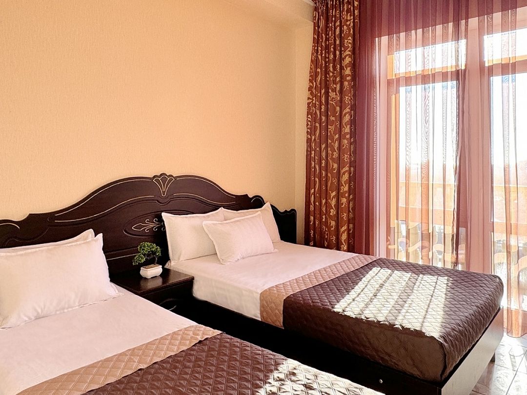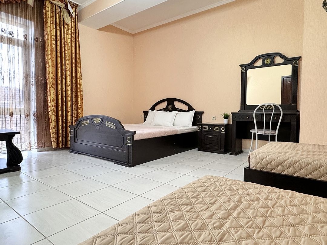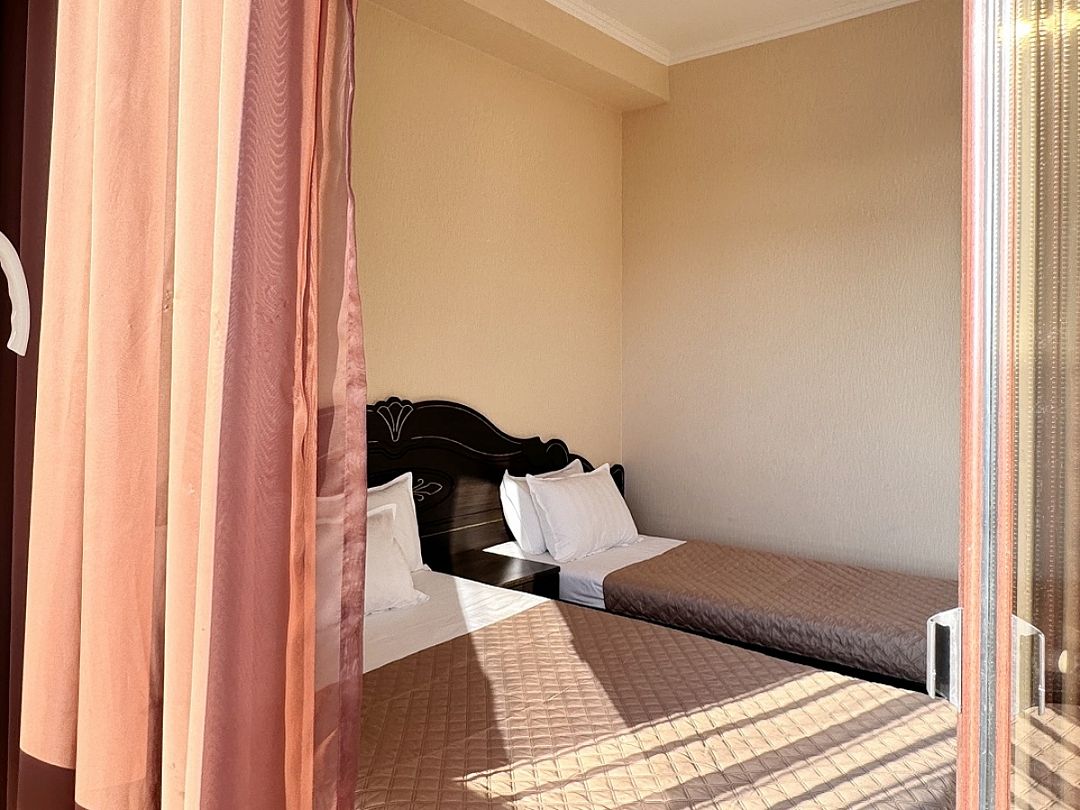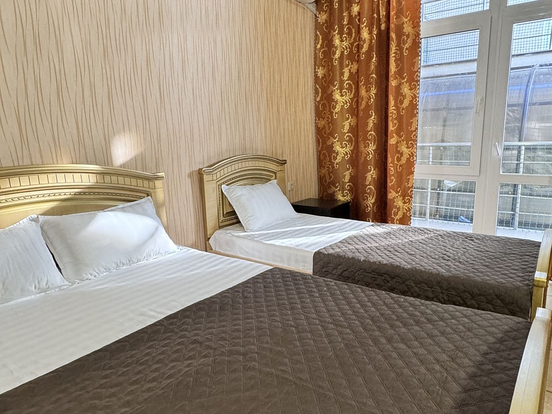 Номер оснащен: двуспальная кровать (140*200), односпальная кровать, прикроватные тумбочки, туалетный столик, шкаф-купе, сейф, ТВ, кондиционер, мини-холодильник. Ванная комната: душ, раковина, туалет, фен. Балкон с видом на территорию отеля и бар оснащен летней мебелью. Окна в номере открываются.