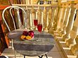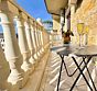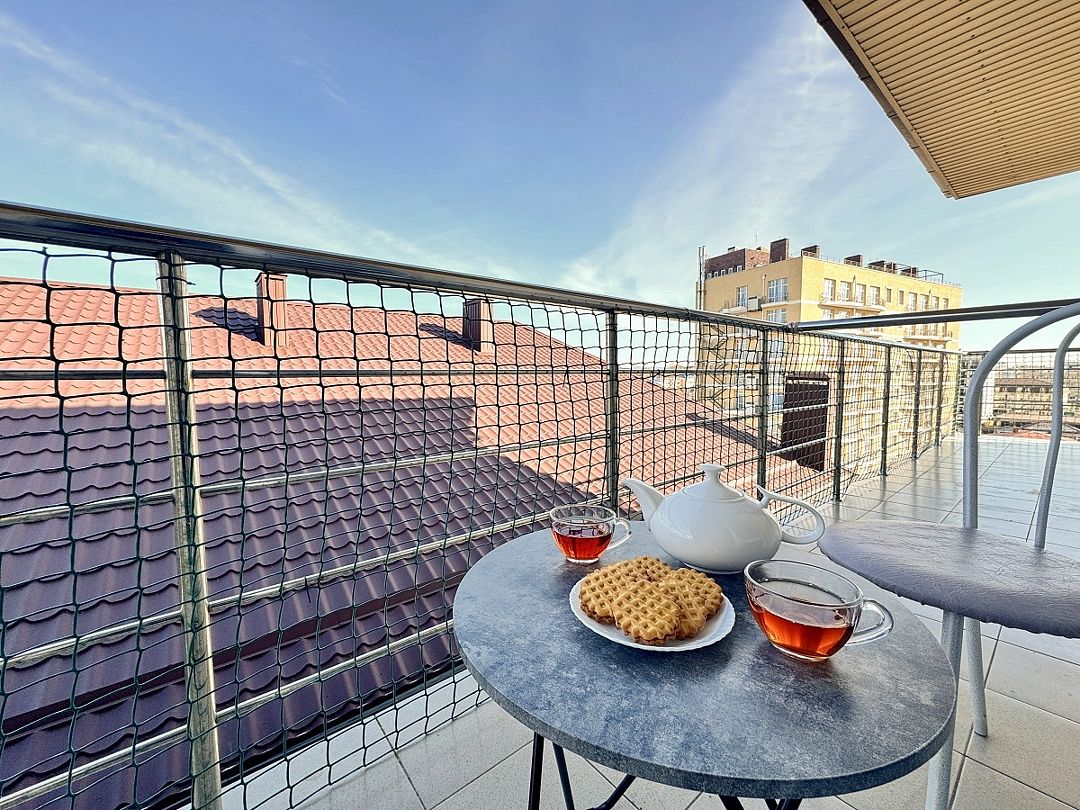 Балкон с видом на соседнее здание. На балконе имеется летняя мебель для отдыха.