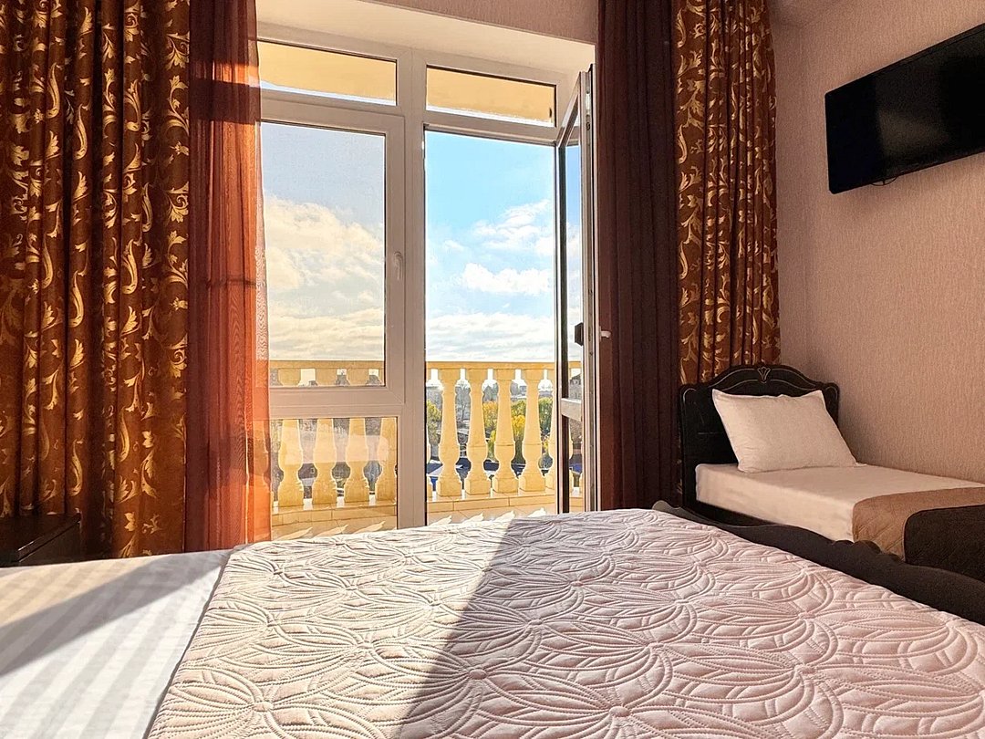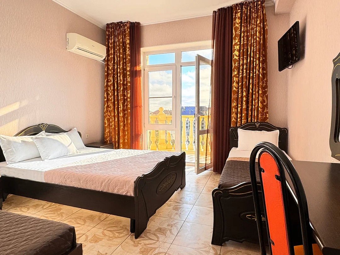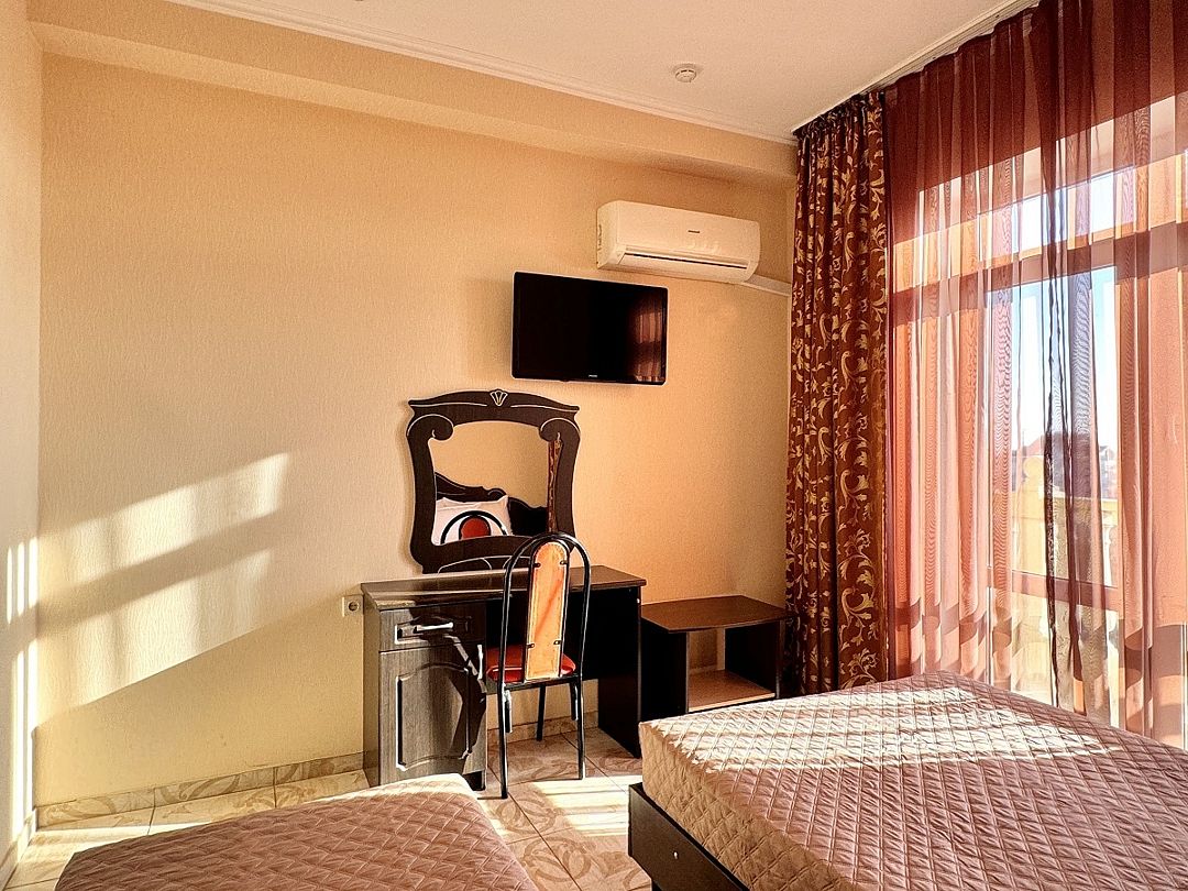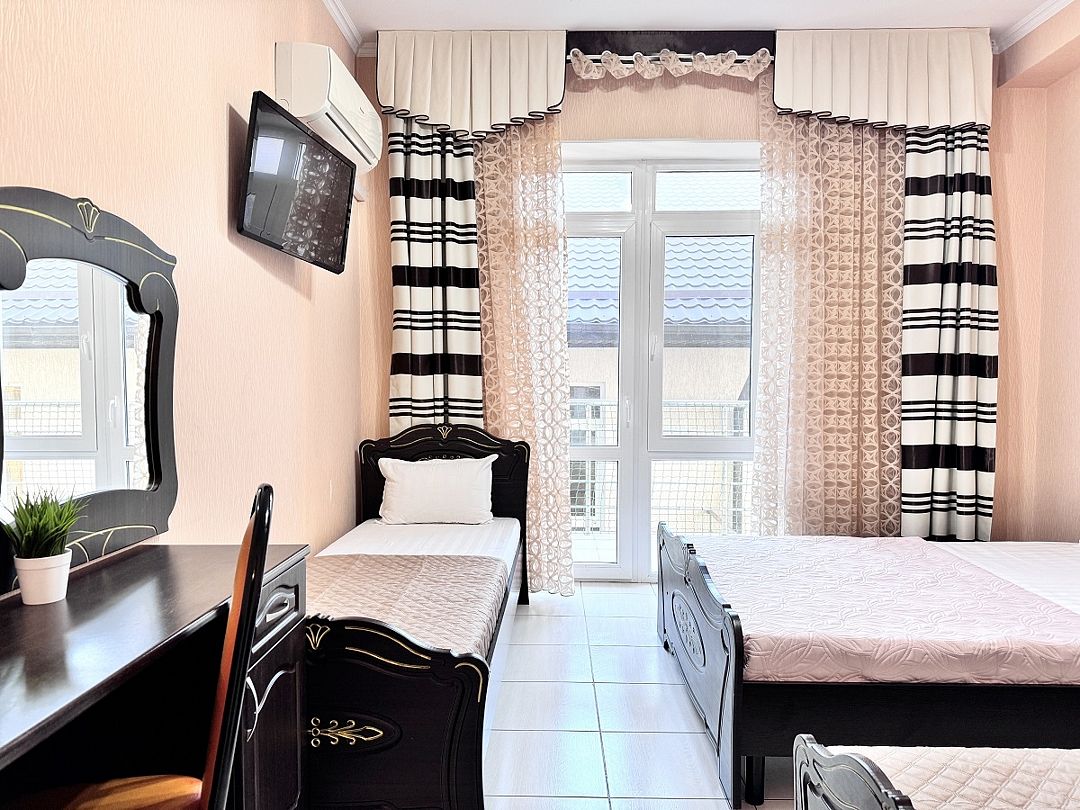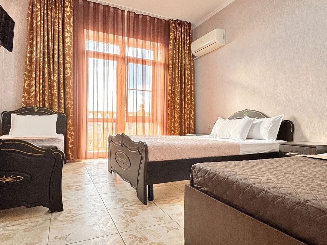 Номер оснащен: двуспальная кровать (140*200), две односпальные кровати, прикроватные тумбочки, туалетный столик, шкаф-купе, сейф, ТВ, кондиционер, мини-холодильник. Ванная комната: душ, раковина, туалет, фен. Балкон с видом на море. На балконе имеется летняя мебель. Окна в номере открываются.