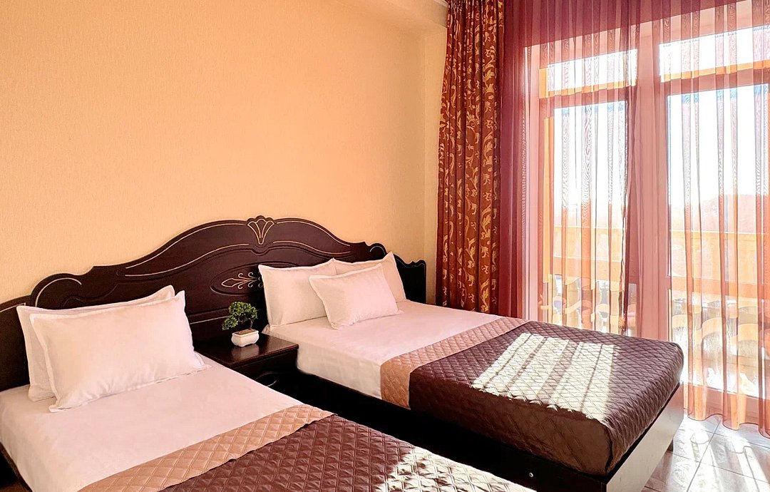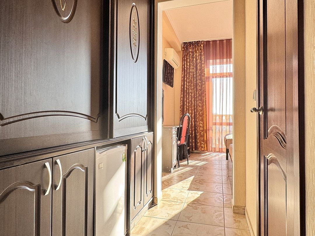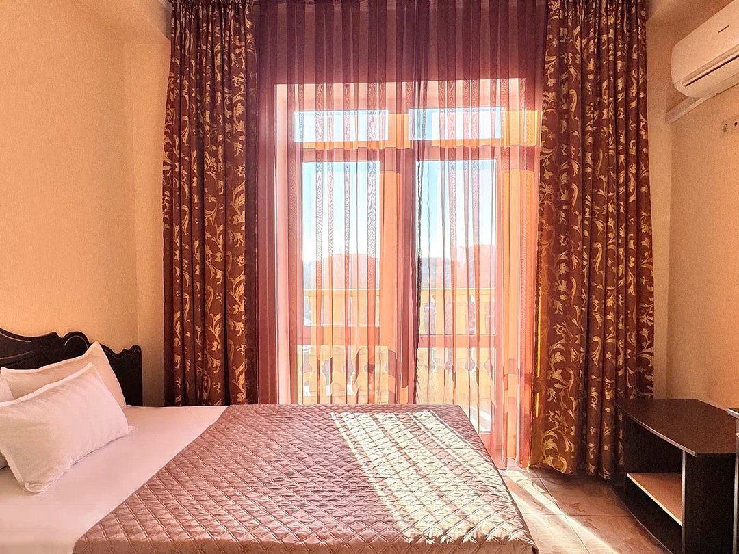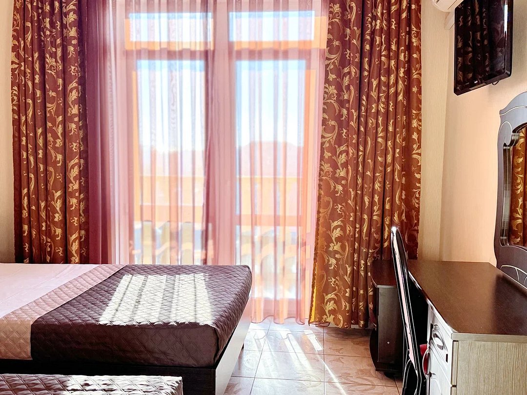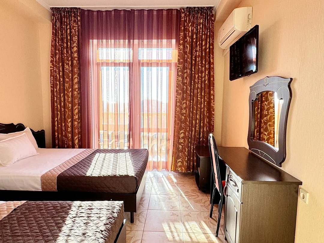 Красивое здание отеля с современным лифтом возвышается на охраняемой территории, расположенной в 800 метрах от моря. Большой жилой фонд включает однокомнатные номера для 1-5 человек, двухкомнатные и трехкомнатные семейные номера для 4-6 жильцов. Номера всех категорий оснащены всеми удобствами, необходимыми для полноценного отдыха.