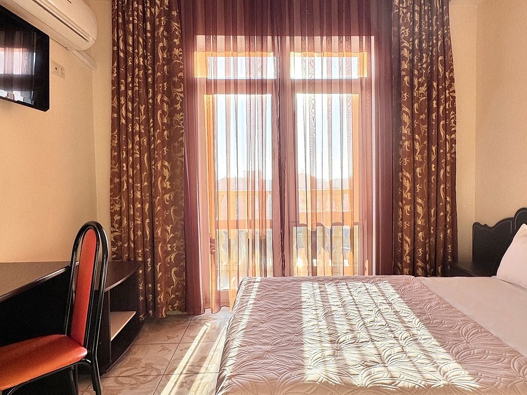 Номер оснащен: двуспальная кровать (140*200), прикроватные тумбочки, туалетный столик, шкаф-купе, сейф, ТВ, кондиционер, мини-холодильник. Ванная комната: душ, туалет, раковина, зеркало, фен. Балкон с видом на территорию отеля. На балконе имеется летняя мебель. Окна в номере открываются.
