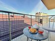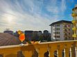 Балкон с видом на крышу соседнего здания. На балконе имеется летняя мебель для отдыха. Окна в номере открываются.