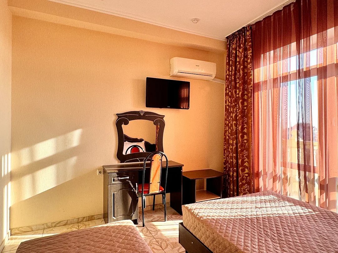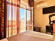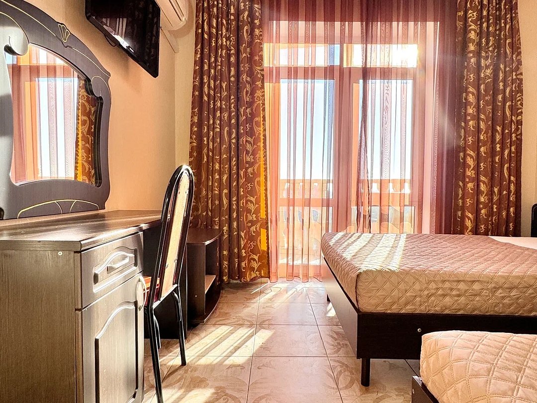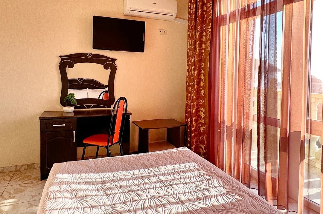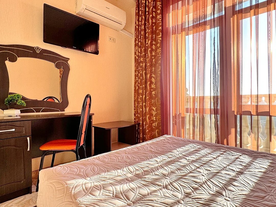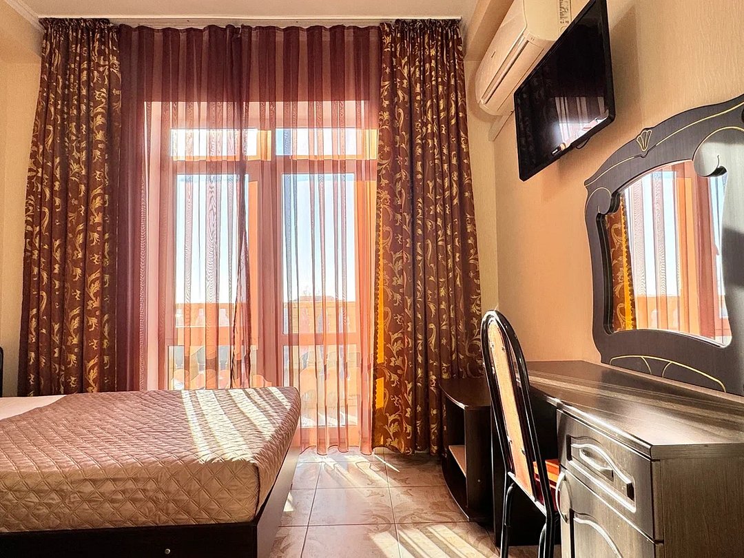 Номер оснащен: двуспальная кровать (140*200), прикроватные тумбочки, туалетный столик, шкаф-купе, сейф, ТВ, кондиционер, мини-холодильник. Ванная комната: душ, туалет, раковина, зеркало, фен. Балкон с видом на море. На балконе имеется летняя мебель для отдыха. Окна в номере открываются.
