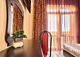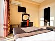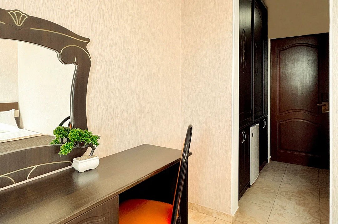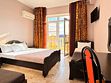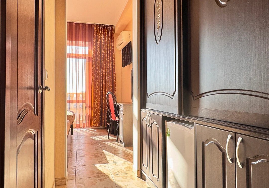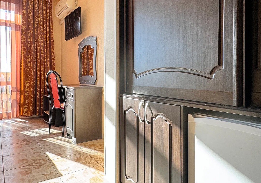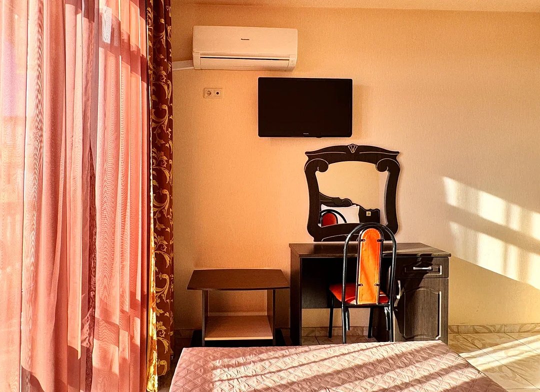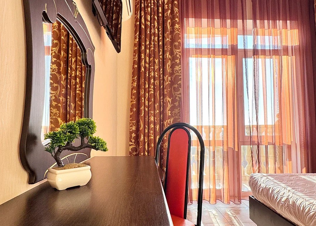 Номер оснащен: двуспальная кровать (140*200), прикроватные тумбочки, туалетный столик, шкаф-купе, сейф, ТВ, кондиционер, мини-холодильник. Ванная комната: душ, туалет, раковина, зеркало, фен. Балкон с видом на море. На балконе имеется летняя мебель для отдыха. Окна в номере открываются.