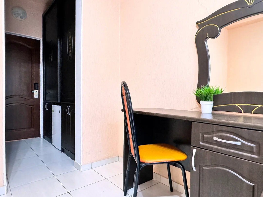 Номер оснащен: двуспальная кровать (140*200), прикроватные тумбочки, туалетный столик, шкаф-купе, сейф, ТВ, кондиционер, мини-холодильник. Ванная комната: душ, туалет, раковина, зеркало, фен.