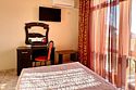 Номер оснащен: двуспальная кровать (140*200), односпальная кровать, прикроватные тумбочки, туалетный столик, шкаф-купе, сейф, ТВ, кондиционер, мини-холодильник. Ванная комната: душ, туалет, раковина, зеркало, фен. Балкон с видом на море. На балконе имеется летняя мебель для отдыха.