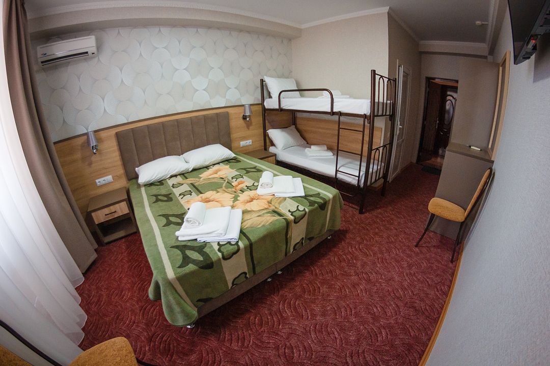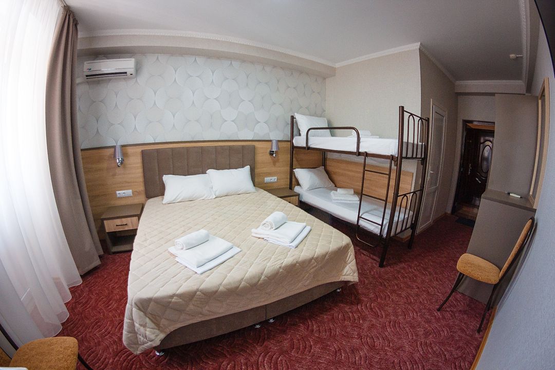 Комфортный однокомнатный номер с большой двуспальной кроватью, двухъярусной кроватью и раскладной кроватью.