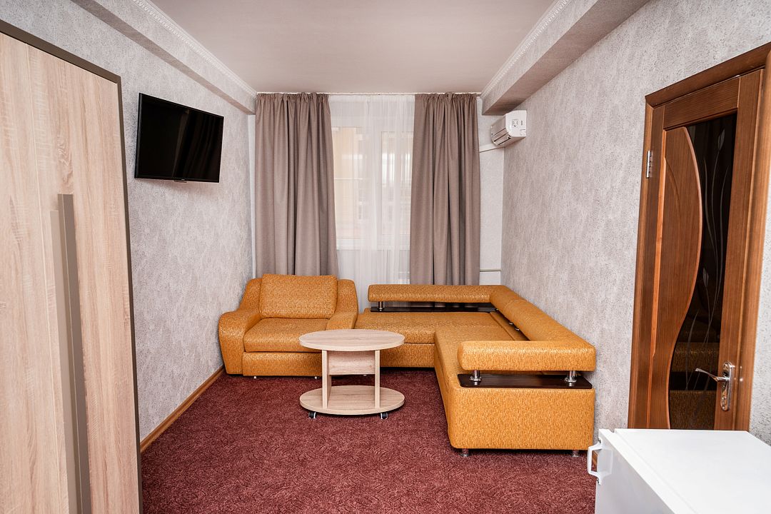 Уютный однокомнатный номер с одной двуспальной или двумя односпальными кроватями и раскладным диваном.