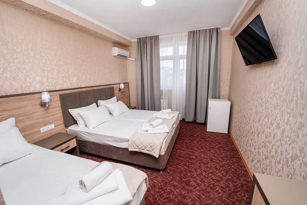 Пятиэтажный корпус возвышается на уютной благоустроенной территории, расположенной всего в 800 метрах от моря. В распоряжении гостей 60 номеров, каждый из которых оснащен индивидуальным санузлом, душем и необходимой техникой: в комнатах есть телевизор, холодильник, кондиционер.