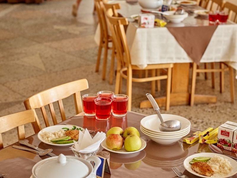Ежедневно к столу подается лечебно-столовая минеральная вода «Горячий Ключ», добываемая из природного источника, что является естественной профилактикой хронических заболеваний печени и желудочно-кишечного тракта.