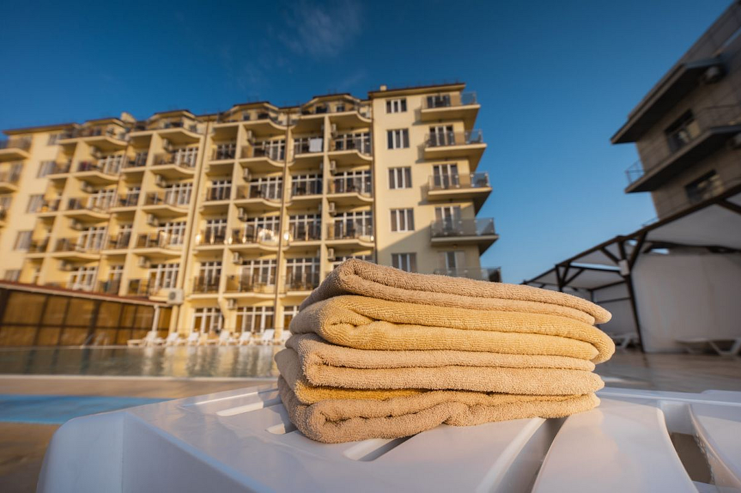 Самолетом до аэропорта г. Анапы, далее на маршрутном такси №113 до остановки «Аквапарк», далее на маршрутном такси №120 до остановки «Паралия», далее 420 м до отеля.