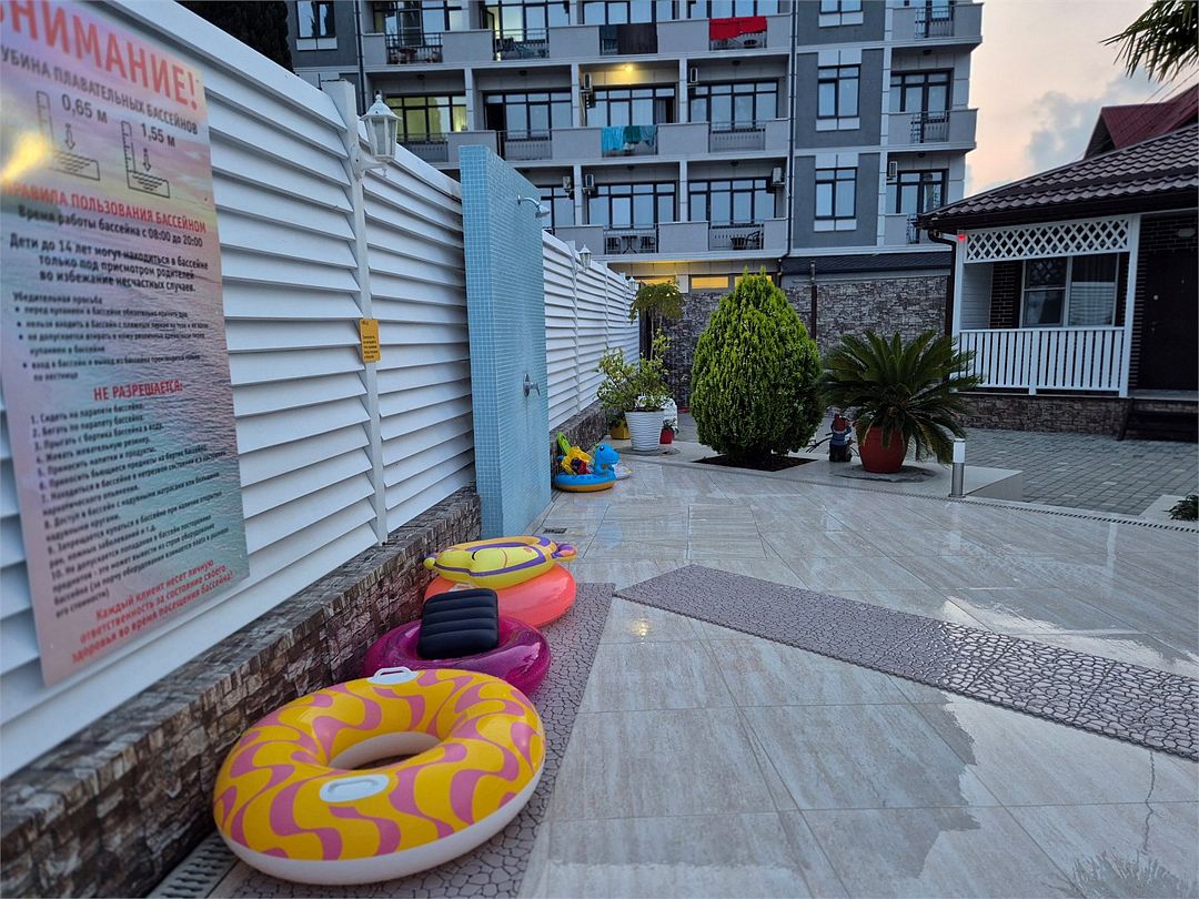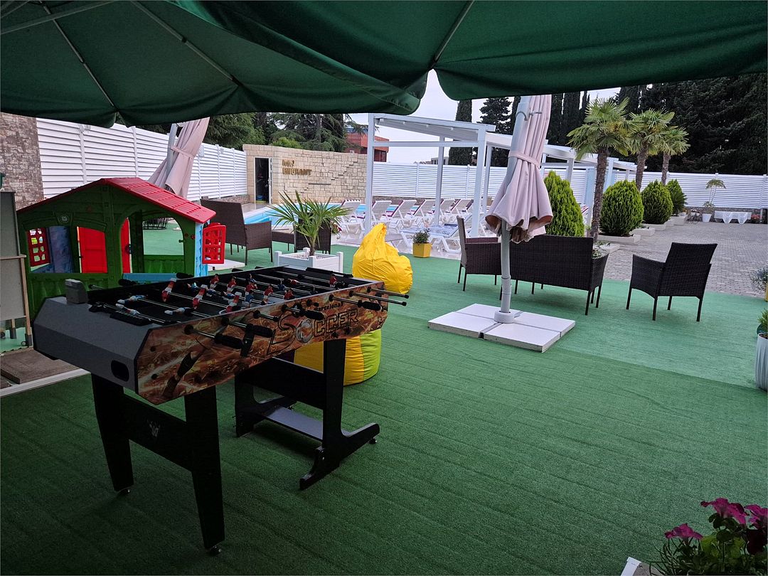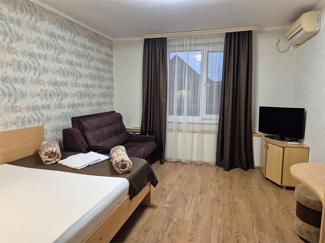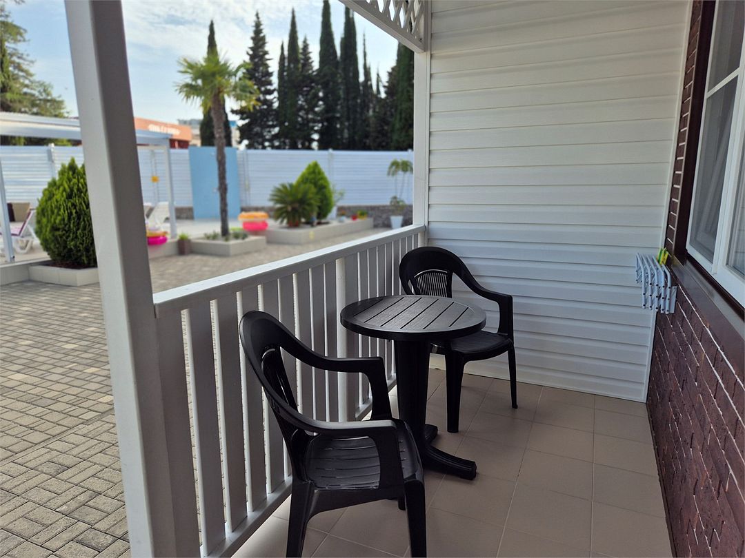 Номера котеджного типа распологаются в одноэтажном здании. У каждого свой отдельный вход и балкон. В номере двуспальная кровать и диван раскладной, тв же, кондиционер, сейф, мини-холодильник, чайник, фен, душ и туалет в номере, туалетные принадлежности. Бутылированная вода при заезде. На балконе столик со стульями. На территории бассейн с отдельной детской и взрослой зоной, зона отдыха, детская площадка и зона барбекю.Услуги и удобства