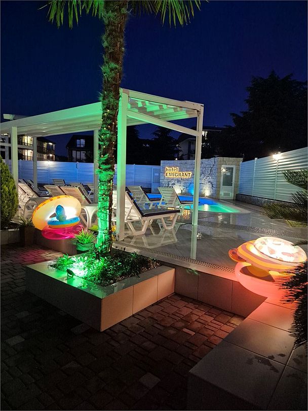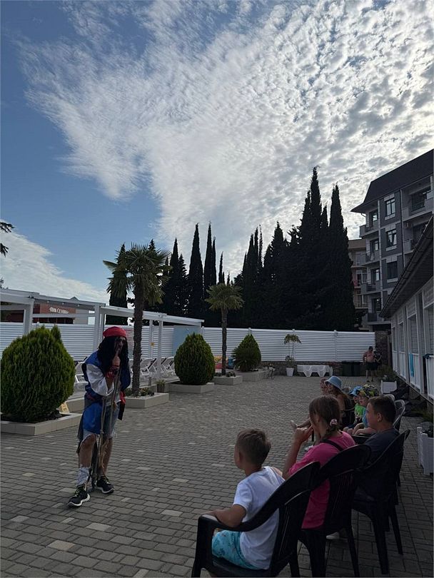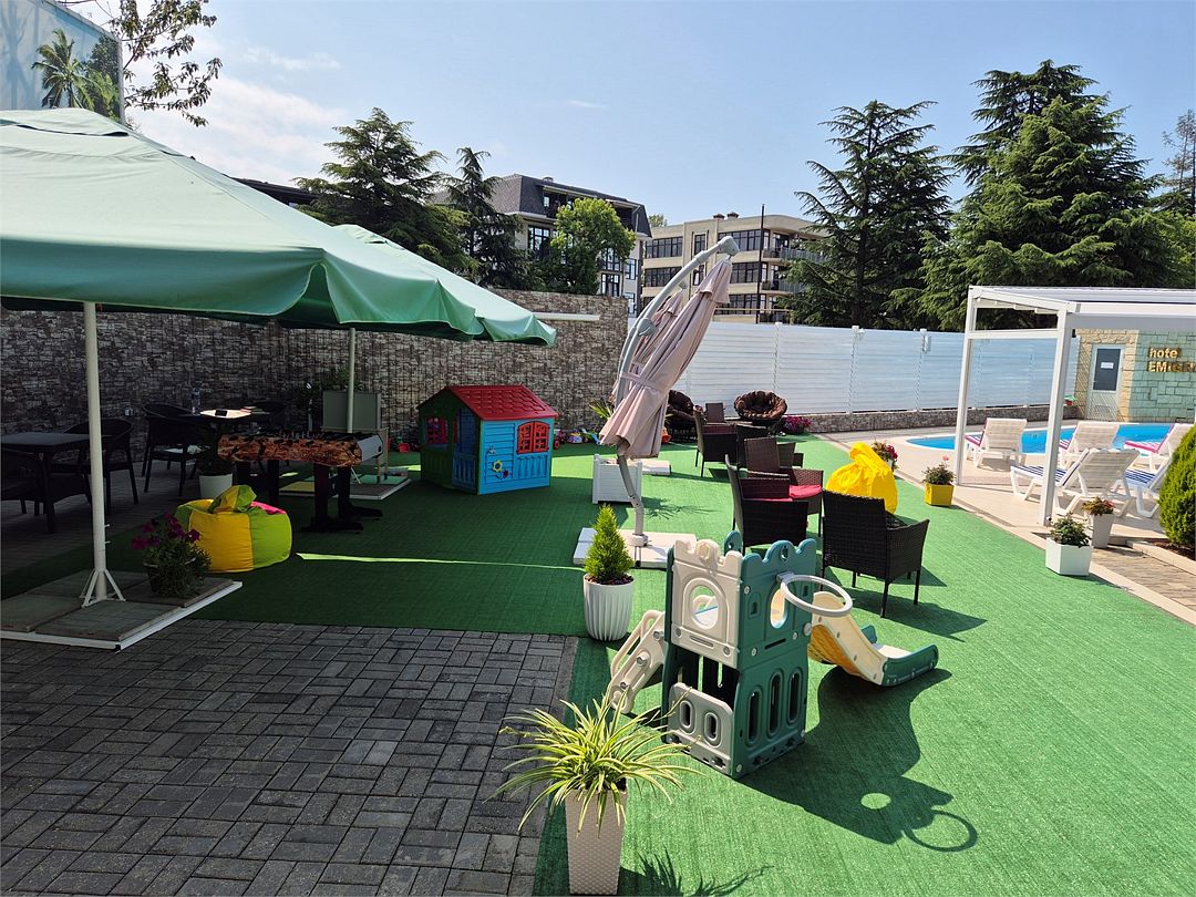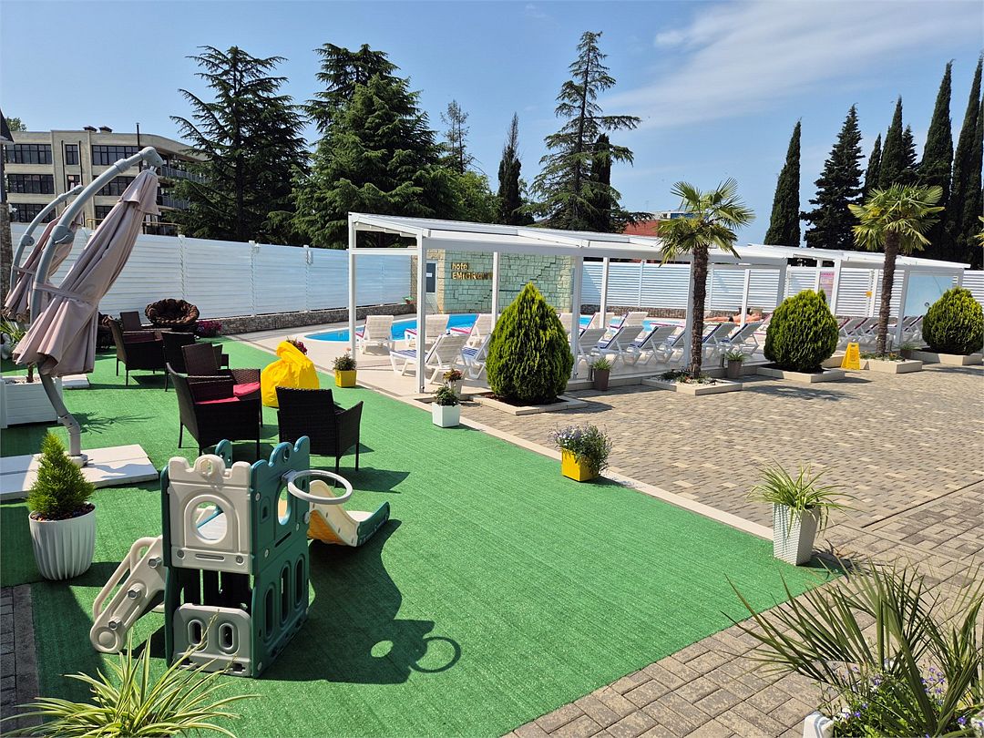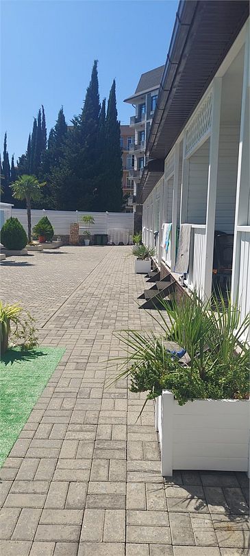 Номера котеджного типа распологаются в одноэтажном здании. У каждого свой отдельный вход и балкон. В номере двуспальная кровать и диван раскладной, тв же, кондиционер, сейф, мини-холодильник, чайник, фен, душ и туалет в номере, туалетные принадлежности. Бутылированная вода при заезде. На балконе столик со стульями. На территории бассейн с отдельной детской и взрослой зоной, зона отдыха, детская площадка и зона барбекю.Услуги и удобства