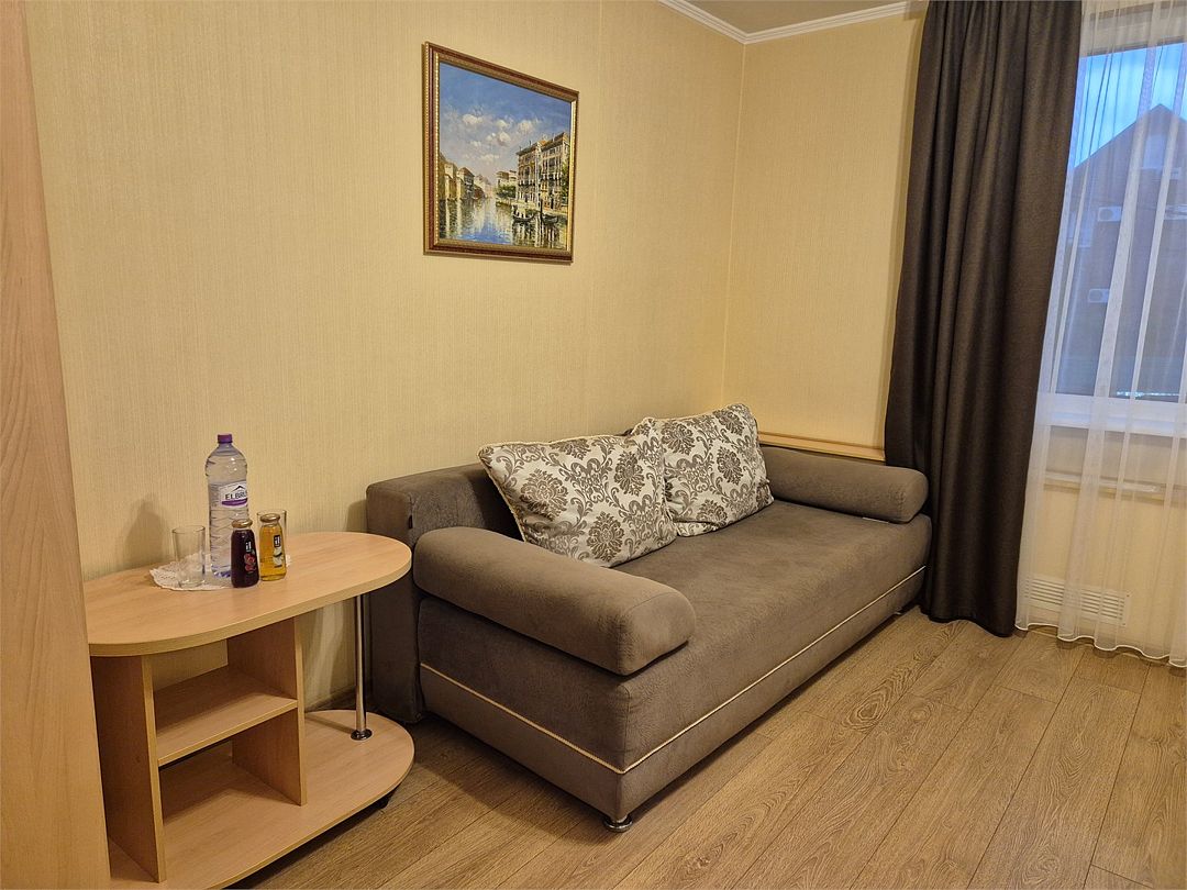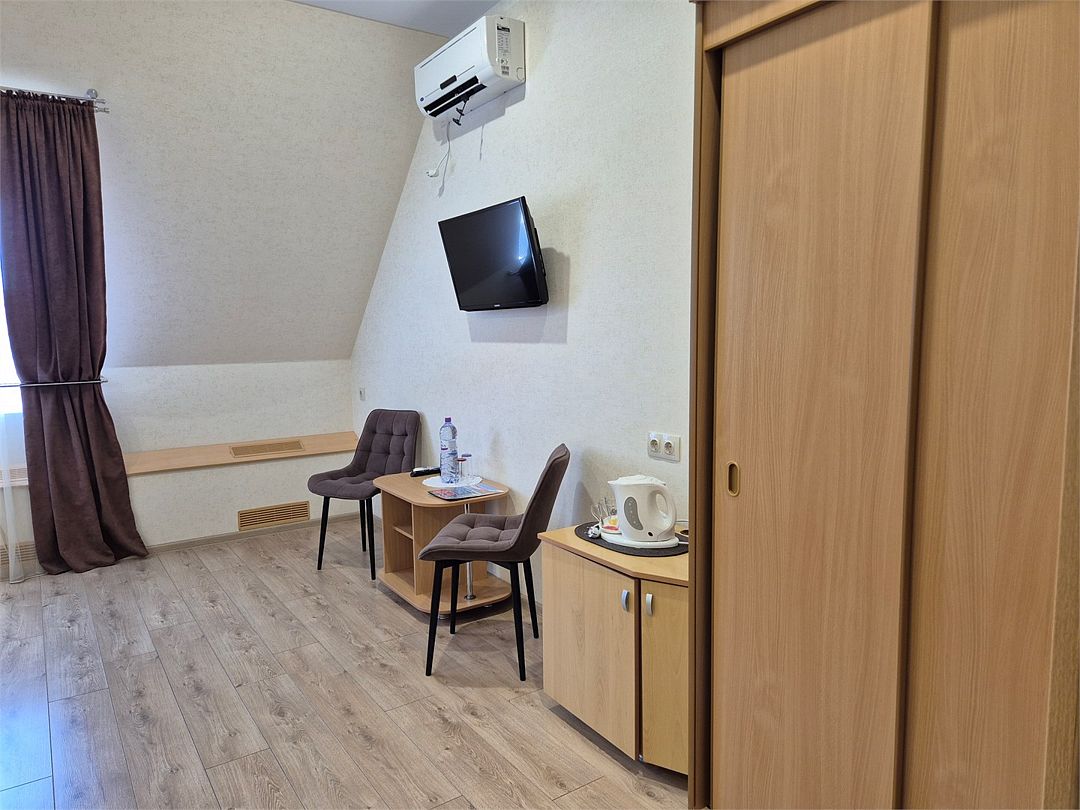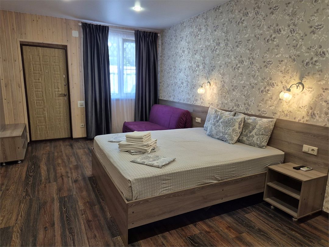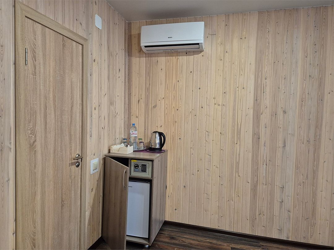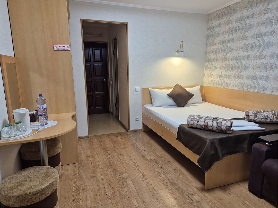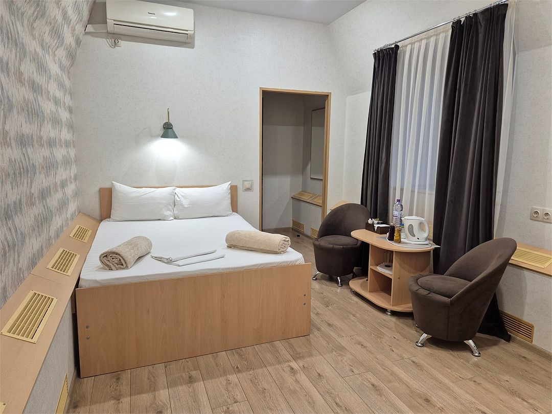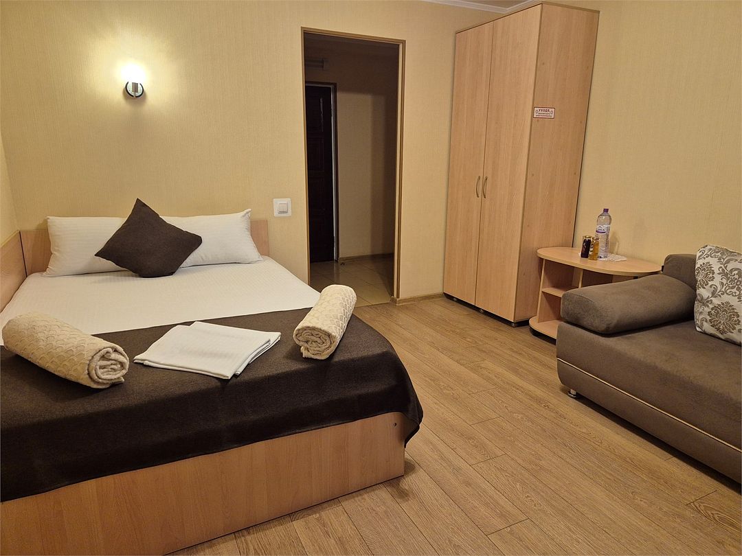 В номере: двухспальная кровать, диванчик для отдыха, столик с двумя креслами, чайник с набором для чая, сейф, мини-холодильник, тв, тумба Ванная комната: душевая кабина, санузел, туалетные принадлежности, тапочки, полотенцесушитель. При заезде бутилированная водаУслуги и удобства