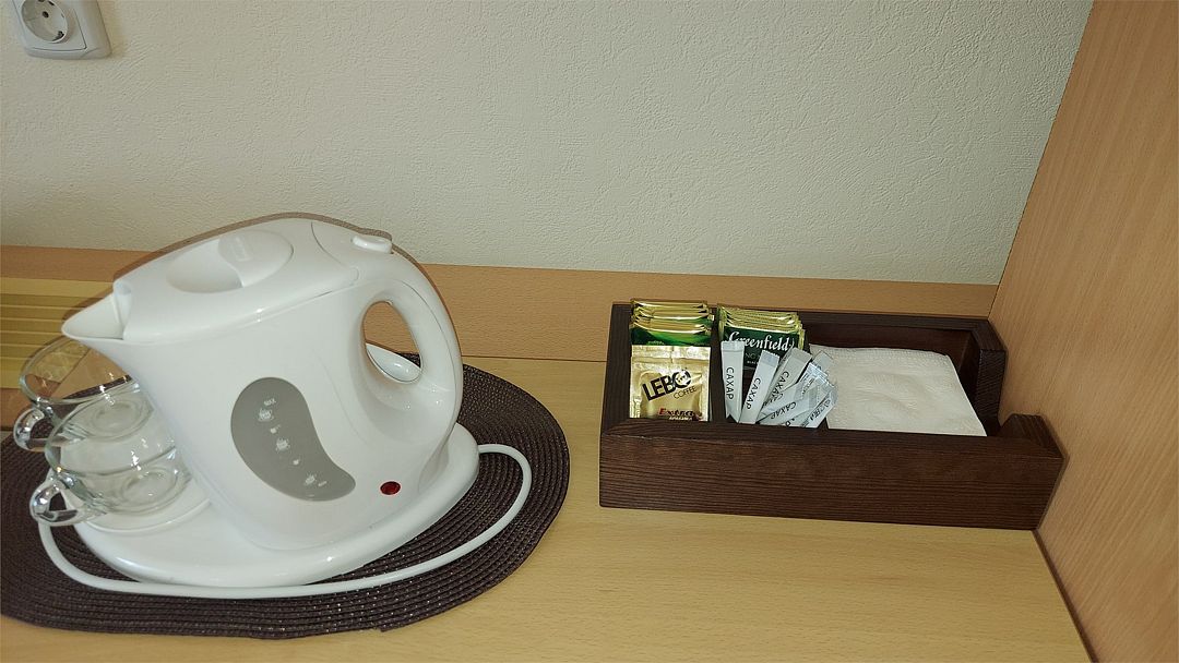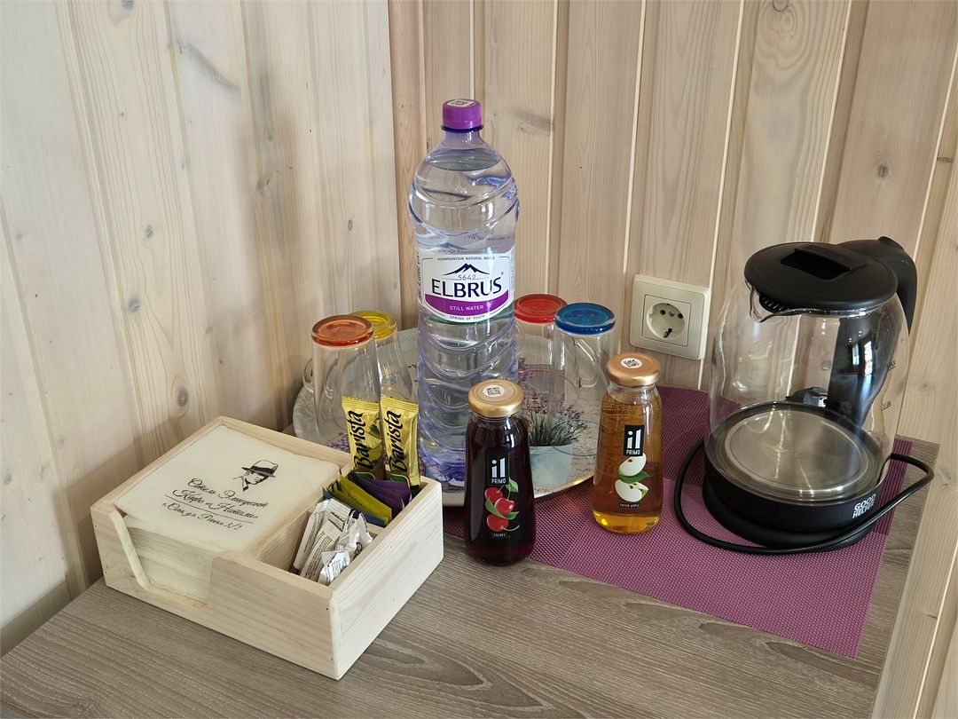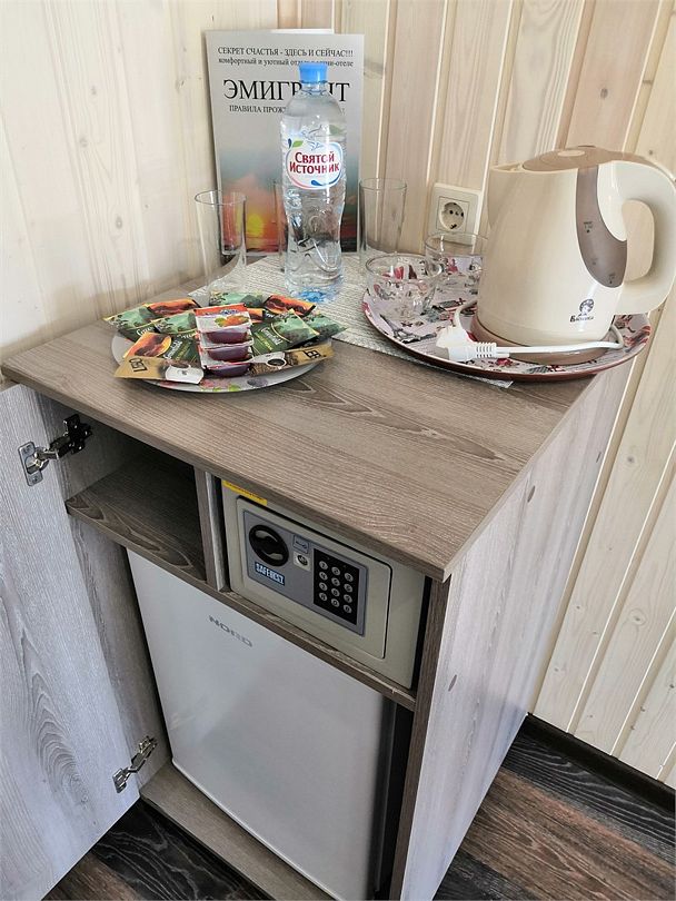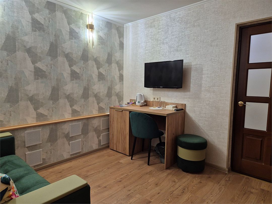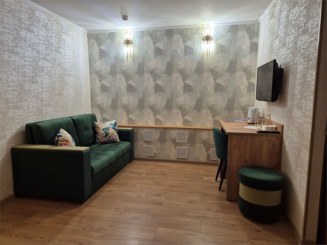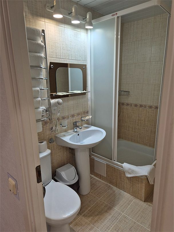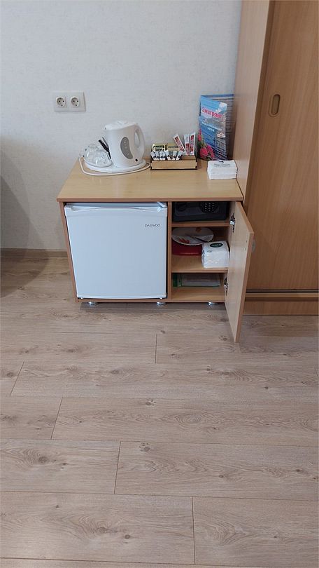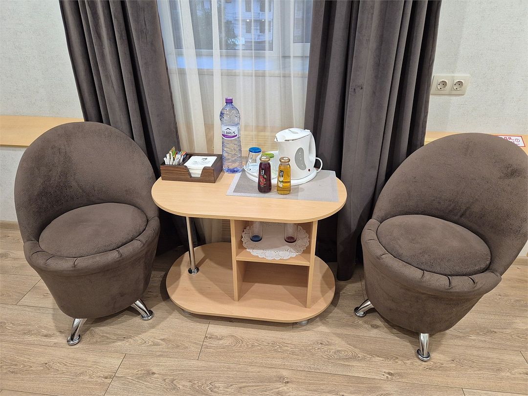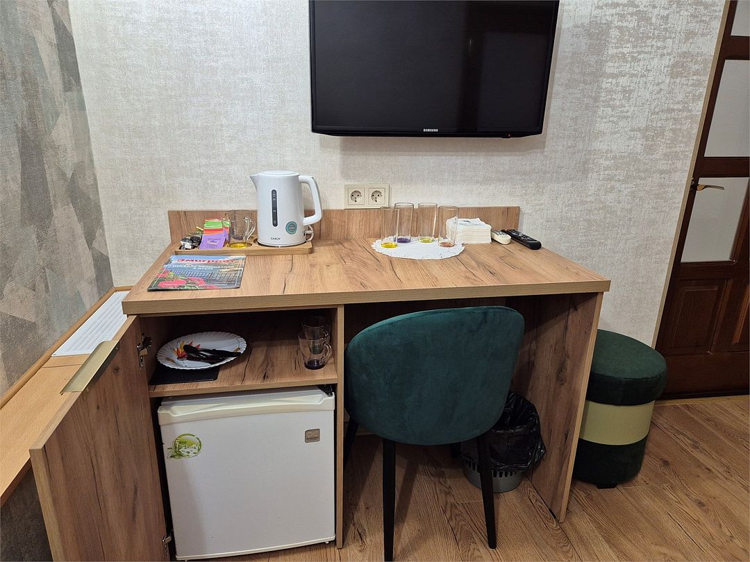 В номере: двухспальная кровать, диванчик для отдыха, столик с двумя креслами, чайник с набором для чая, сейф, мини-холодильник, тв, тумба Ванная комната: душевая кабина, санузел, туалетные принадлежности, тапочки, полотенцесушитель. При заезде бутилированная водаУслуги и удобства