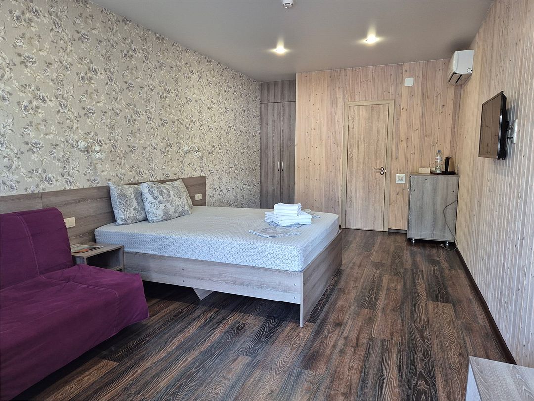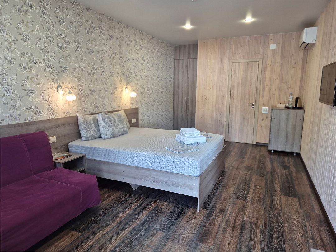 Wi-Fi, светильник, фен, утюг, душевая кабина, санузел, банные принадлежности, банные полотенца, гигиенические средства, косметические средства, двуспальная кровать, шкаф для одежды, вешалки, зеркало, пуфики, обслуживание номеров, сейф, унитаз, раковина, питьевая вода, отопление, вид во двор, ламинат, стаканы, тумба, туалетные средства, сплит-система, сушилка для белья, диван-кровать, раскладной диван, телевизор с плоским экраном, мини-холодильник, москитная сетка, гостиничная парфюмерия, номер для некурящихВ гостиничном номере