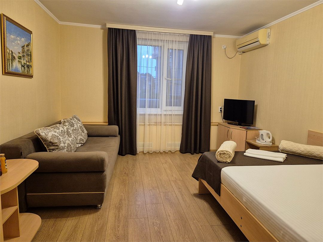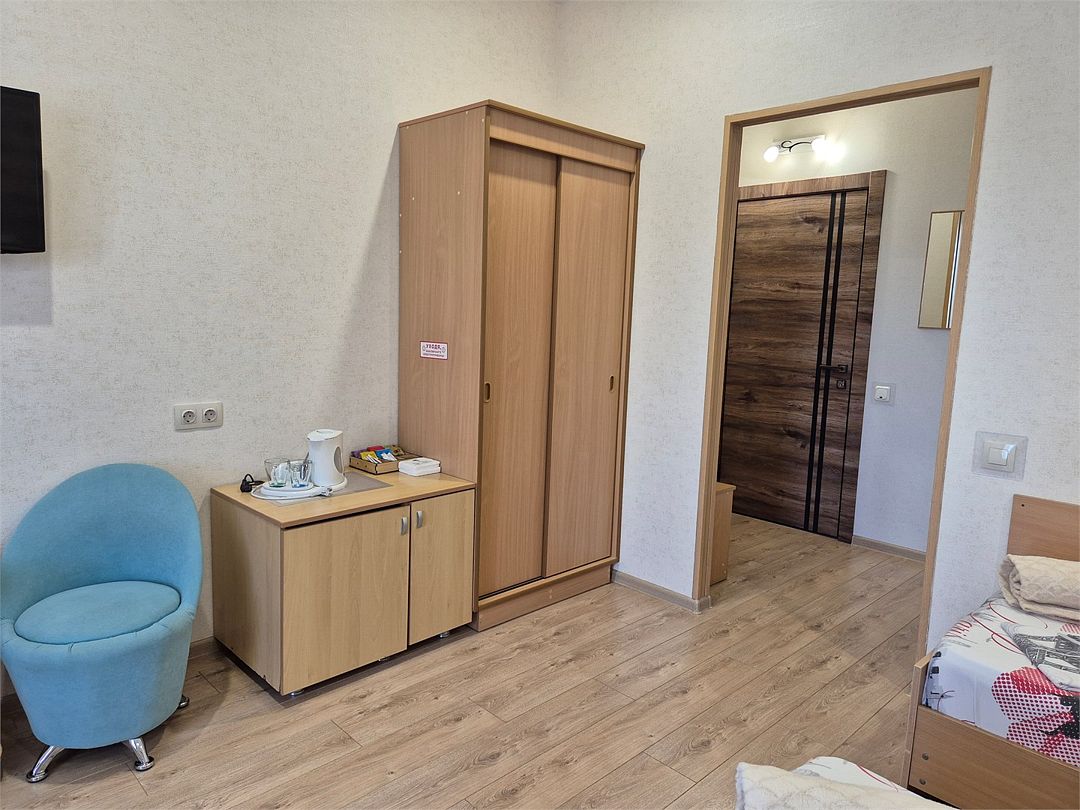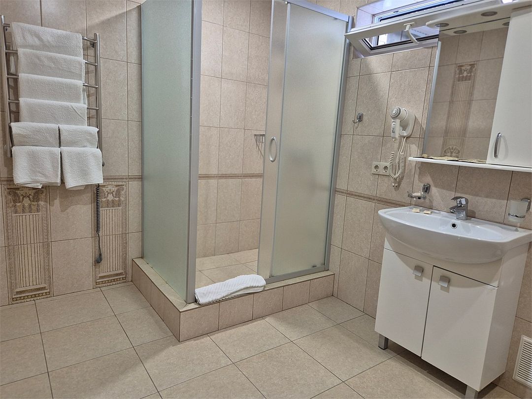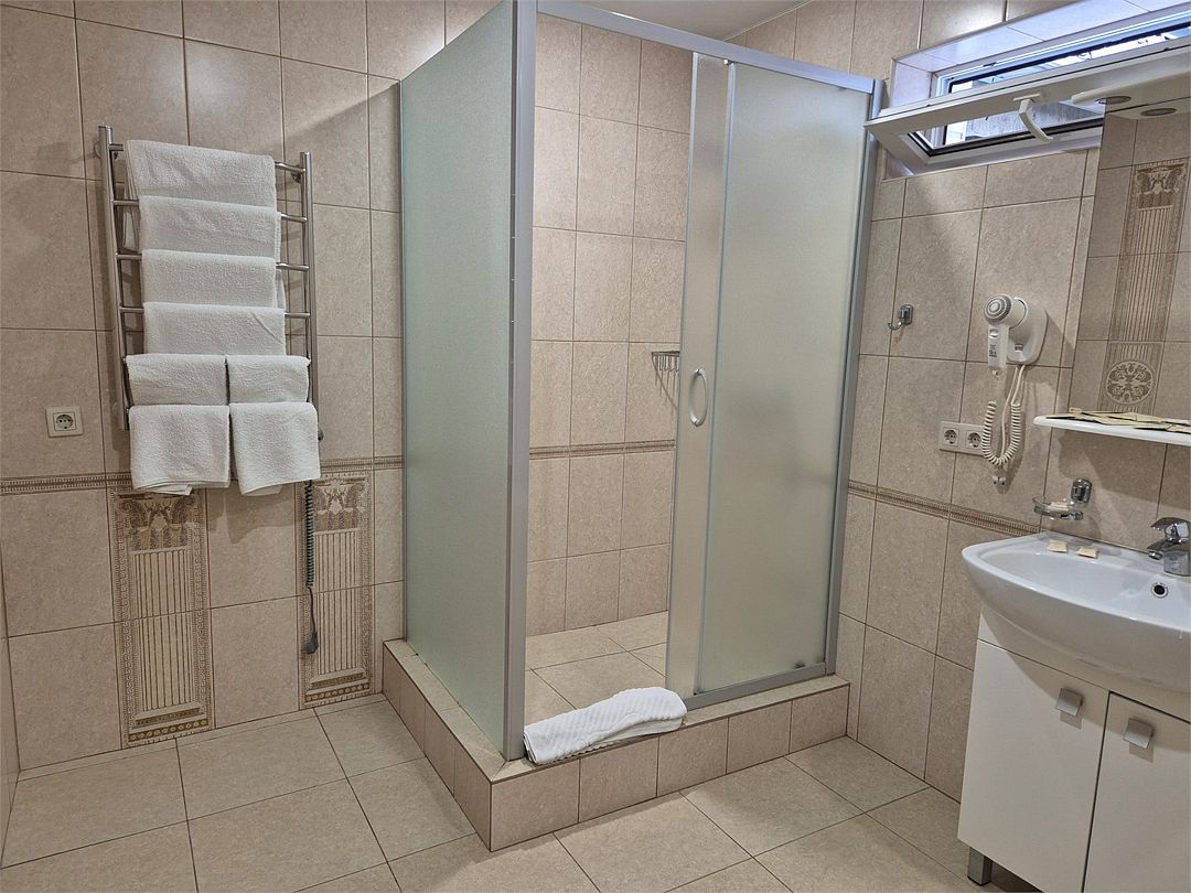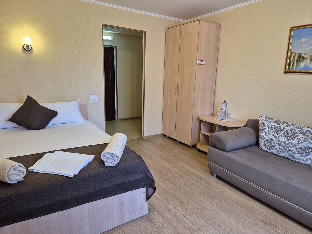 Номер подходит для 3 человек или 3 +1 или 2+2. В номере: две односпальные кровати,раскладной диван, прикроватные тумбочки, телевизор, кондиционер, мини-холодильник, сейф, чайник с набором для чая, платяной шкаф, столик со стульчиками, вешалка с тумбой для обуви, зеркало. Ванная комната — душевая кабина, санузел, фен, туалетные принадлежности, тапочки, полотенцесушитель. При заезде бутилированная водаУслуги и удобства