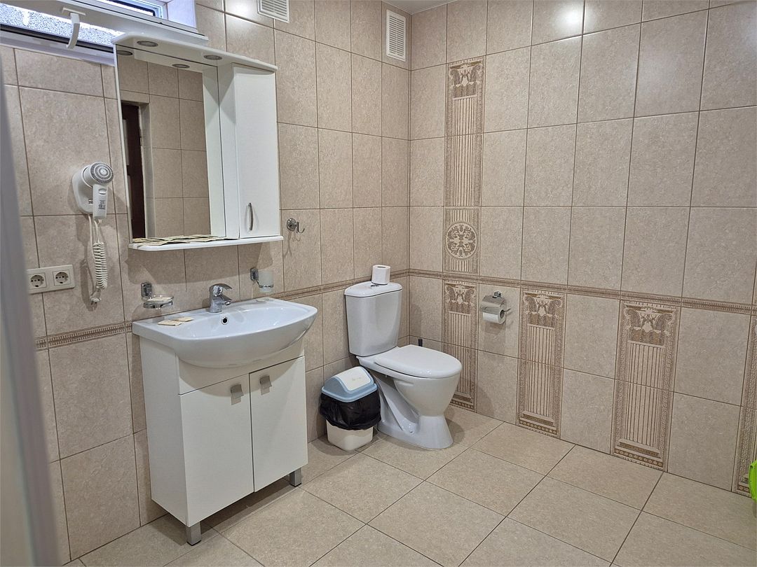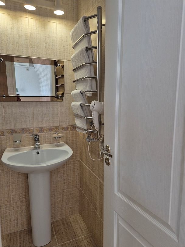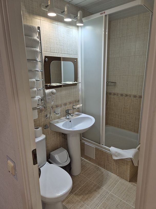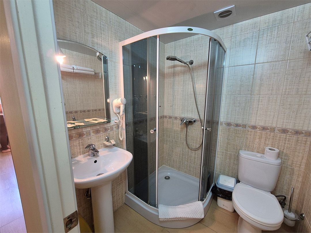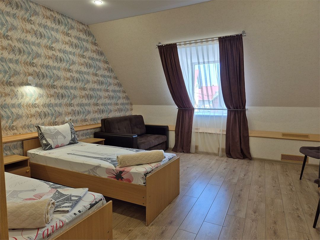 Номер подходит для 3 человек или 3 +1 или 2+2. В номере: две односпальные кровати,раскладной диван, прикроватные тумбочки, телевизор, кондиционер, мини-холодильник, сейф, чайник с набором для чая, платяной шкаф, столик со стульчиками, вешалка с тумбой для обуви, зеркало. Ванная комната — душевая кабина, санузел, фен, туалетные принадлежности, тапочки, полотенцесушитель. При заезде бутилированная водаУслуги и удобства