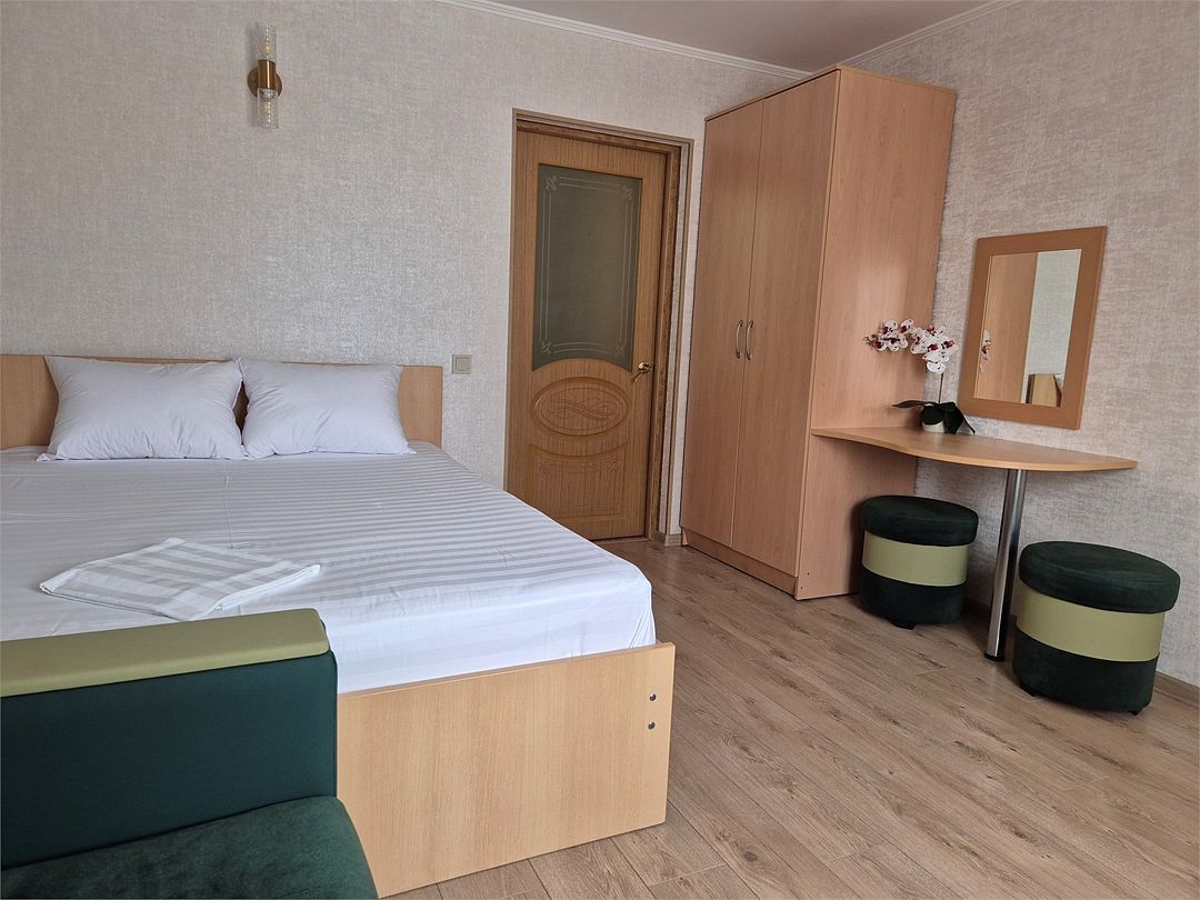 Номер подходит для семейной пары . В номере: двухспальная кровать, диван, зеркало, платяной шкаф, стол, кондиционер, вешалка с тумбой для обуви, телевизор, мини-холодильник, сейф. Ванная комната: душевая кабина, фен, санузел, мыло, туалетные принадлежности. При заезде бутилированная вода.Услуги и удобства