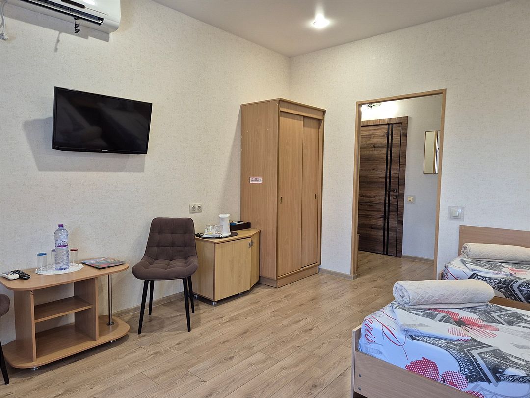 Номер с тремя отдельными местами, либо двухспальная и односпальная кровать на выбор, прихожая и санузел с душевой кабиной ,тв,кондиционер,мебель,чайник,фен.Услуги и удобства