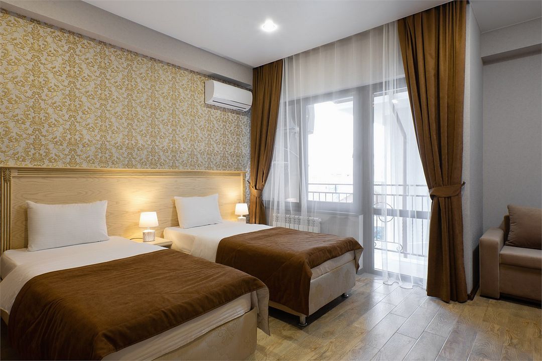 Двухместный номер «Стандарт» с собственным балконом, душевой, с одной или двумя раздельными кроватями с ортопедическими матрасами, раскладным креслом и шкафом-купе. Номер оснащен кондиционером, холодильником, феном, сушилкой для белья, ванными принадлежностями, посудой. В номере реверсивное освещение, электронные замки. В номере можно организовать размещение на дополнительном месте. Из номера открывается вид на другой отель.Услуги и удобства