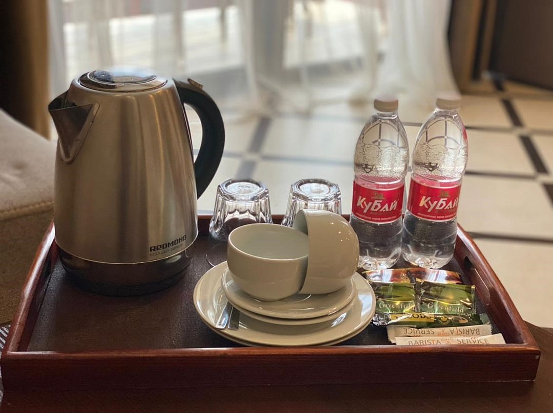 В номере все красиво, есть банные принадлежности, чай, кофе, вода.